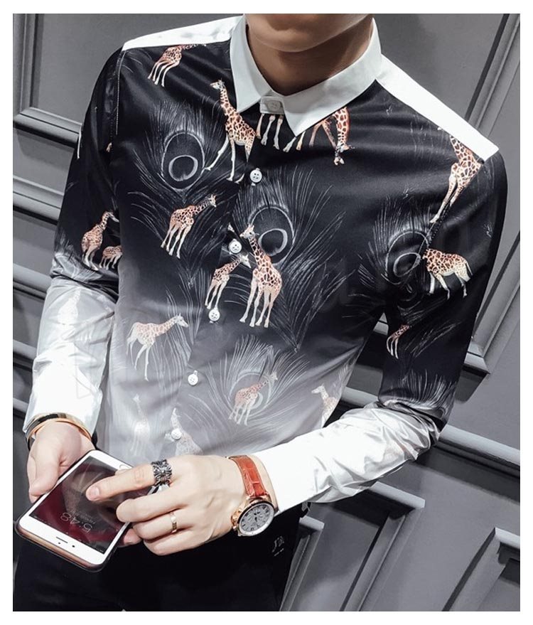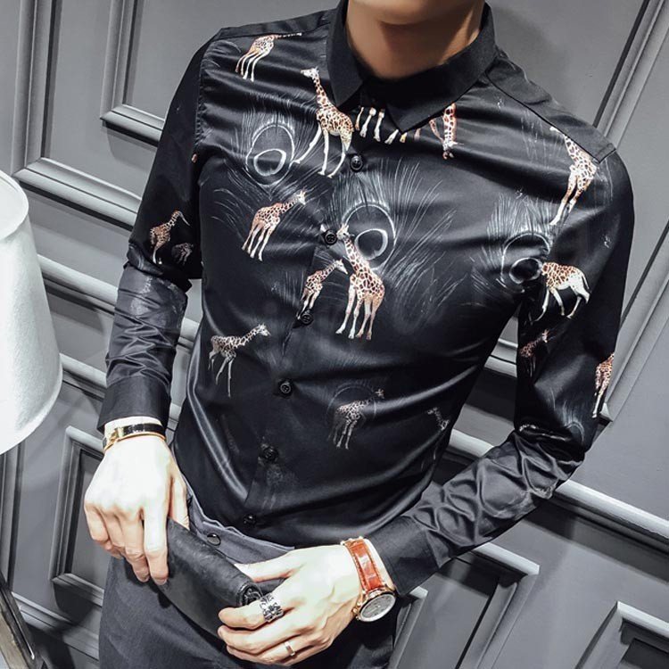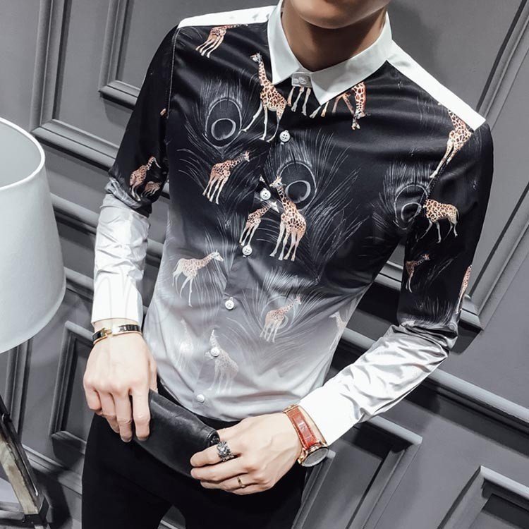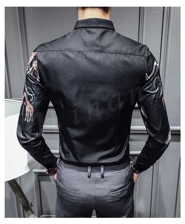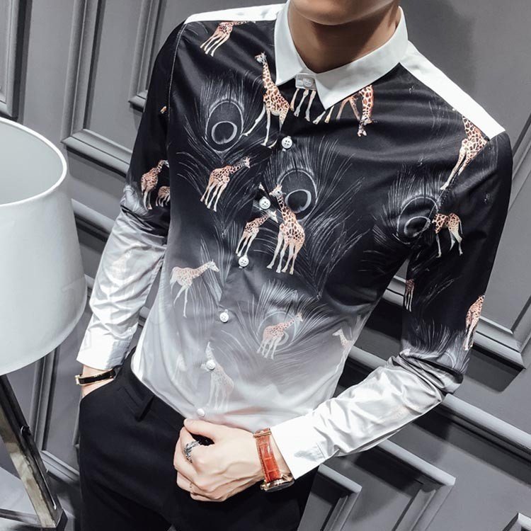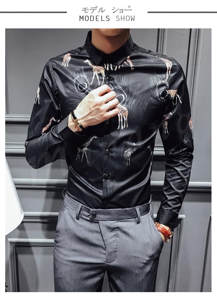 カジュアルシャツ メンズ トップス シャツ Yシャツ カラー切り替え プリント キリン 羽 カジュアル 長袖 メンズファッション