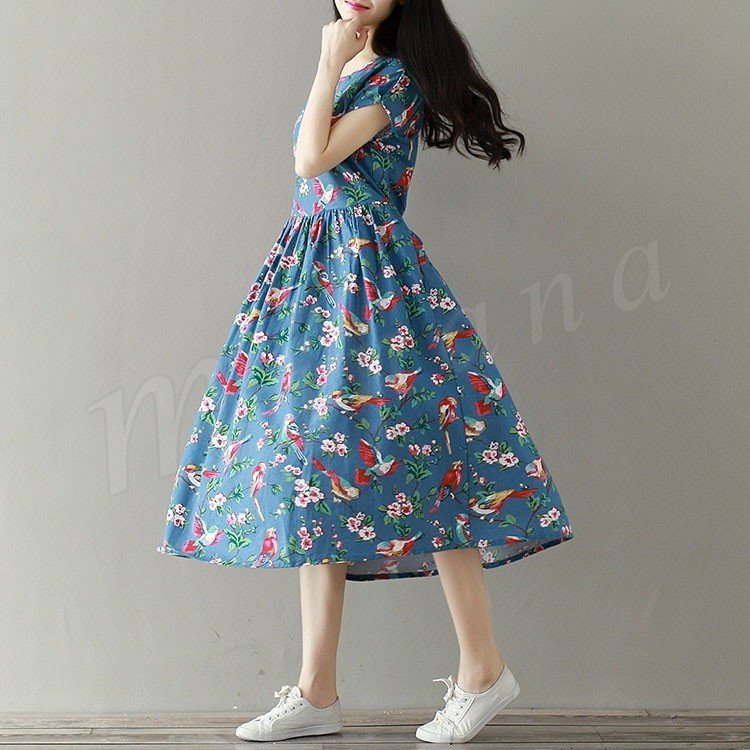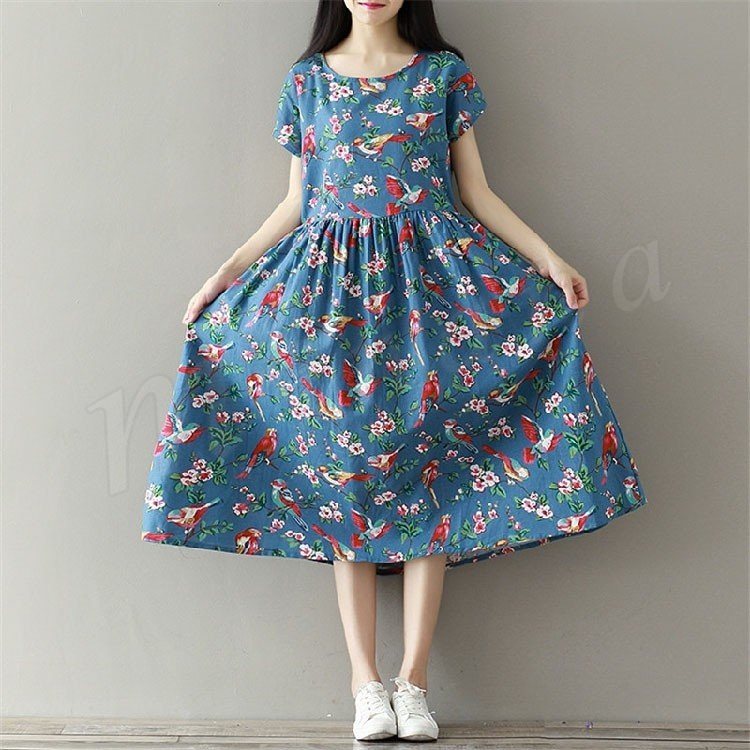 ワンピース夏ワンピース綿麻レディース夏リネンキレイめマキシ丈半袖Aライン大きいサイズ花柄ナチラル服森ガールリネンワンピース