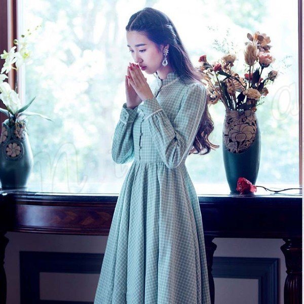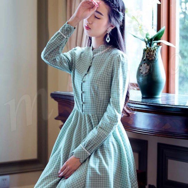 フレアワンピース長袖マキシワンピースレディースお嬢様ワンピ長袖スタンドカラーチェック柄前開きハイウエストレトロ2017春新作優雅
