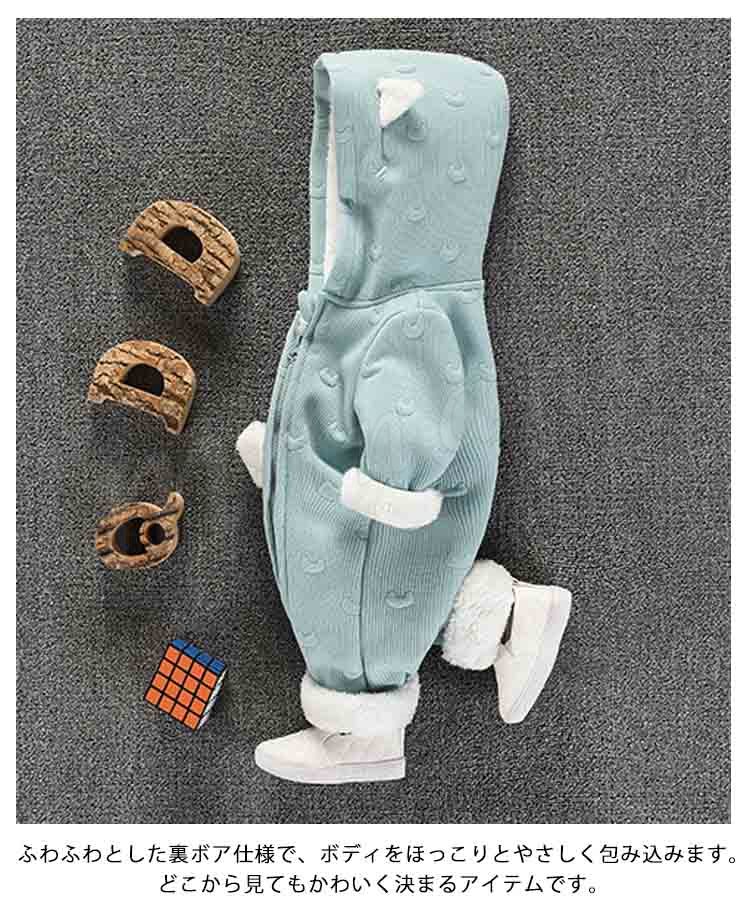 | 小さ目の耳がキュートなネコをイメージしたジャンプスーツです。 ネコを思わせる生地の模様も愛らしいムードを盛り上げるポイント♪ 前がファスナーになっているので着脱も楽ちんです。 ふわふわとした裏ボア仕様で、ボディをほっこりとやさしく包み込みます。 どこから見てもかわいく決まるアイテムです。 | |