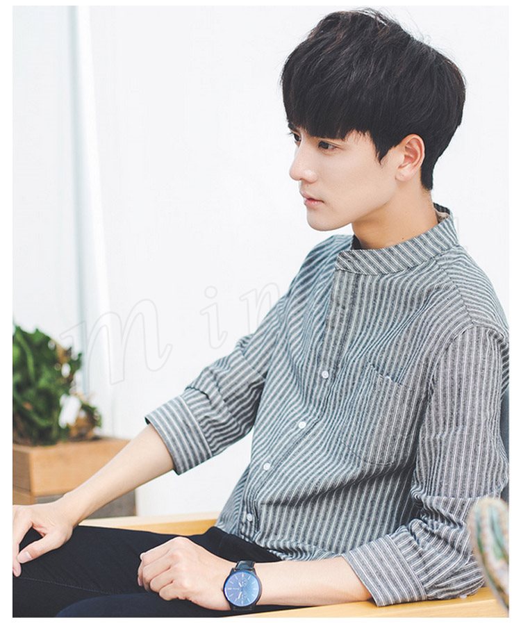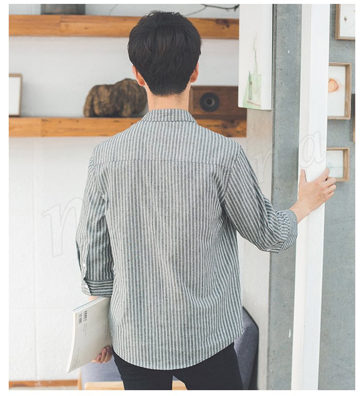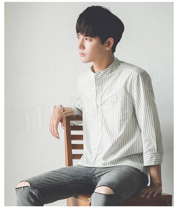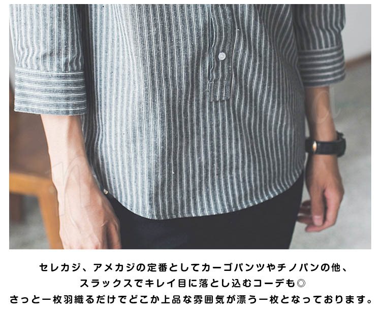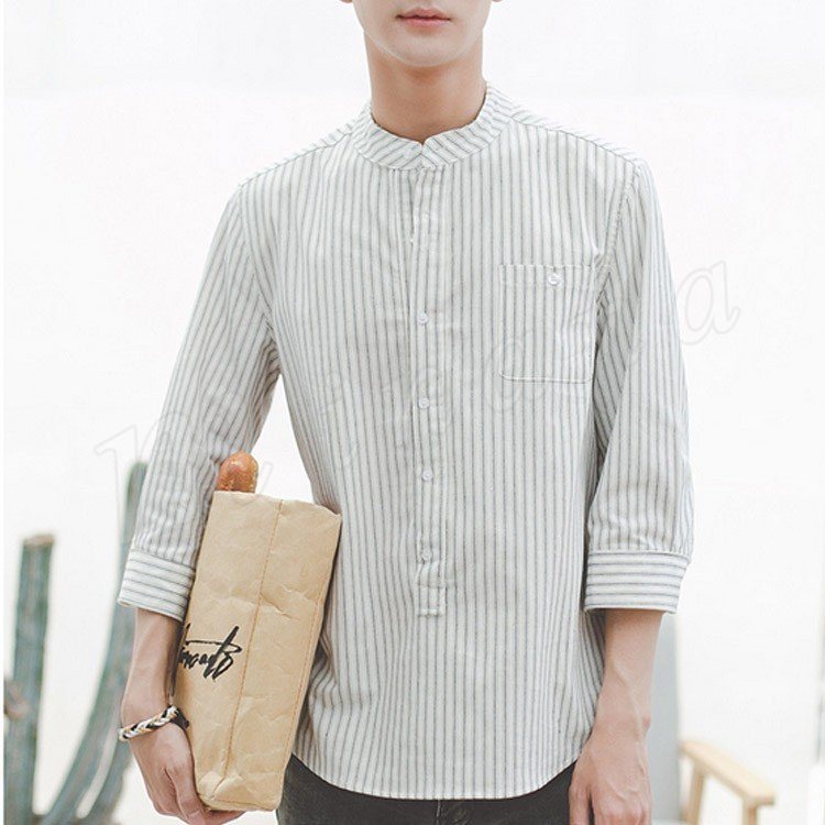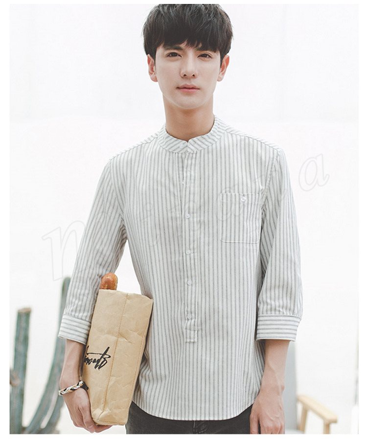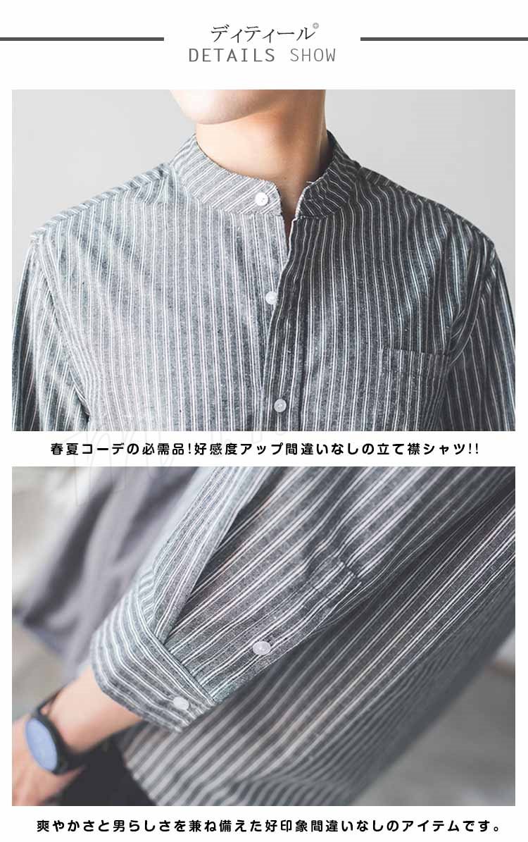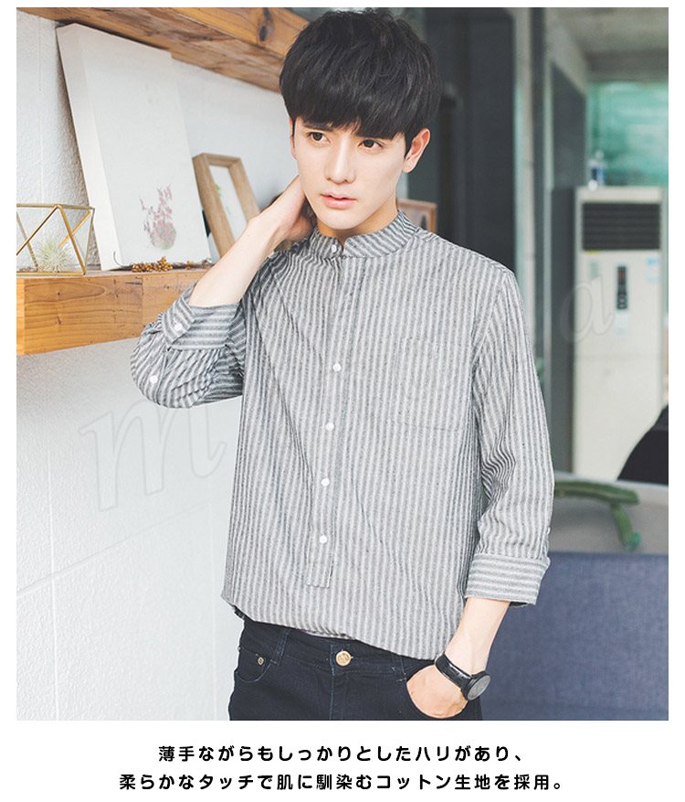 ストライブ柄 シャツ スタンドカラー シャツ 7分袖 和風 立ち襟 バンドカラー シャツ メンズ 薄手 シャツ 無地 カジュアル 春夏 春物