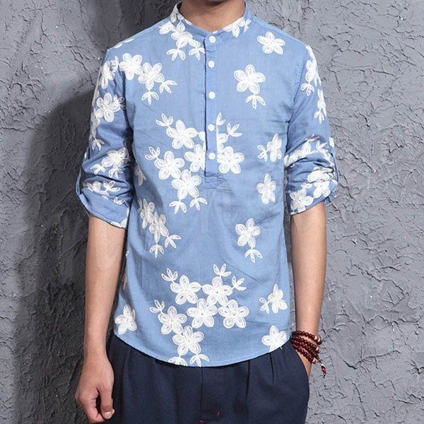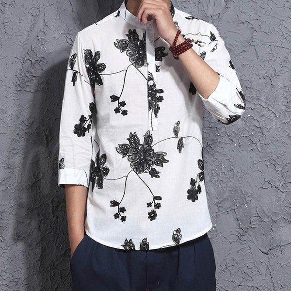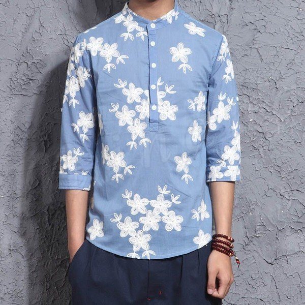 メンズリネンシャツ花柄刺繍麻生地チャイナ風リラックスファッションシンプルクラシックエスニックリネンシャツ通気性バツグン7分袖