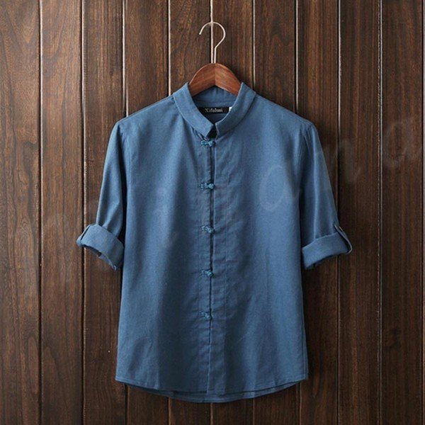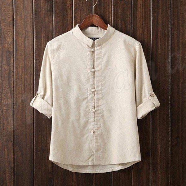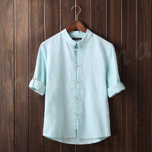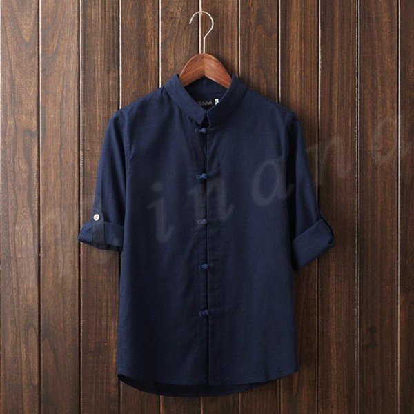 立ち襟シャツリネンシャツ七分袖中国風無地シャツ綿麻ブラウスカジュアルシャツメンズファッション秋新作
