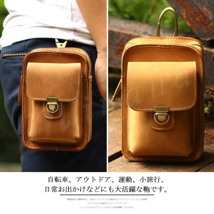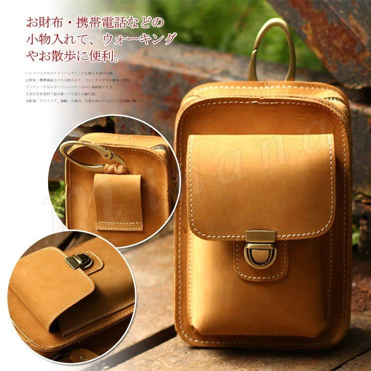 | ハンドバッグやウエストバッグとしても使える2WAY仕様。 お財布・携帯電話などの小物入れて、ウォーキングやお散歩に便利。 アンティークなレザーでコンパクトなのに高級感アリ♪ 丈夫な牛皮素材で毎日使っても安心の耐久性。 自転車、アウトドア、運動、小旅行、日常お出かけなどにも大活躍な鞄です。 | |