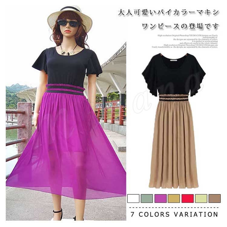 | 大人可愛いバイカラーマキシワンピースの登場です。 ベーシックカラーからトレンドカラーまで全7色展開。 トップス部分はストレッチある素材でストレスフリー。 スカート部分は軽くしなやかなシフォン素材で清涼感のある感じです。 ハイウエストがギャザーゴム入りでくびれラインも演出。 ふくらはぎにかかるロング丈なので気になる部分をしっかりカバー。 広がったフレアスリーブも腕カバー効果を演出。 今季にぜひおすすめな半袖ワンピース。 | |