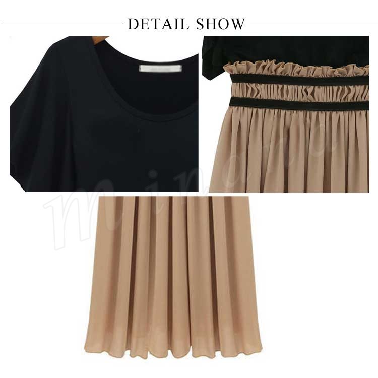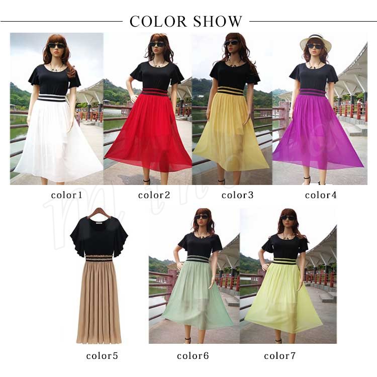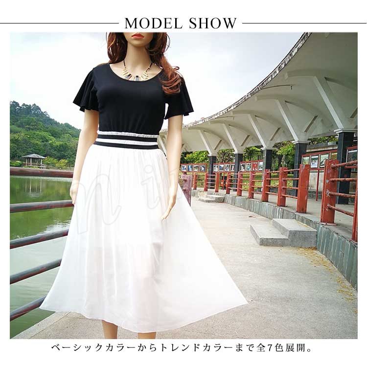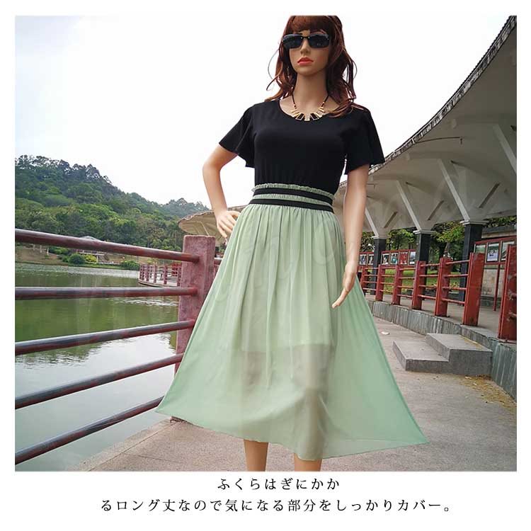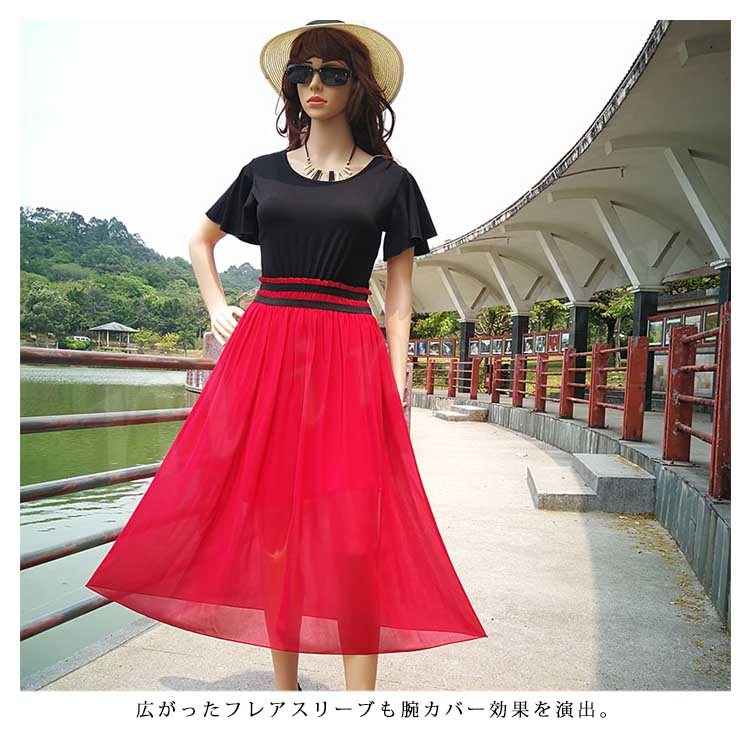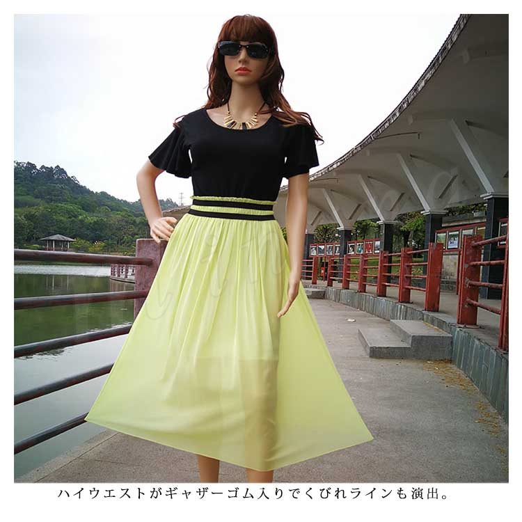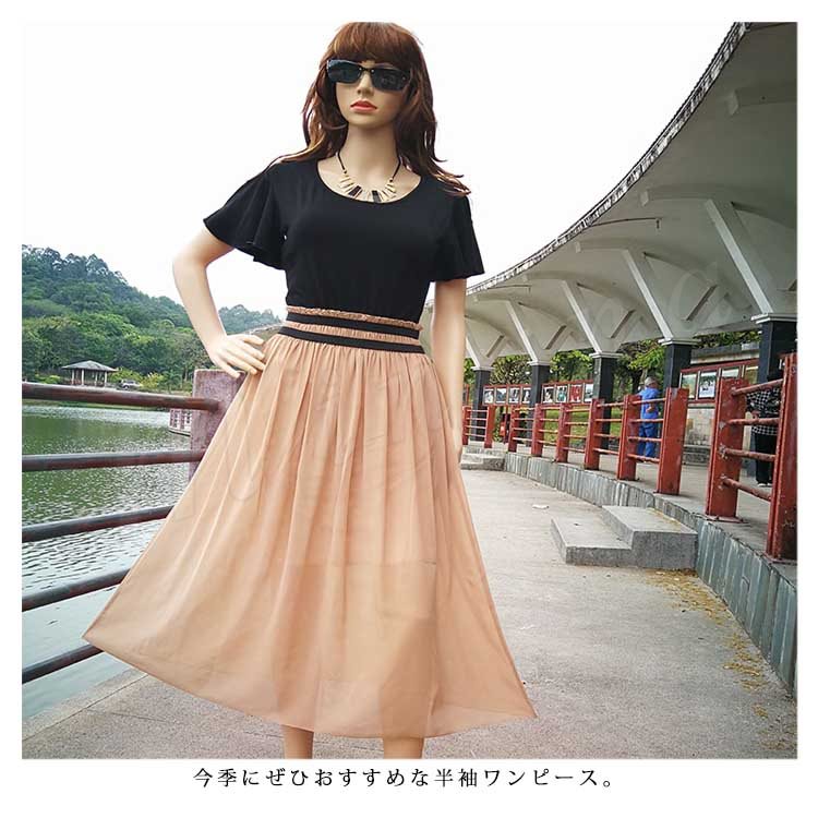 全7色!ドッキングワンピース レディース ワンピース フリル袖 半袖 シフォンワンピース 異素材 切替 ミディアム 夏 大人 可愛い