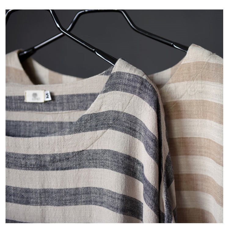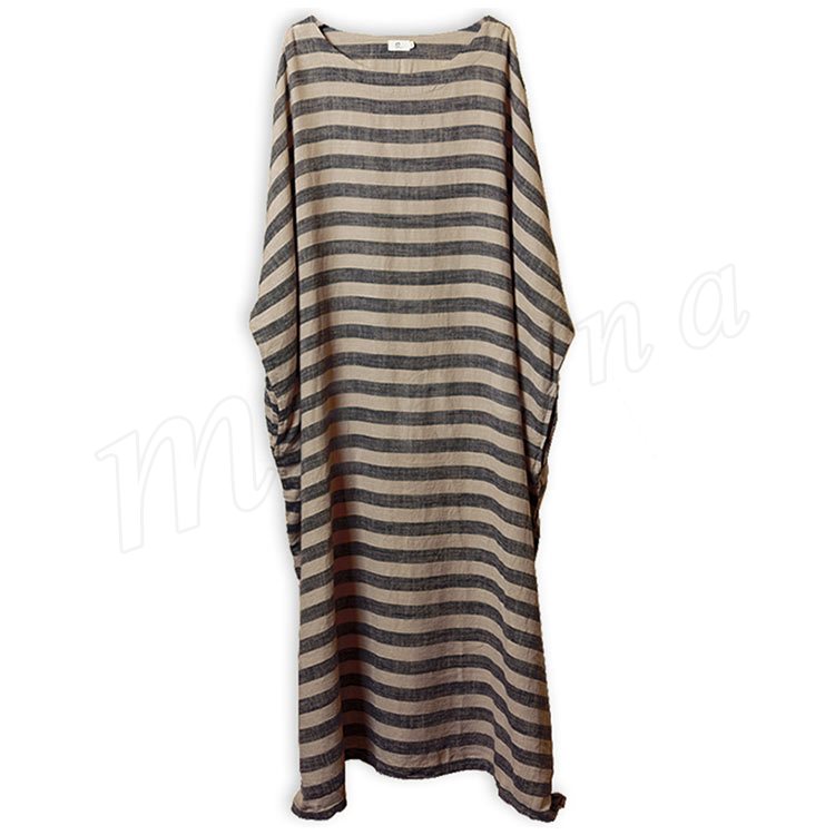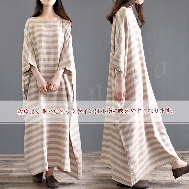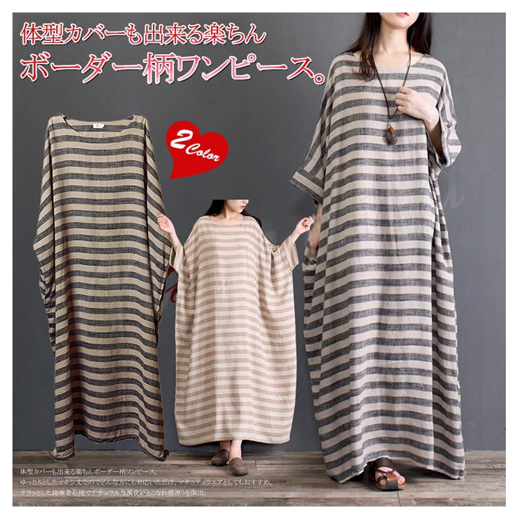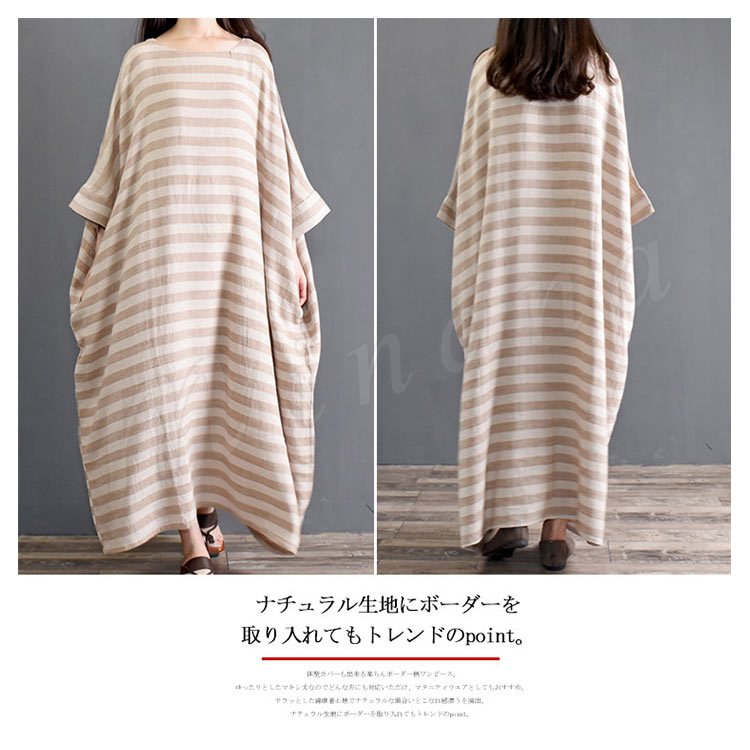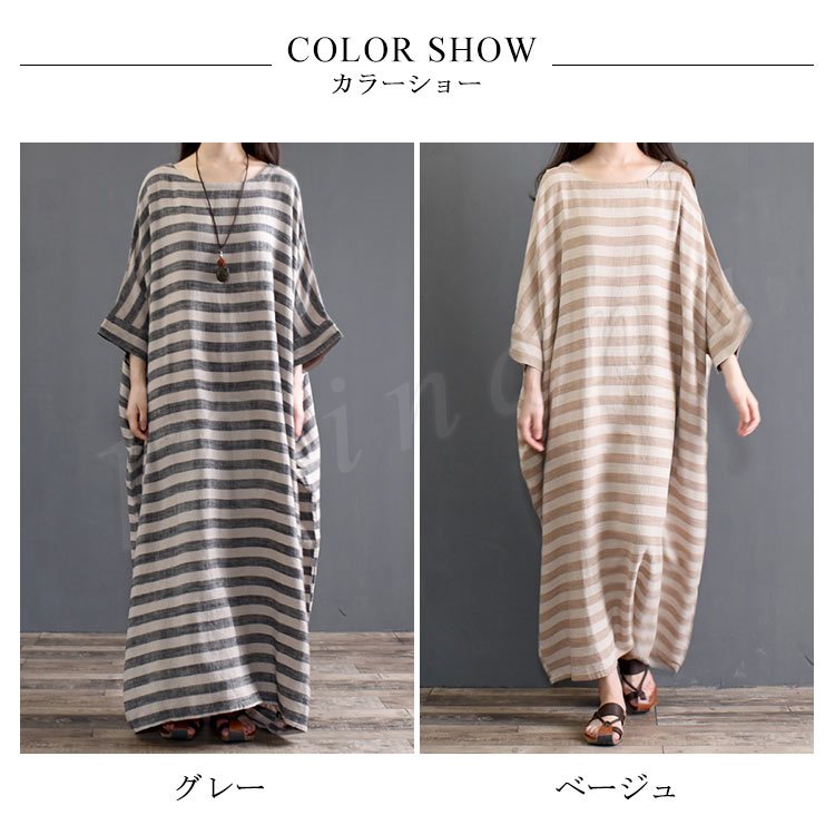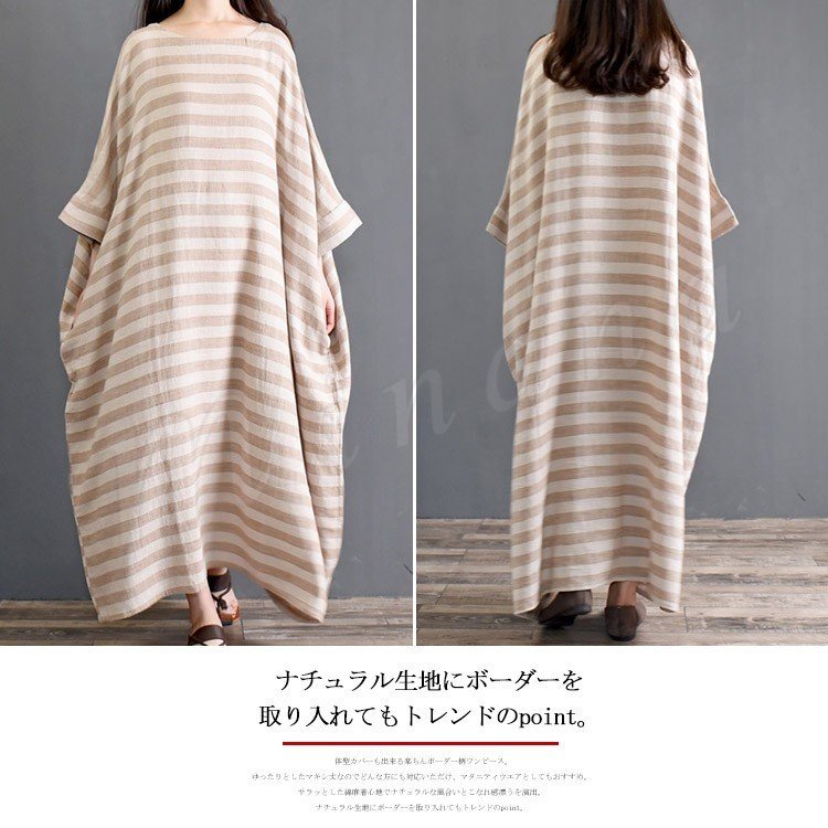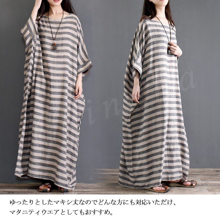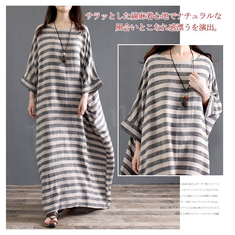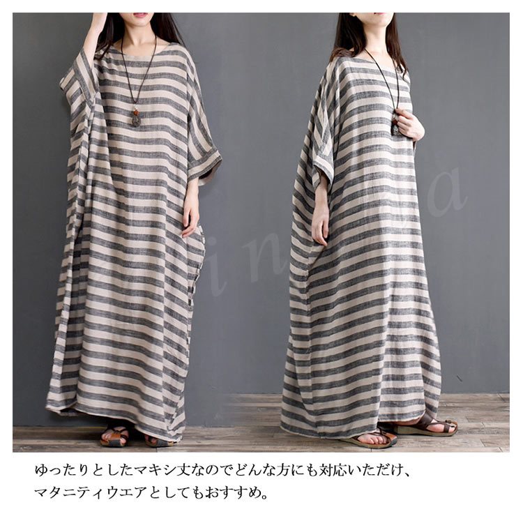 ロングガウンワンピース リネンワンピース オーバーサイズ マキシ丈ワンピース 綿麻 ワンピース マキシ丈 ゆったり ボーダー柄 ガウン トレロワンピー