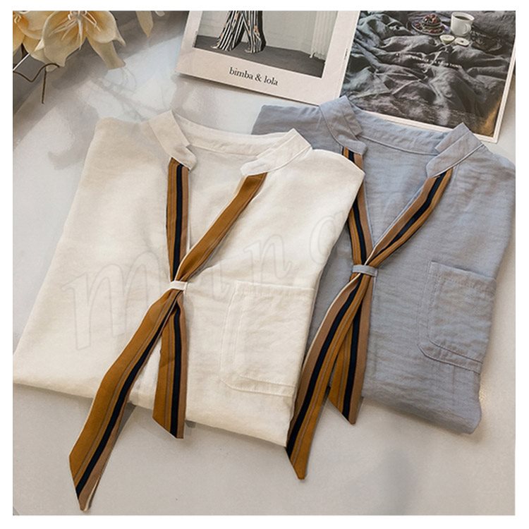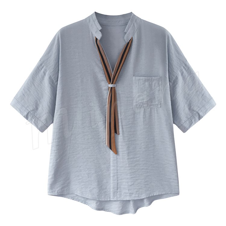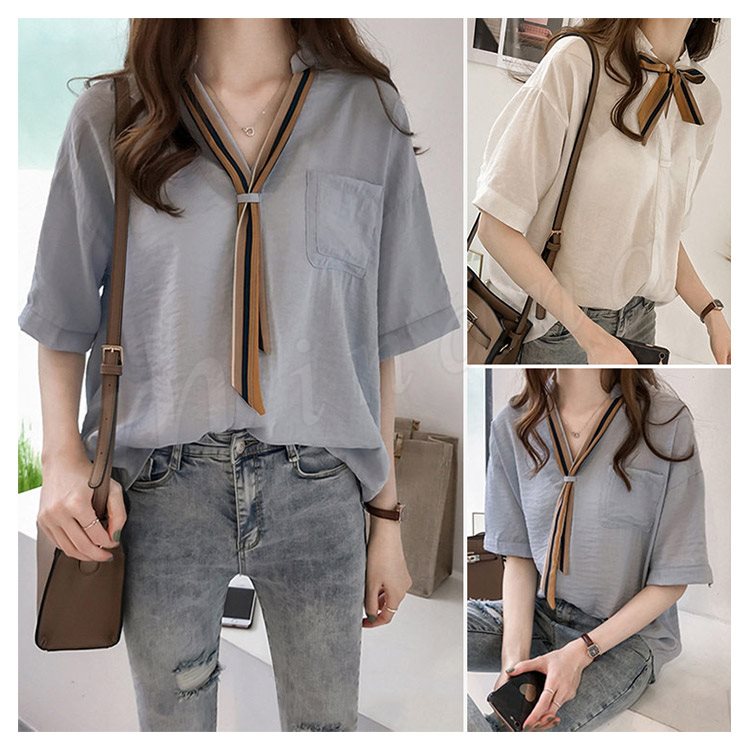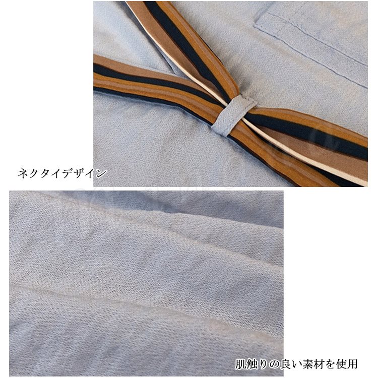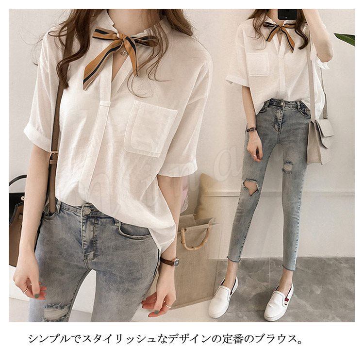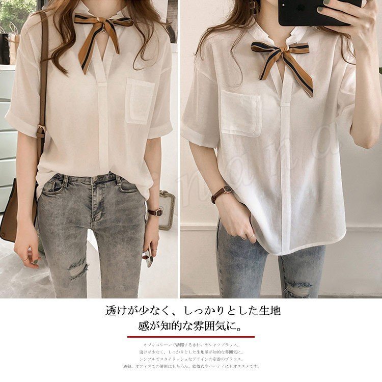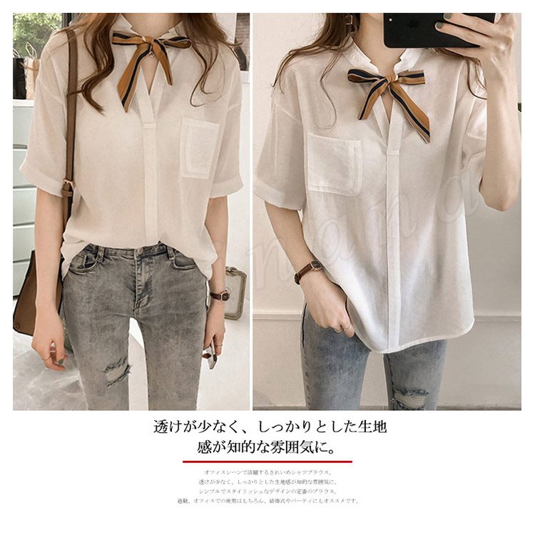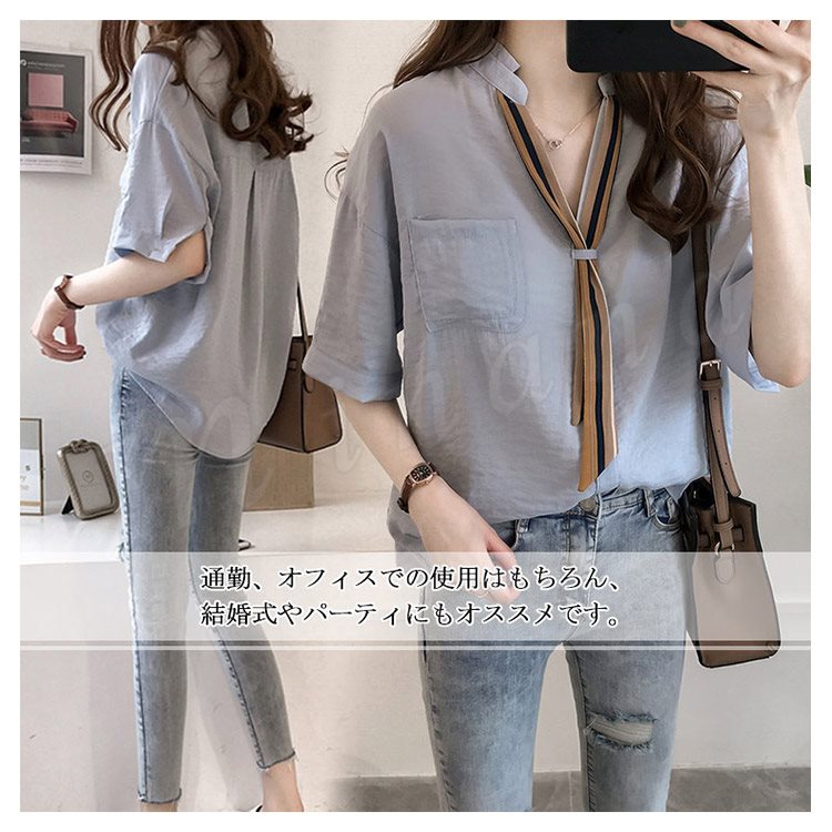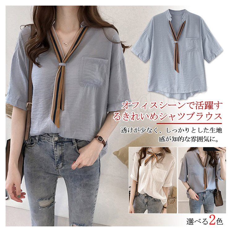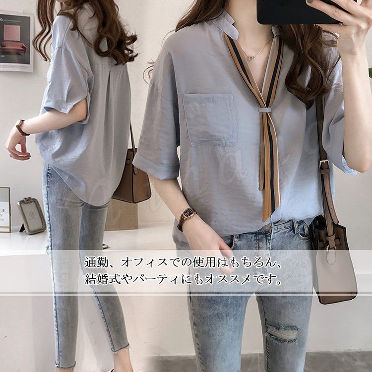 ブラウス レディース とろみシャツ ネクタイ 5分袖 Vネック オフィス ストライプ オフィス ビジネスシャツ 20代 30代