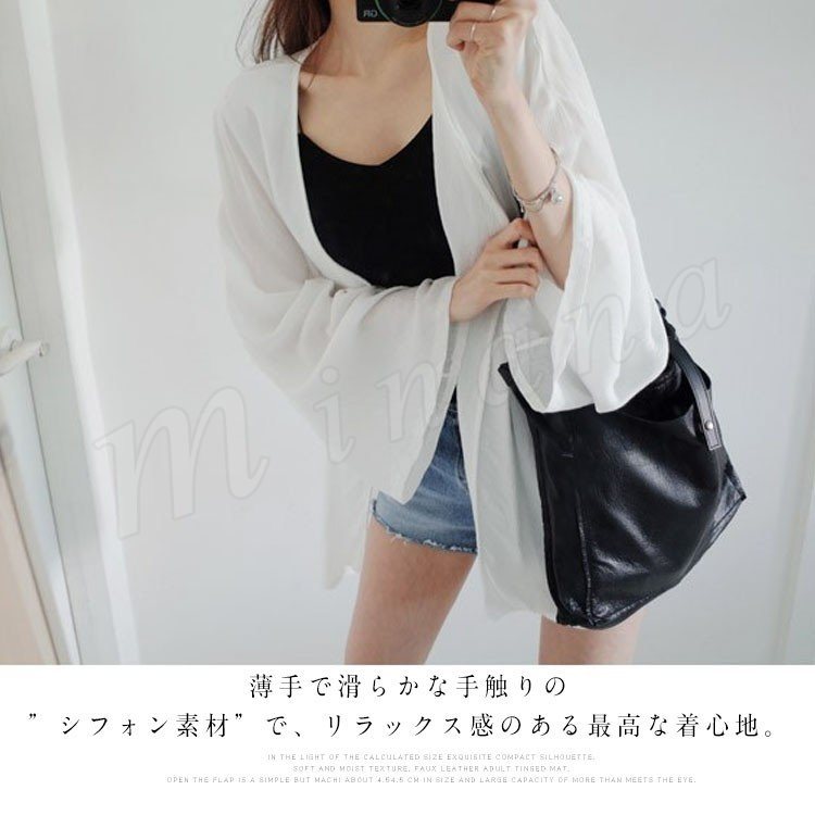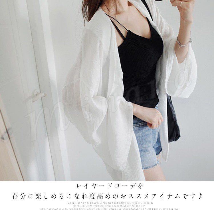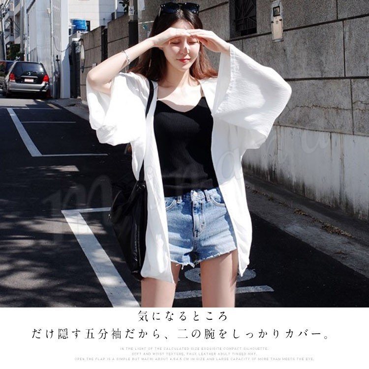 ワイドシルエットで体型カバー効果◎シフォン ライトアウター カーディガン 五分袖 ラッシュガード 羽織り シンプル 無地 夏 レディ