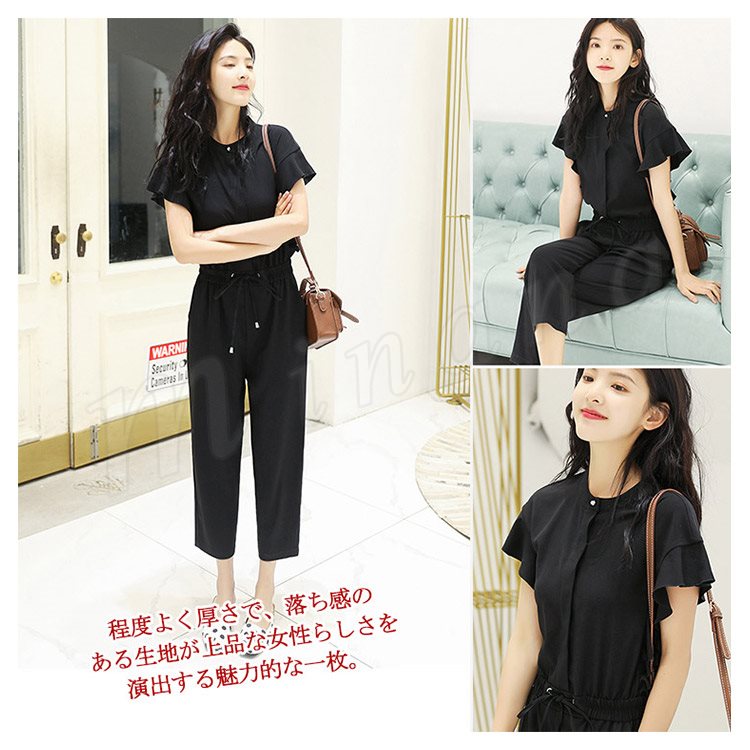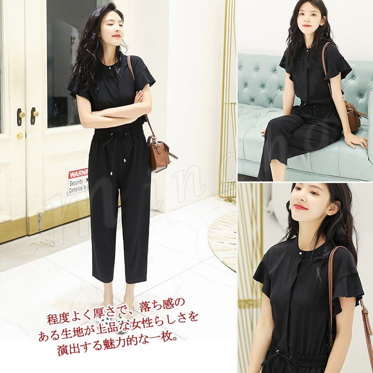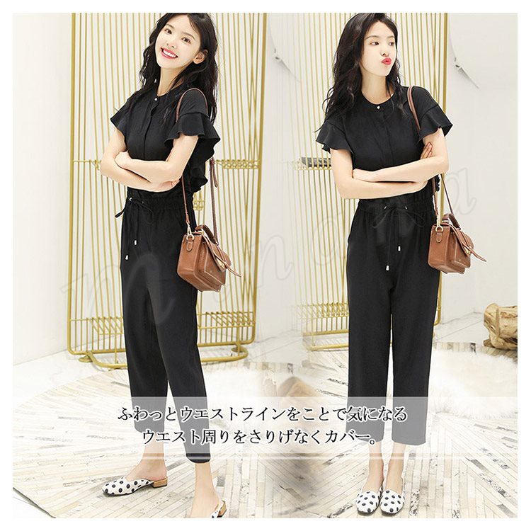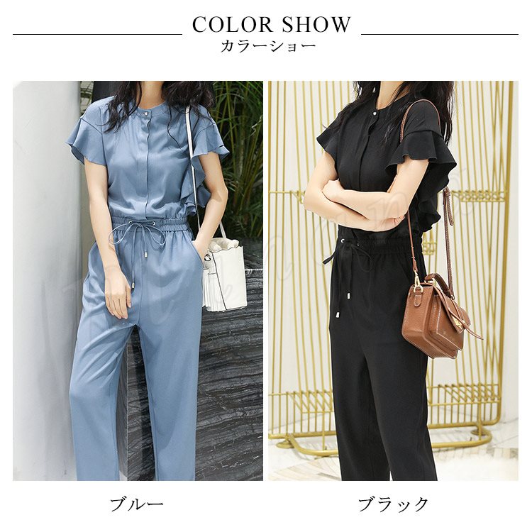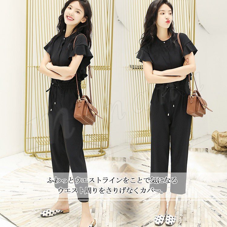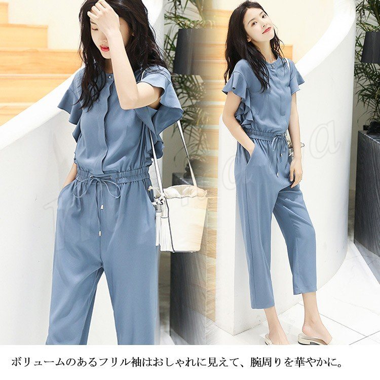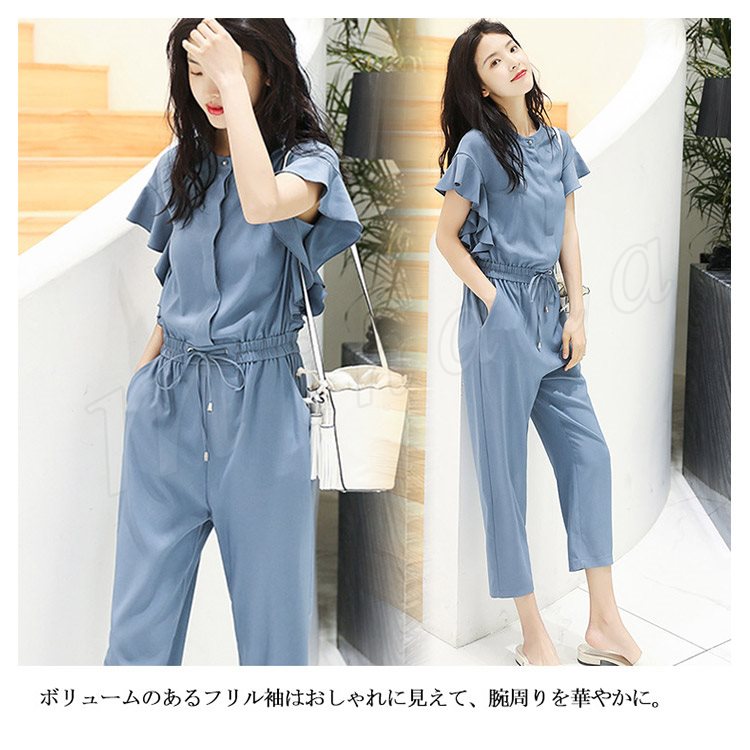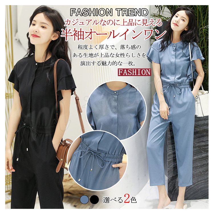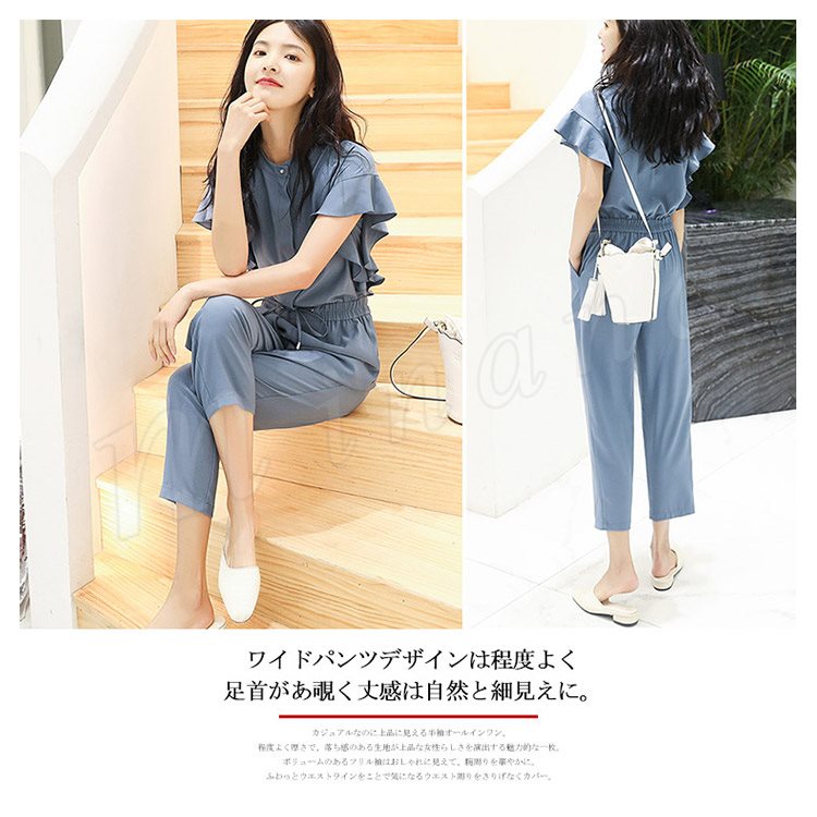 半袖オールインワン レディース オールインワン フリル袖 パンツドレス コンビネゾン オーバーオール 半袖 九分丈 ブラウジング カジュアル