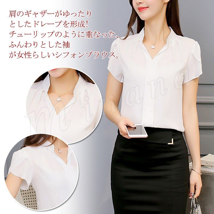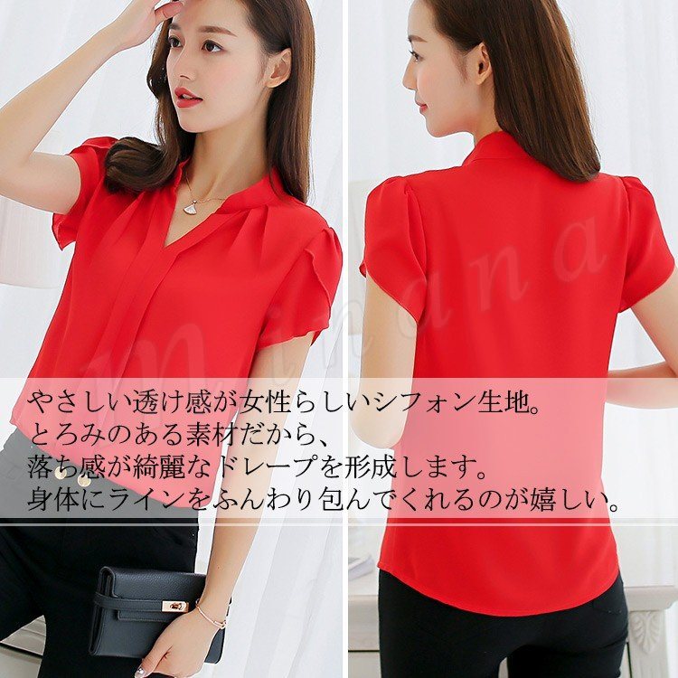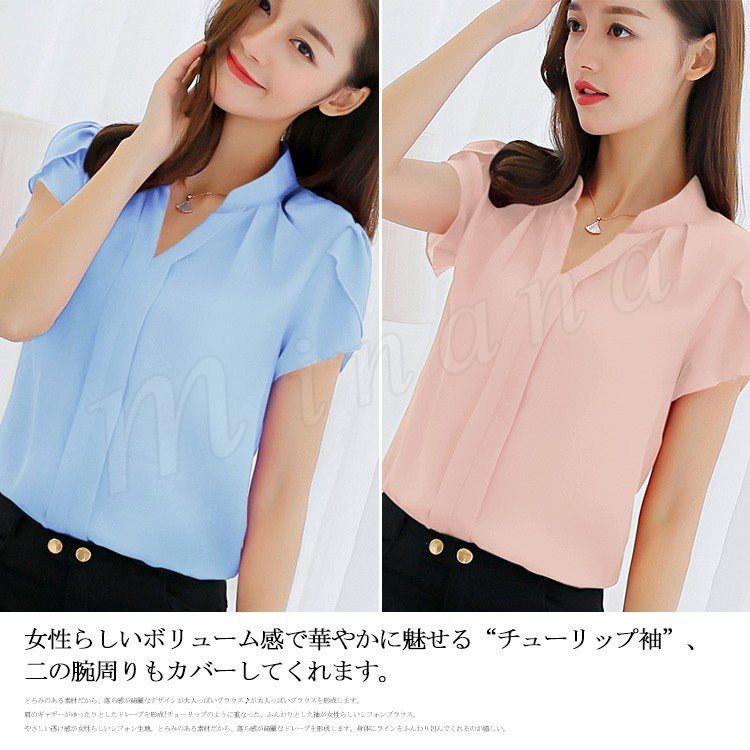 【全4色】レディース 2018春夏 ブラウス スリム カジュアル 半袖 シフォン フレア袖 Vネック チューリップ袖 無地 ドレープ フェミニン シン