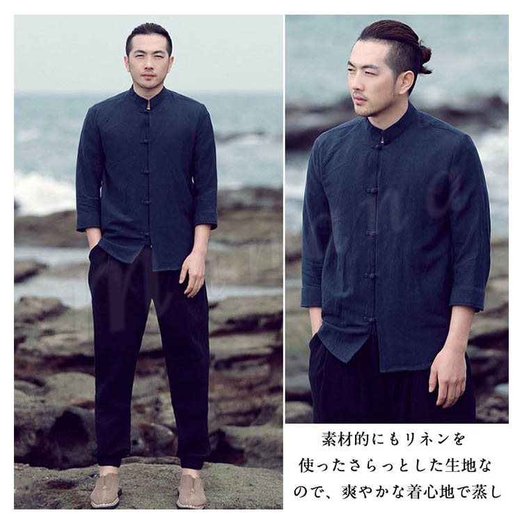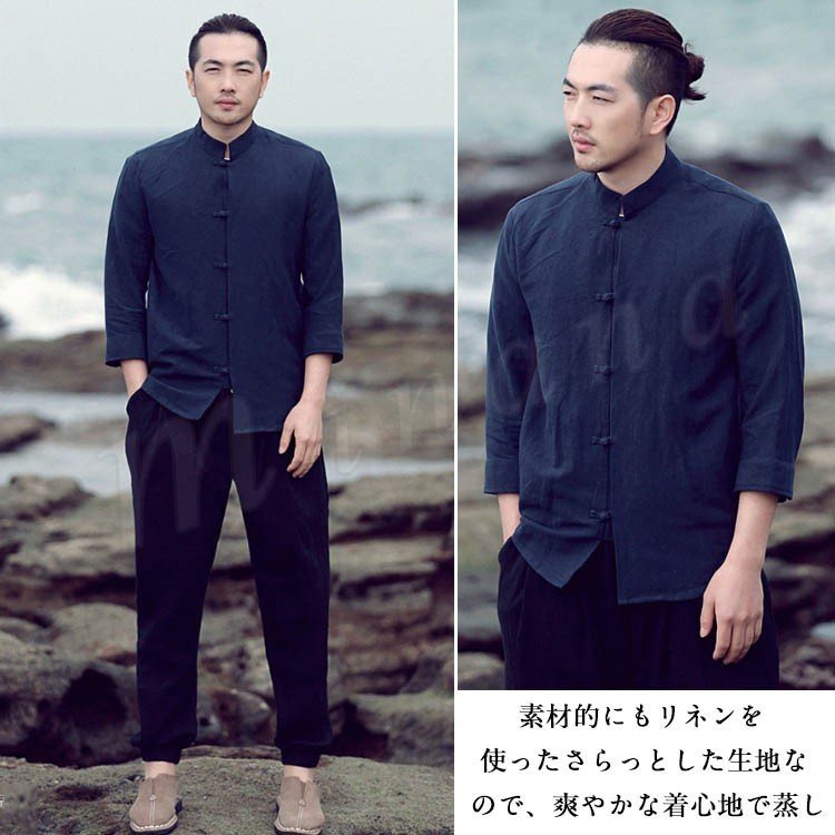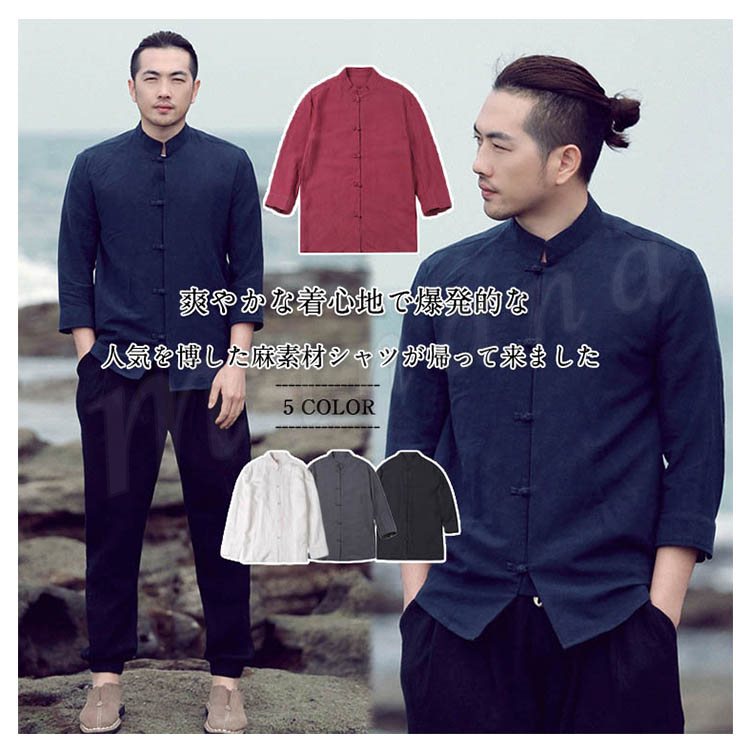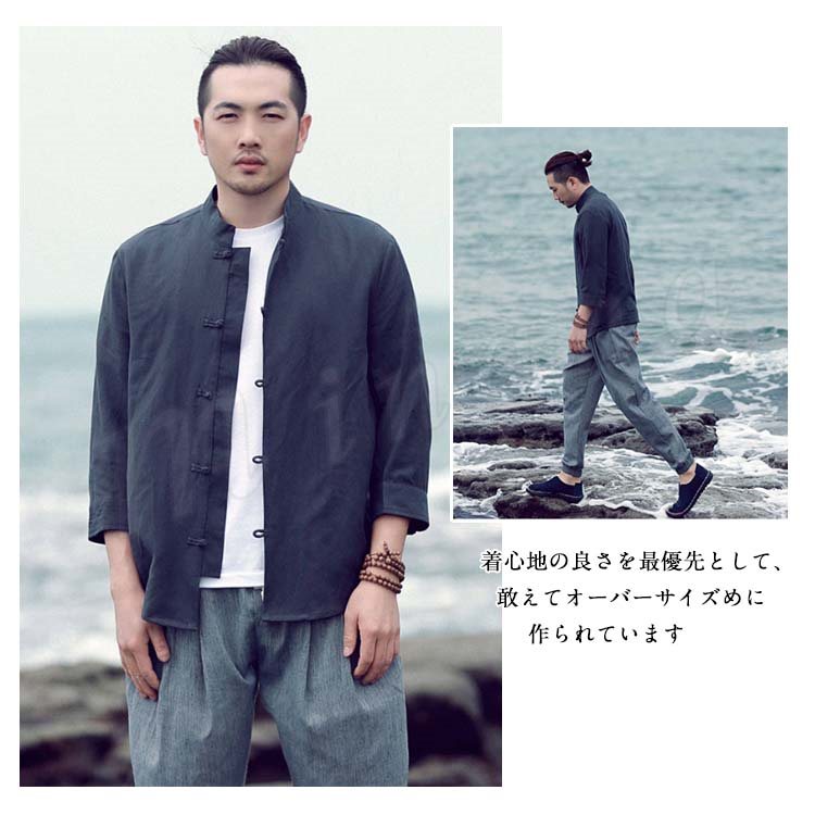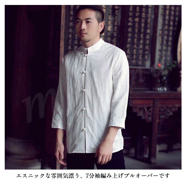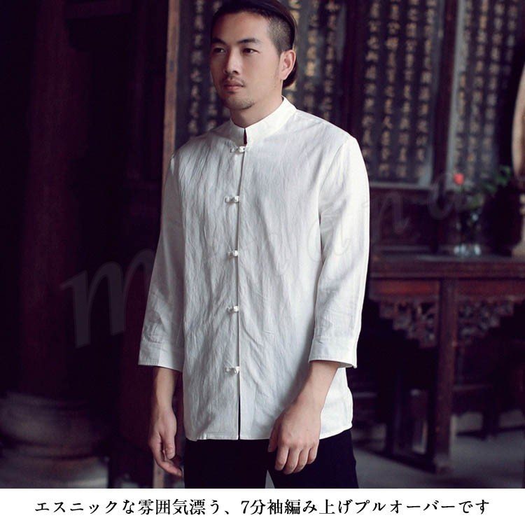 リネンシャツ メンズ 麻生地 7分袖 無地 カジュアルシャツ リラックス チャイナボタン チャイナ風 シンプル ファッション エスニック クラシック
