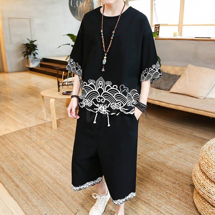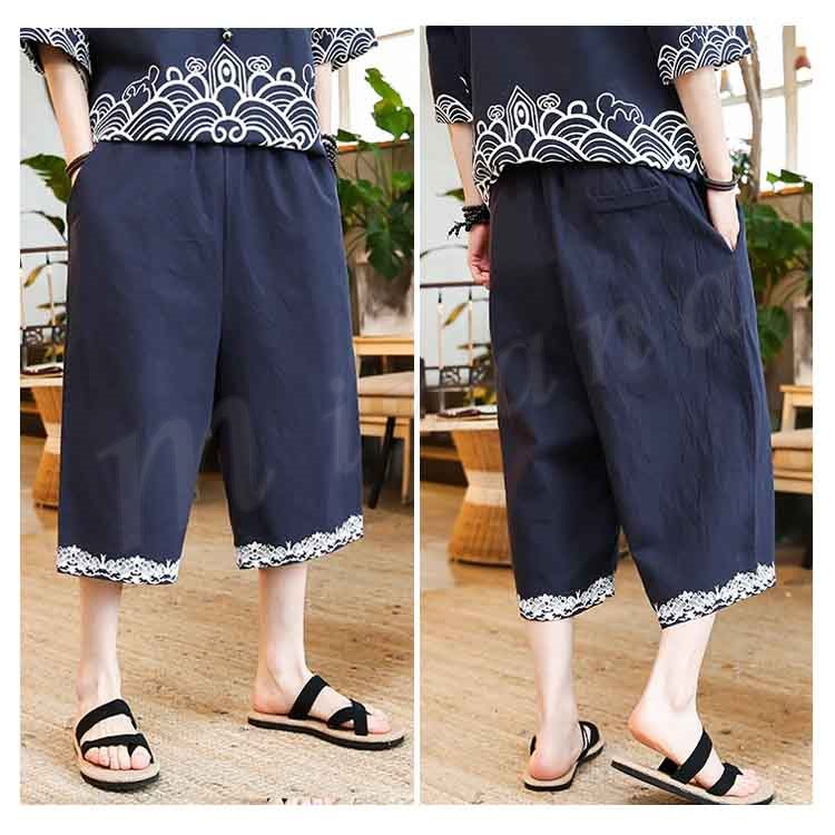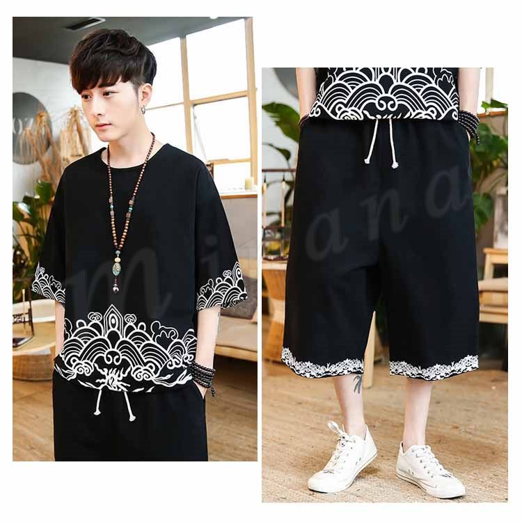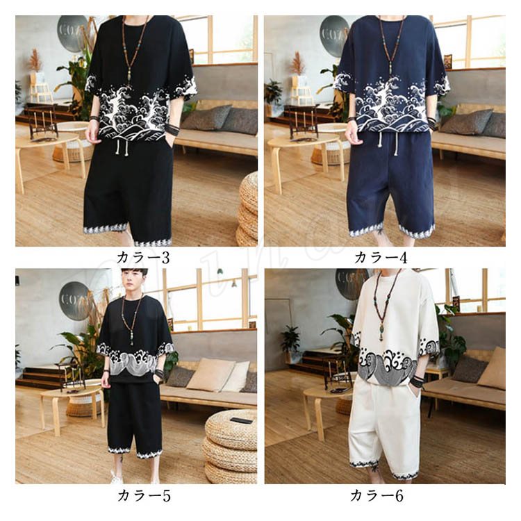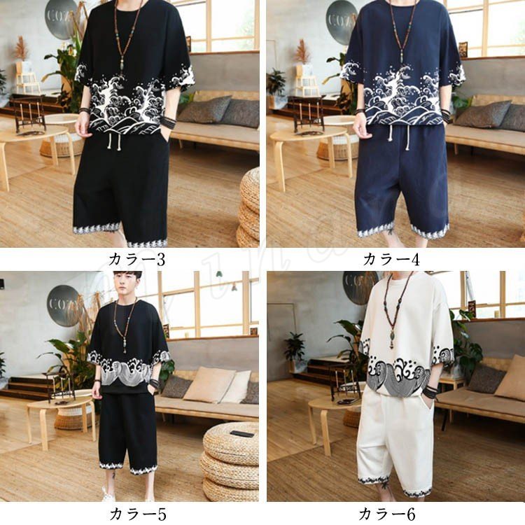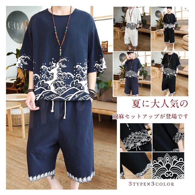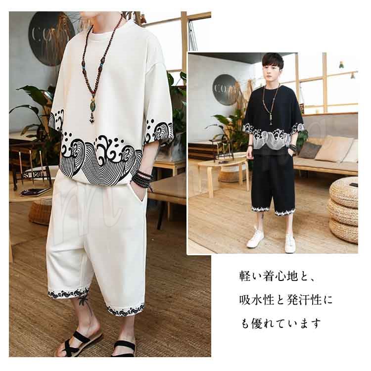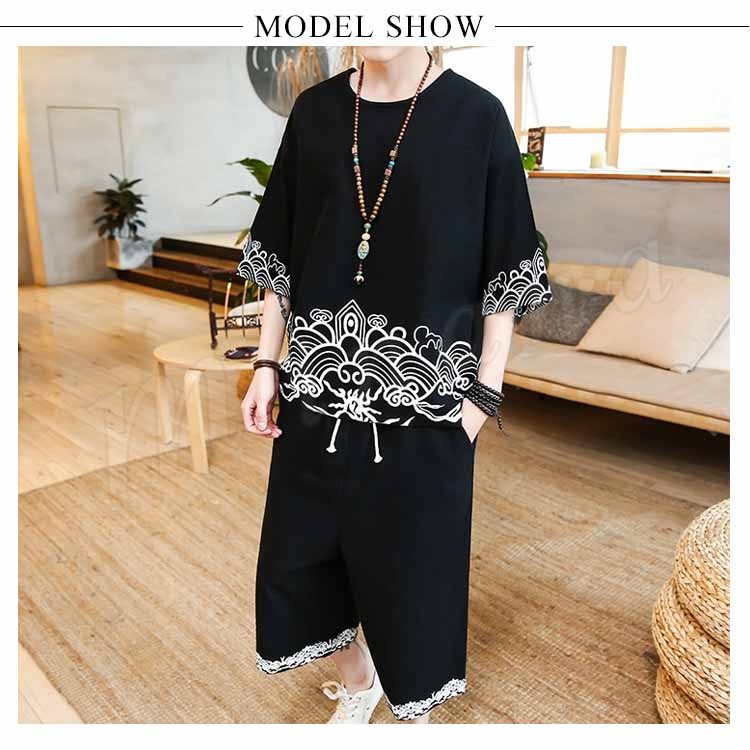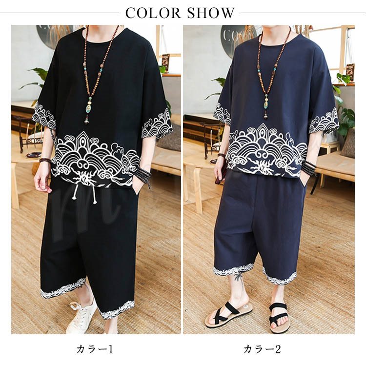 メンズ セットアップ 7分袖 上下セット 大きいサイズ ルームウェア 部屋着 綿麻 Tシャツ パンツ 2点セット ジャージセット 夏 快適 通気 民族