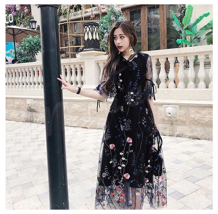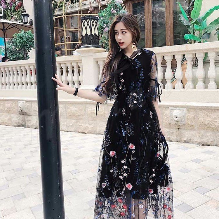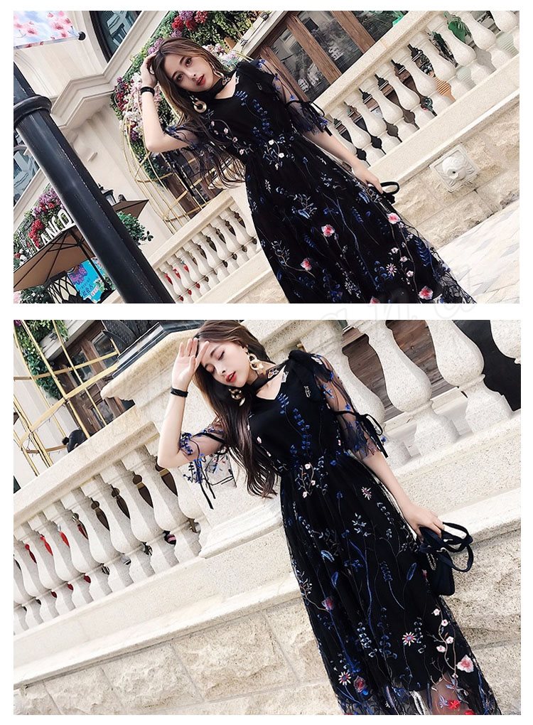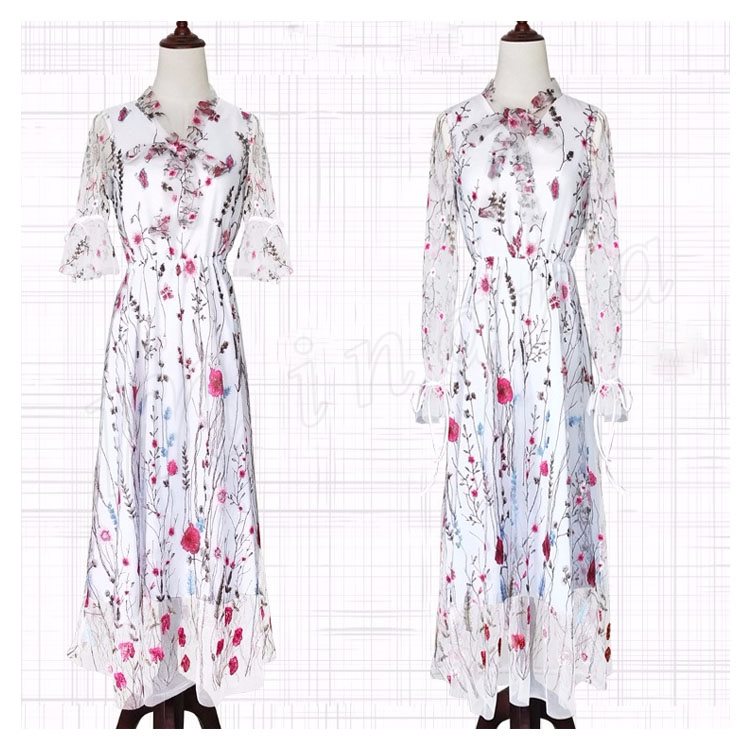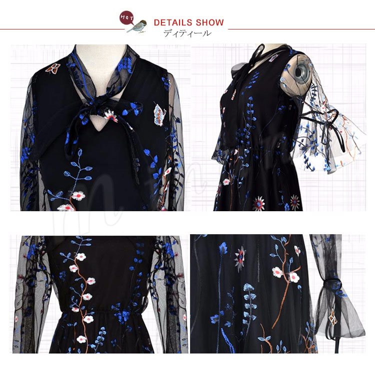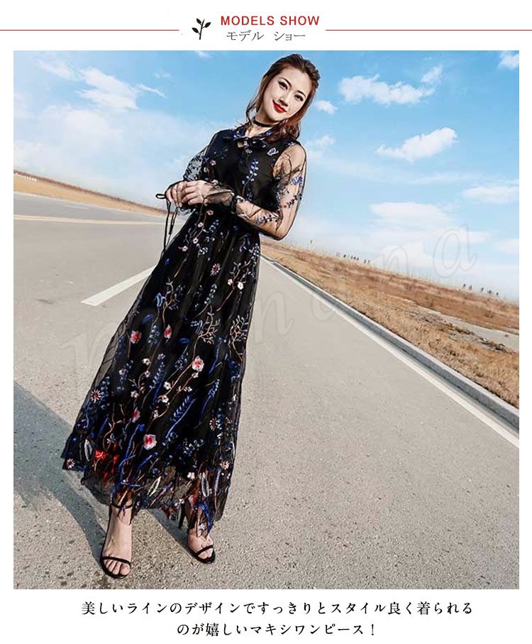 ワンピース レディース リゾートワンピース ロング丈ワンピース チュニック 体型カバー リボンタイ Vネック 長袖 半袖 ボリューム フレア 花柄 刺