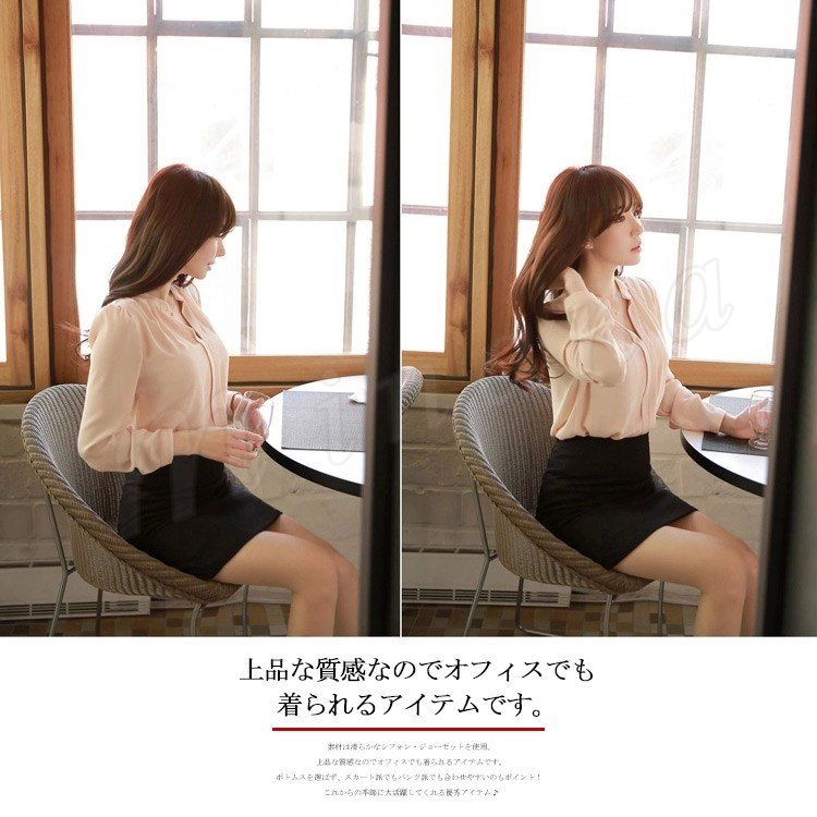 | 大人の楽チンシフォンブラウスの登場です。 深めのVネックは広すぎず狭すぎず…キレイなネックラインにこだわりました。 素材は滑らかなシフォン・ジョーゼットを使用。 上品な質感なのでオフィスでも着られるアイテムです。 ボトムスを選ばず、スカート派でもパンツ派でも合わせやすいのもポイント! これからの季節に大活躍してくれる優秀アイテム♪ | |