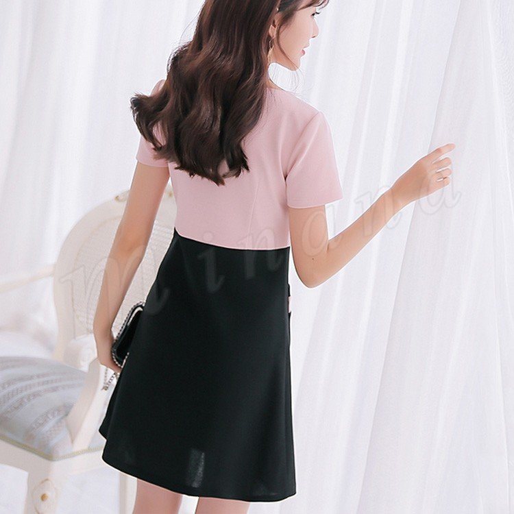 ドッキングワンピース/夏ワンピース/フレアワンピース/Aラインワンピース/ワンピース/レディース/女性/半袖/オフィス/着痩せ/膝上丈/バイカ