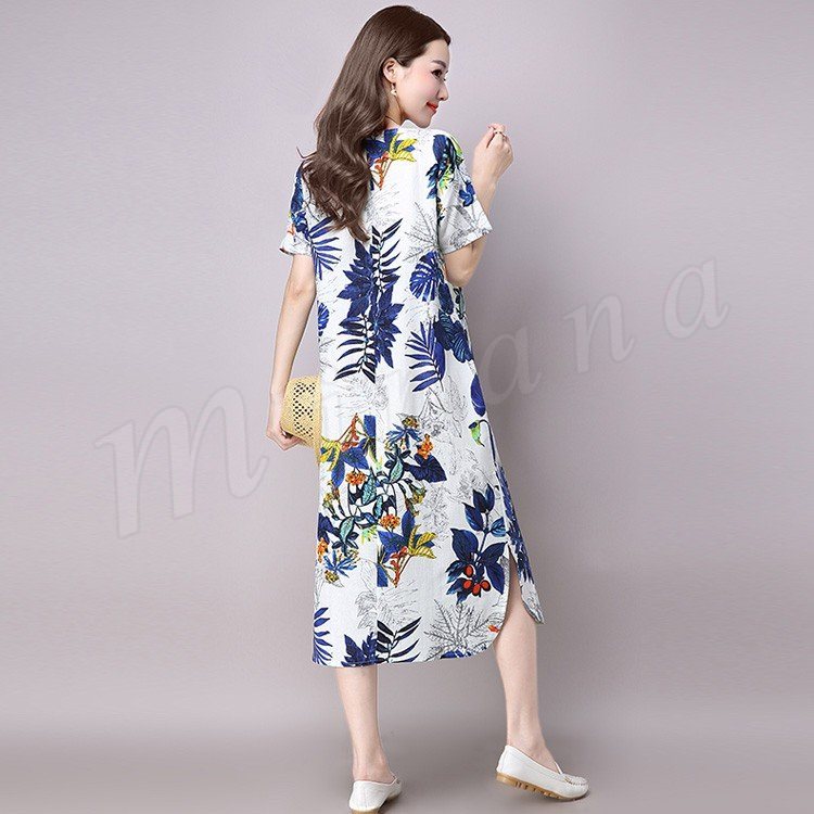 ワンピース リネンワンピース 森ガールワンピース クルーネック 麻綿 ミモレ丈 半袖 ボタニカル柄 レディース 大きいサイズ 民族風 ゆっ