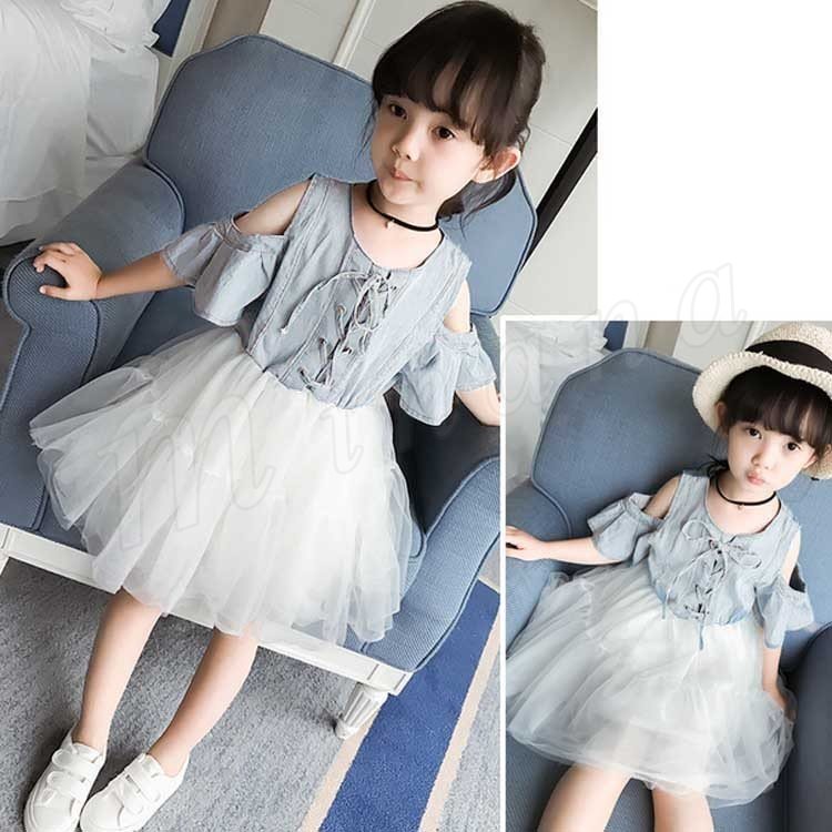 異素材MIXが可愛い ワンピース オフショルダーワンピース キッズ チュールワンピース ふんわり デニムワンピース デニム 半袖 レースアップ