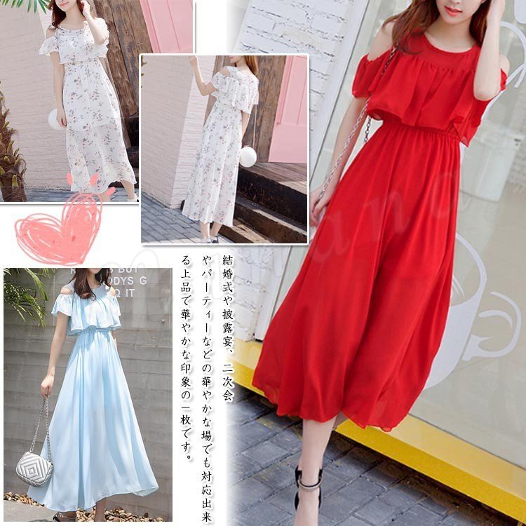 シフォンワンピース オフショルワンピ 肩出しワンピース フレアワンピース Aラインワンピース フリル レディース ミドル丈 花柄 無地
