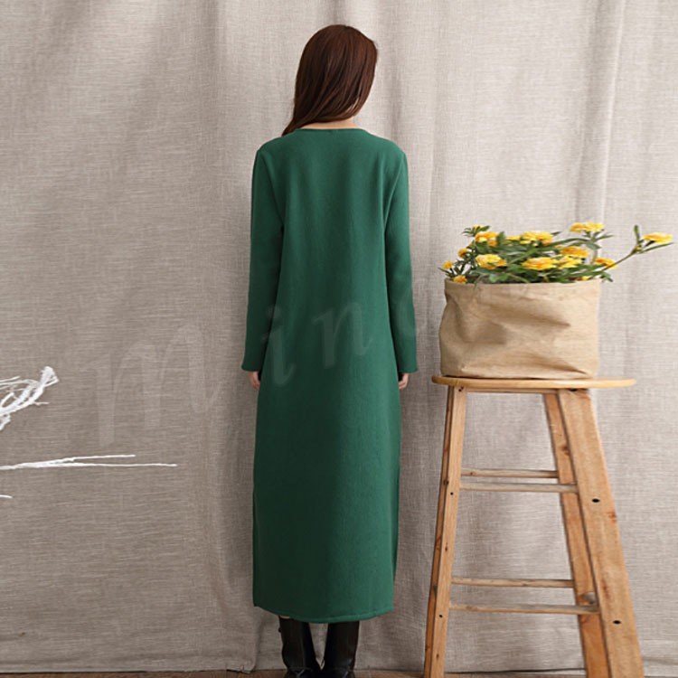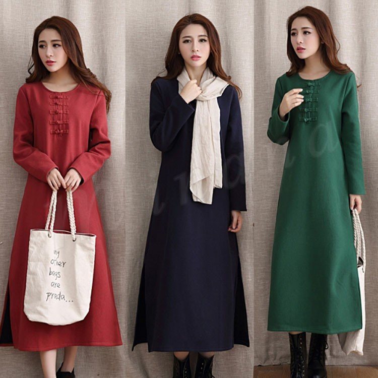 綿麻ワンピース 裏起毛ワンピース レディース 民族風 裏ボア エスニックチャイナ風ワンピース 森ガール風 マキシ ゆったり 暖かい 春 秋 2