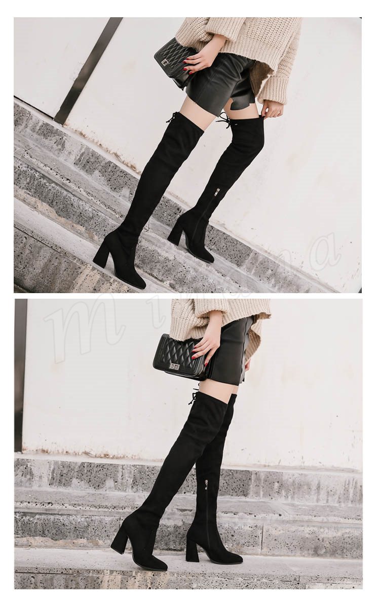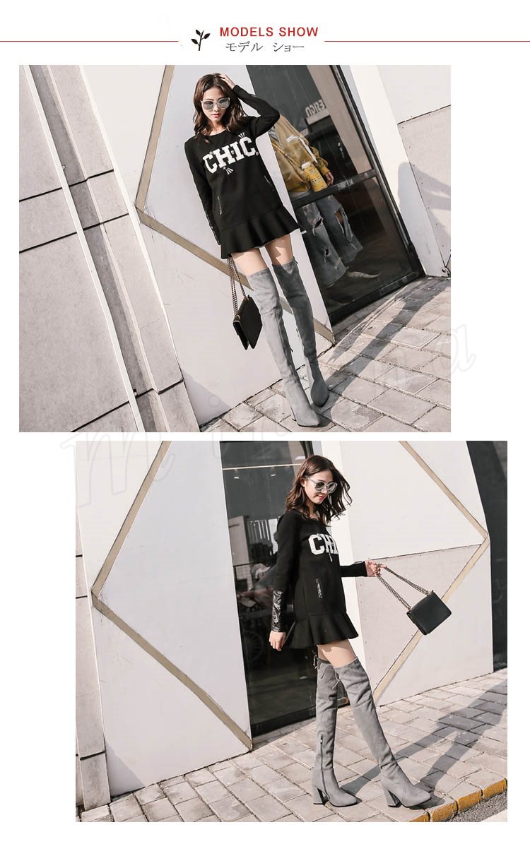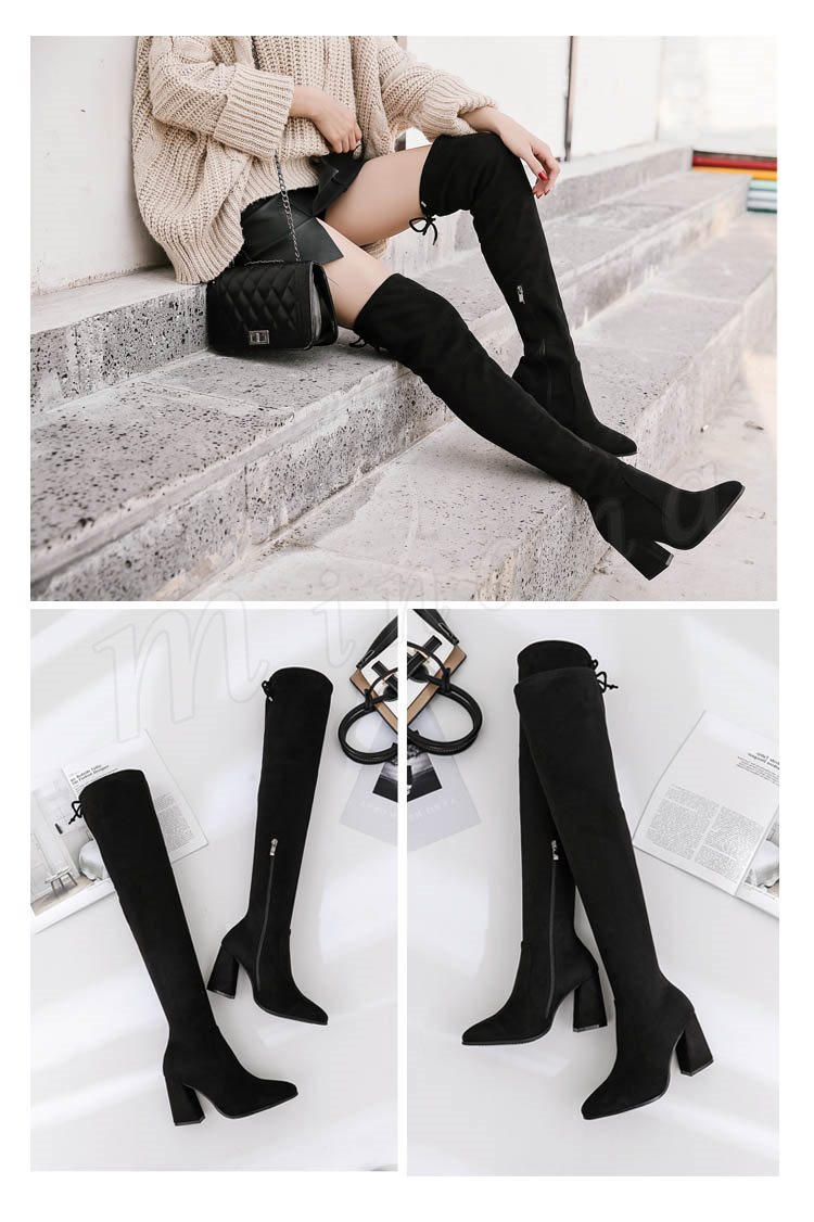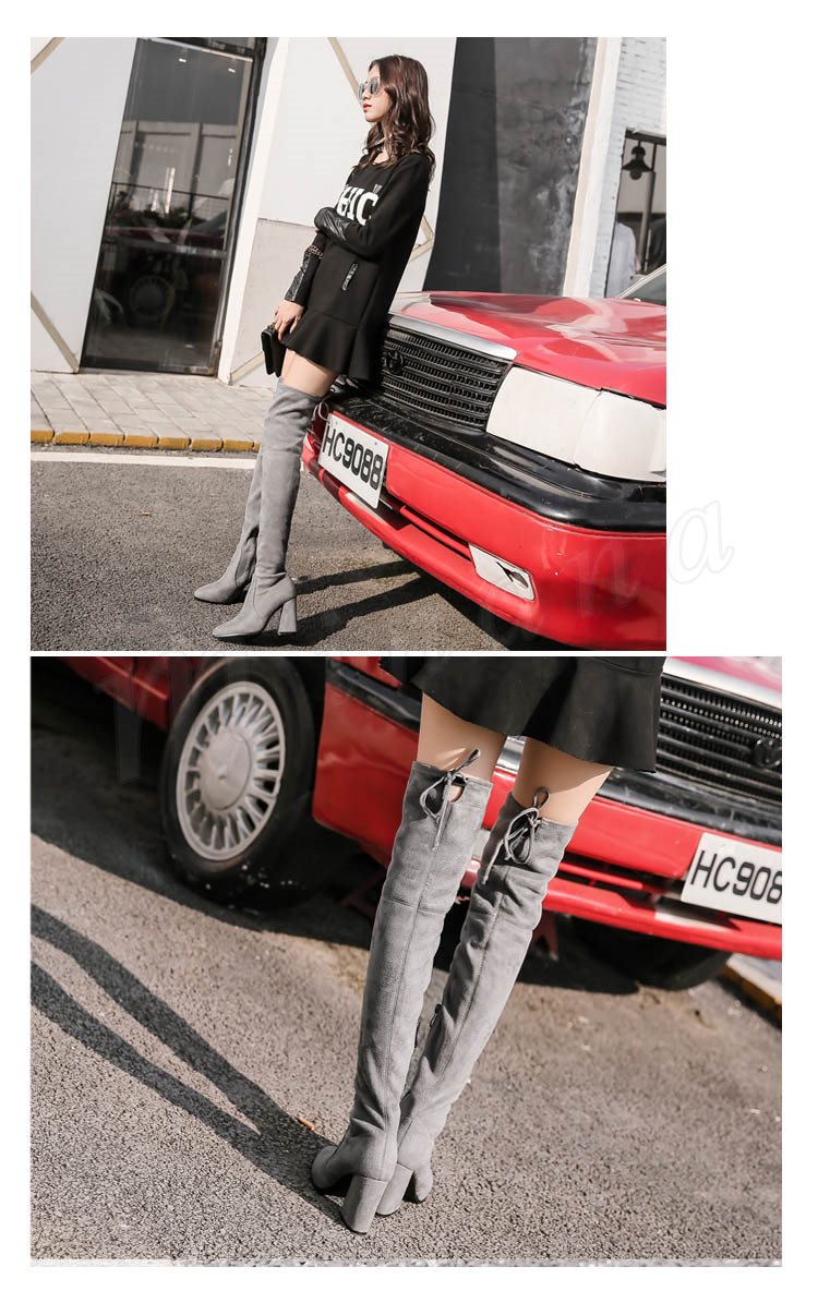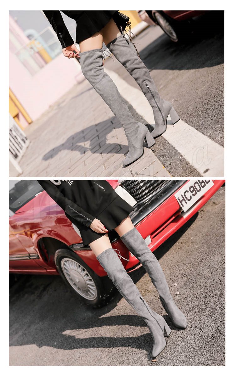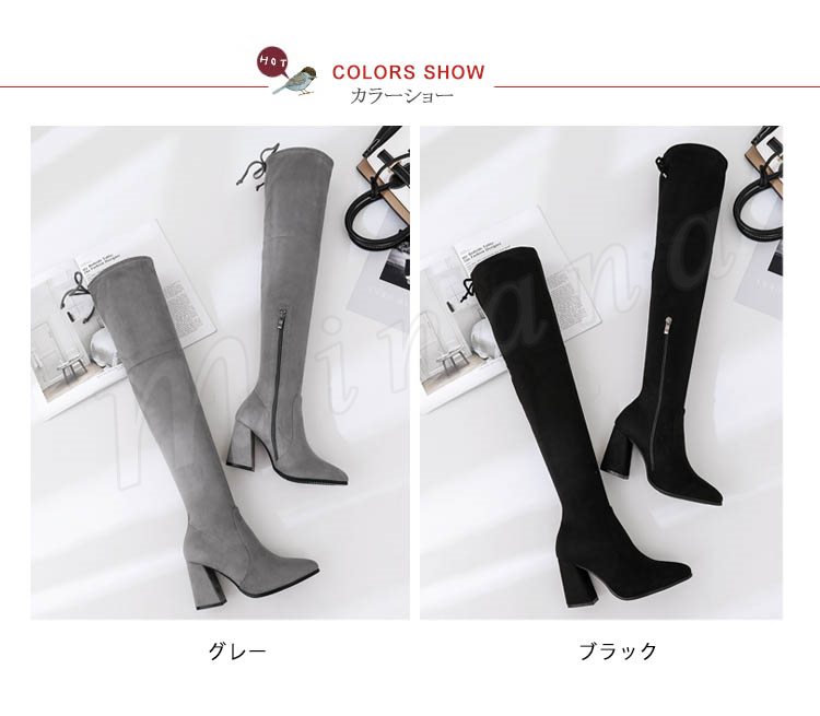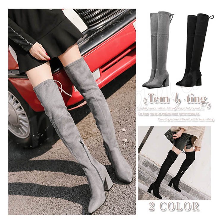 ニーハイ ブーツ ロングブーツ ポインテッドトゥ ハイヒール 太ヒール チャンキーヒール スエード PU 合成 靴 シューズ レディース グレー ブラ
