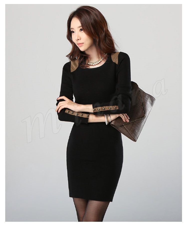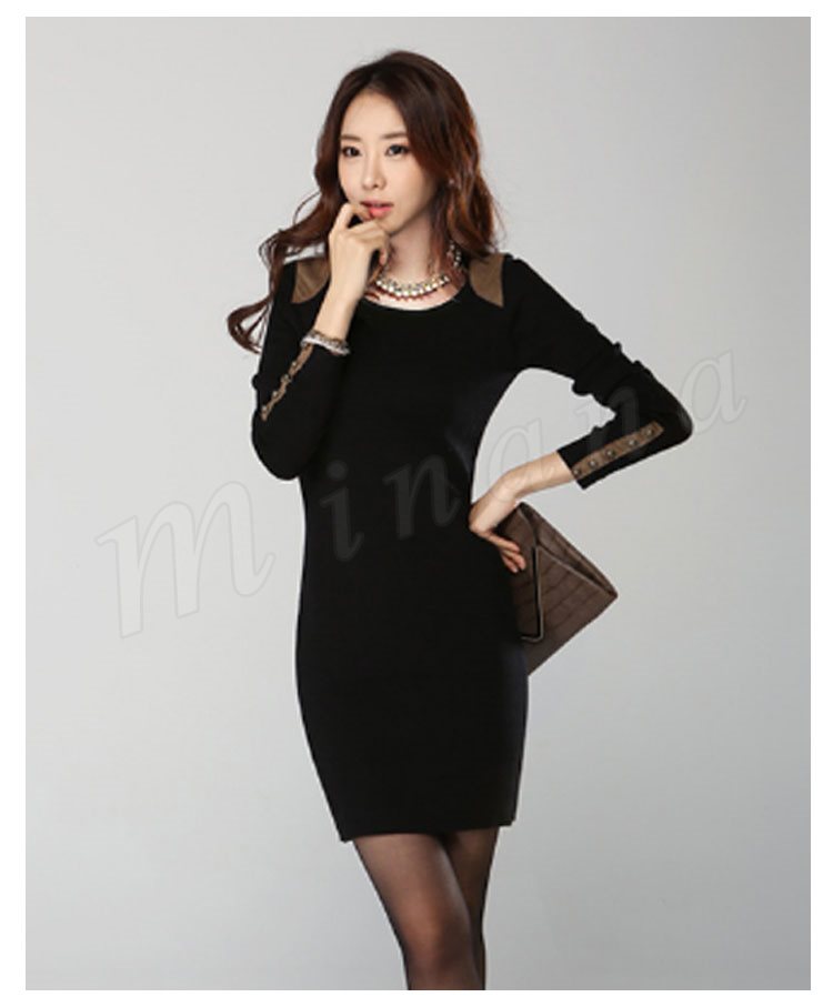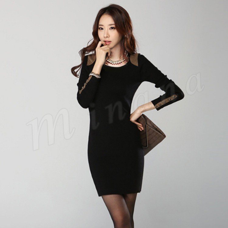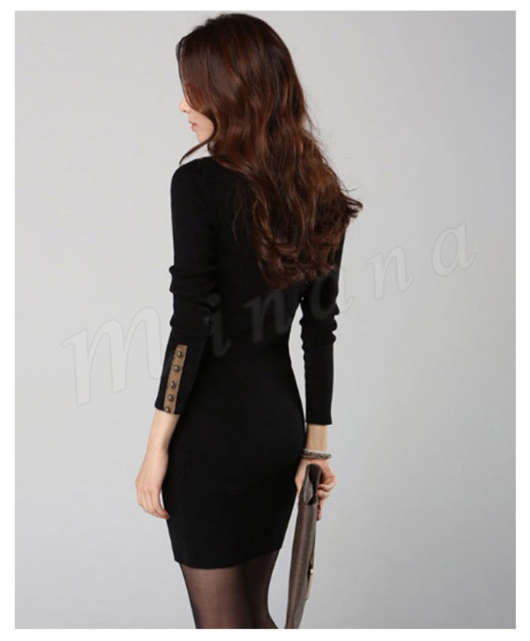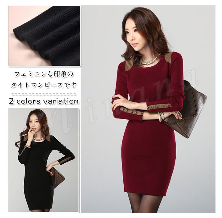 タイト ワンポイント ワンピース フェミニン 長袖 ミディアム丈 ミドル レディース