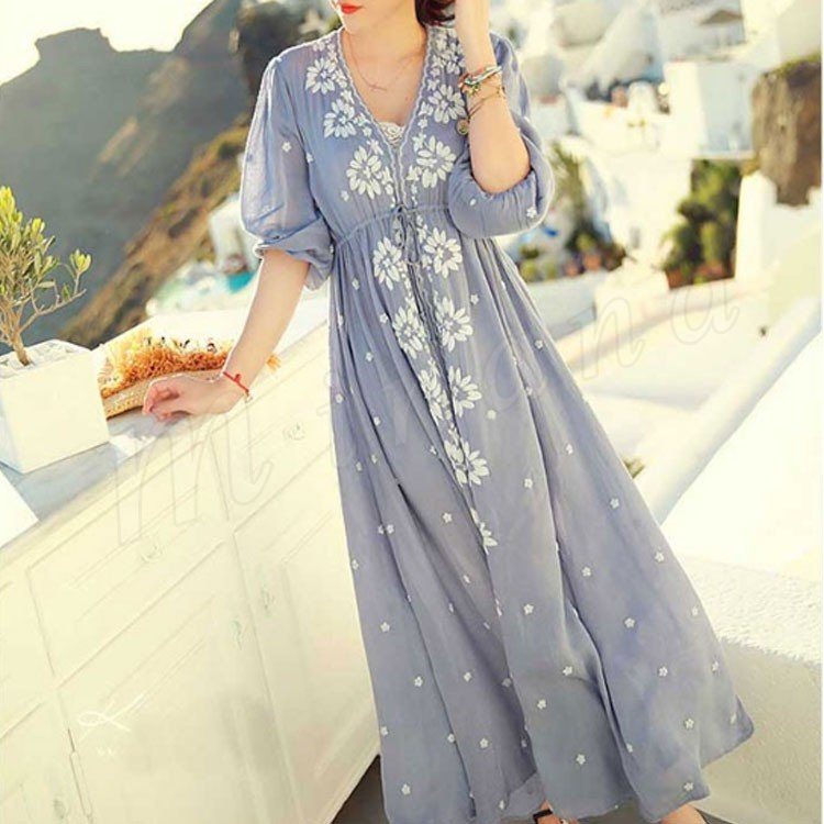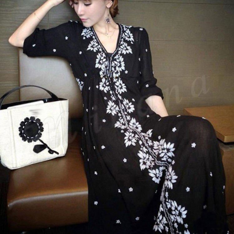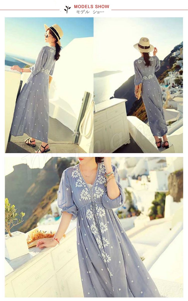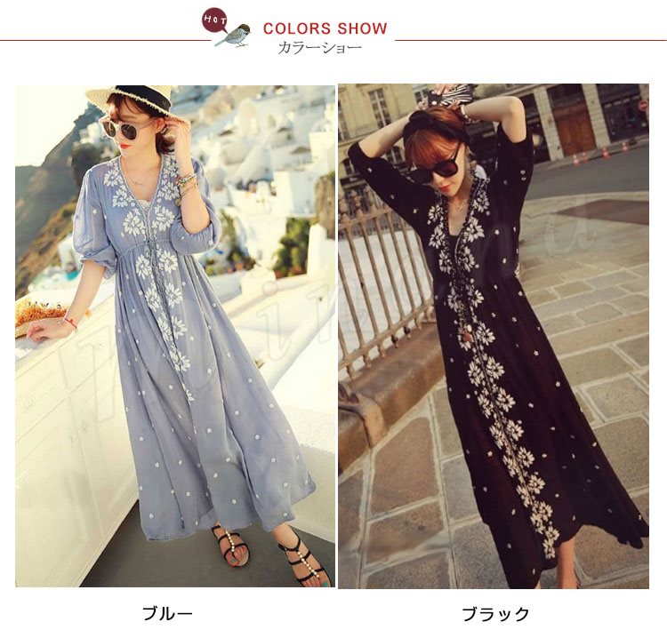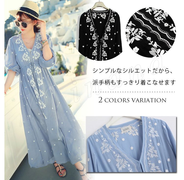 ワンピース/花柄刺繍/レディース/女性/ロングワンピース/マキシワンピース/リゾートワンピース/七分袖ワンピース/フレアスリーブ/エスニック