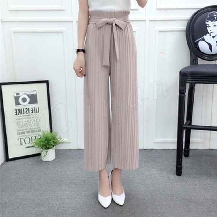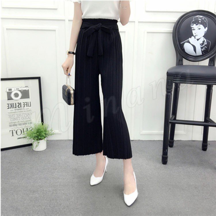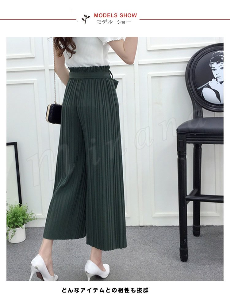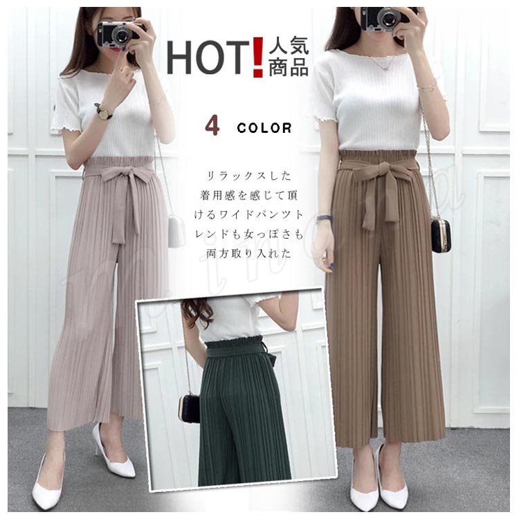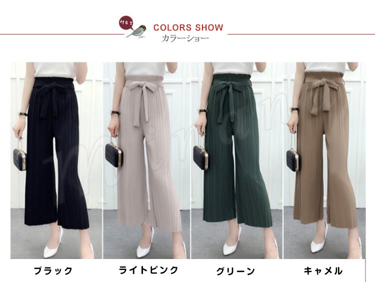 ワイドパンツ/ガウチョパンツ/ロング丈/9分丈/ハイウエスト/リブ/プリーツ/蝶結び/無地