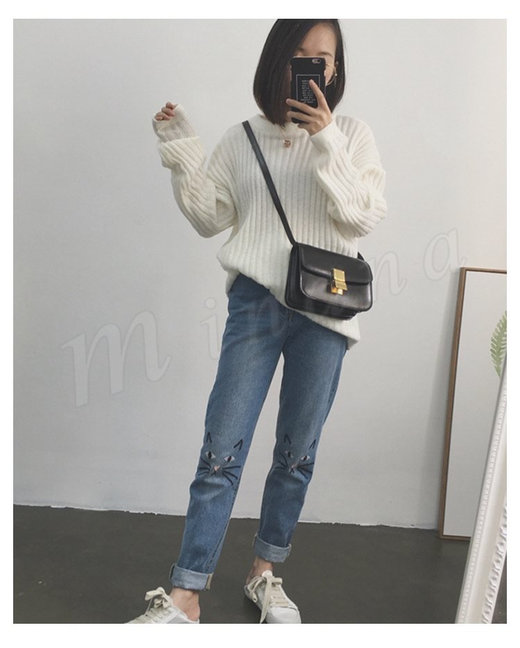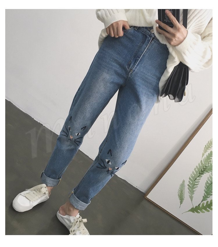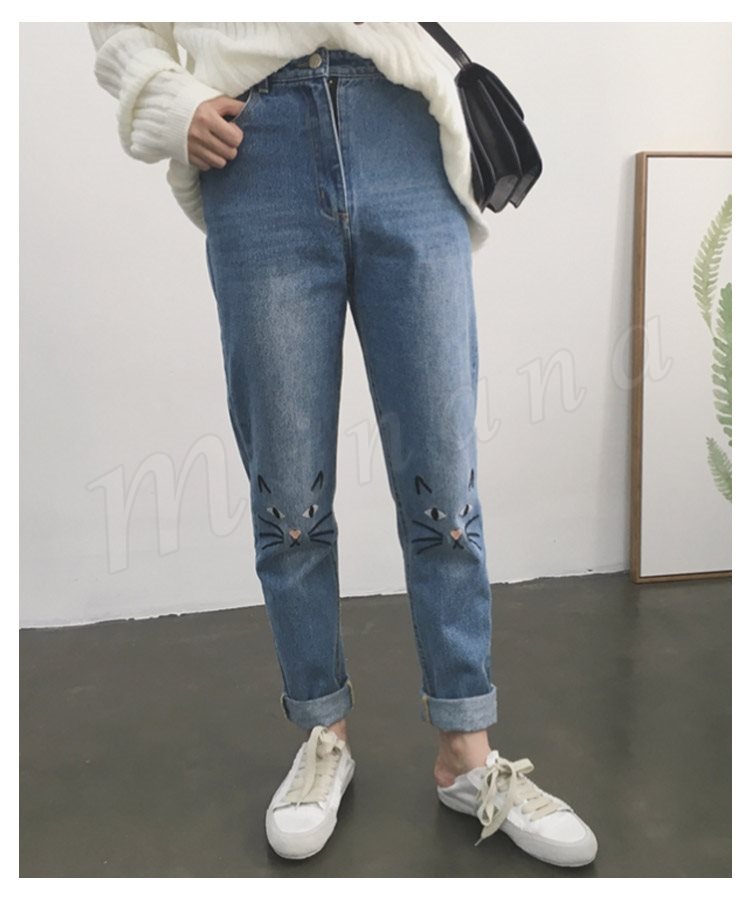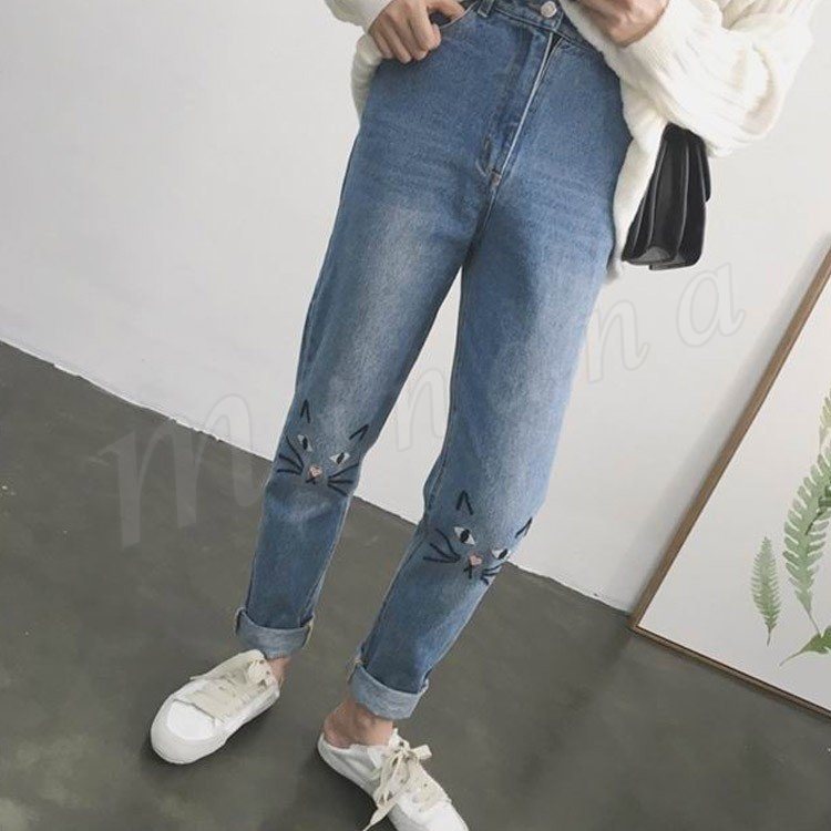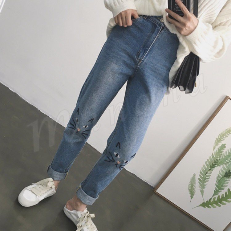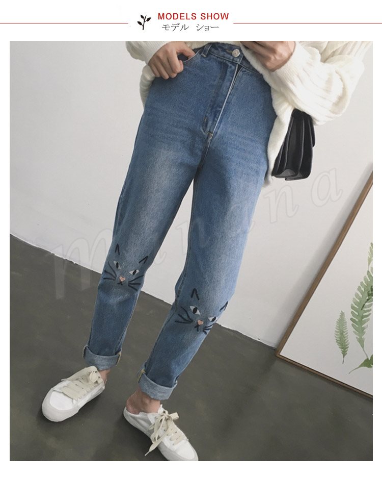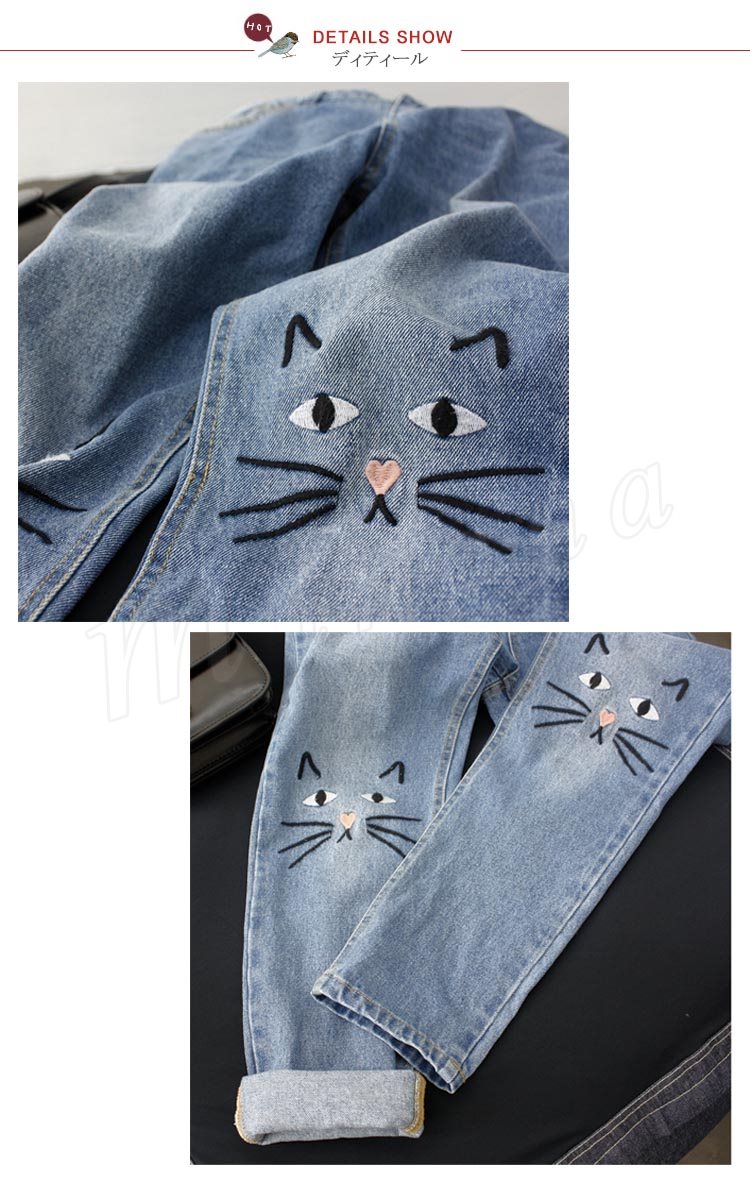 デニム ストレートデニム デニムパンツ パンツ レディース 猫 ネコ 猫刺繍 ハイウェスト かわいい ボトムス ズボン