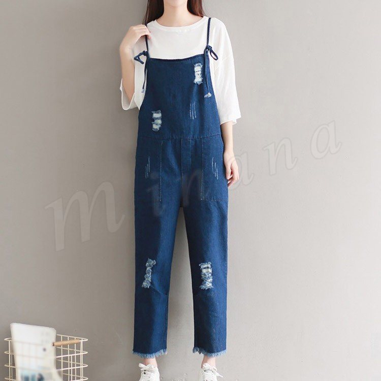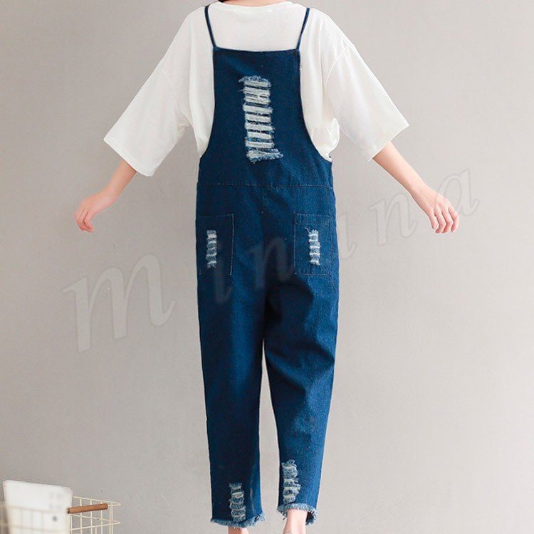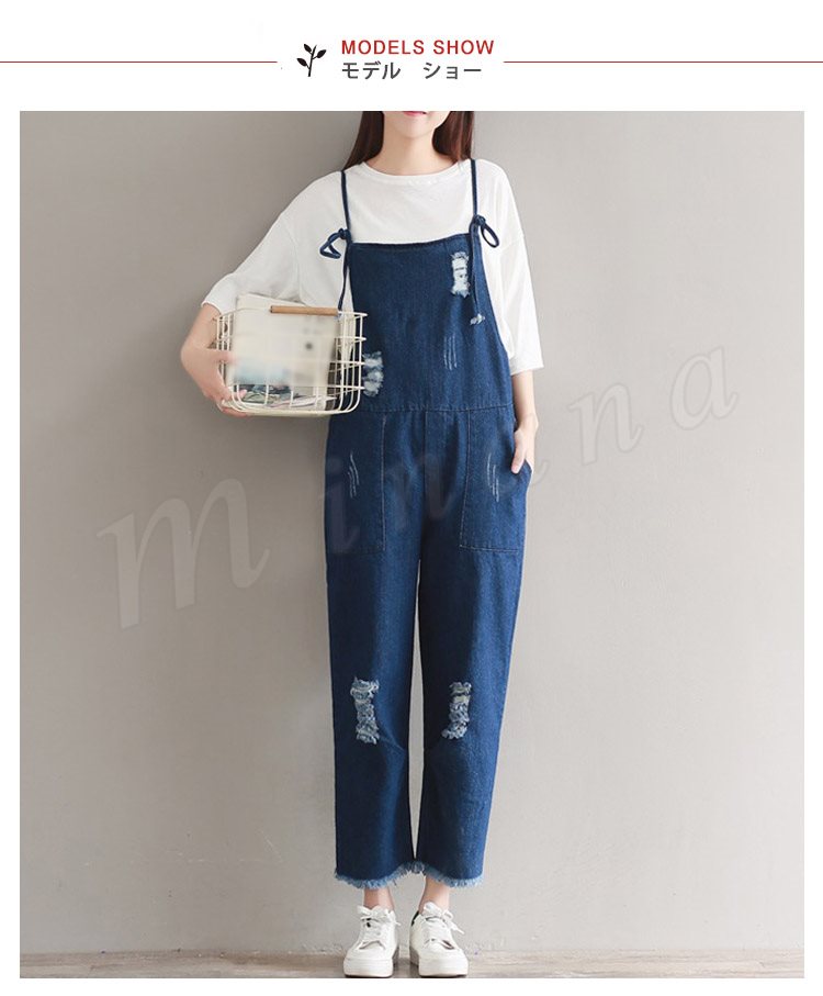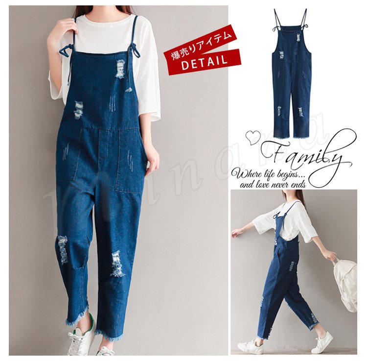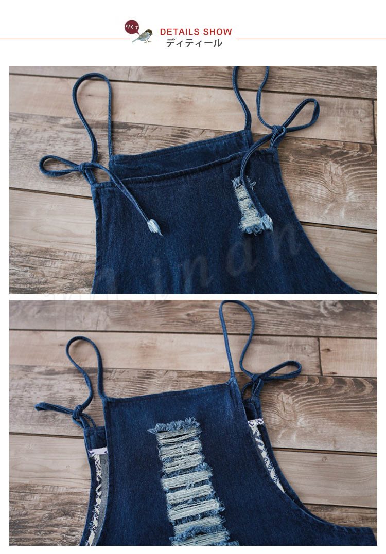 サロペット デニム オーバーオール レディース カットオフ ダメージ 七分丈 ボタン付き レディース ワンピース