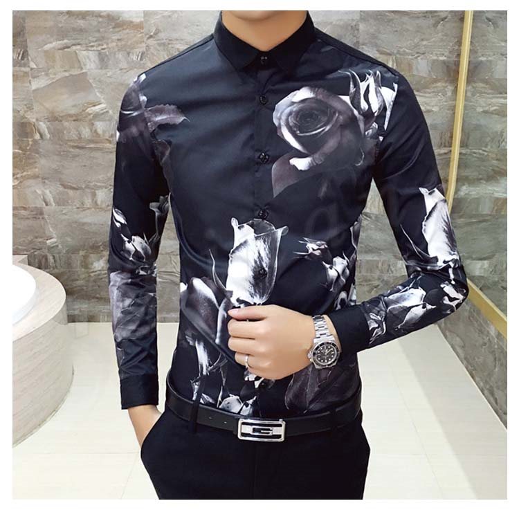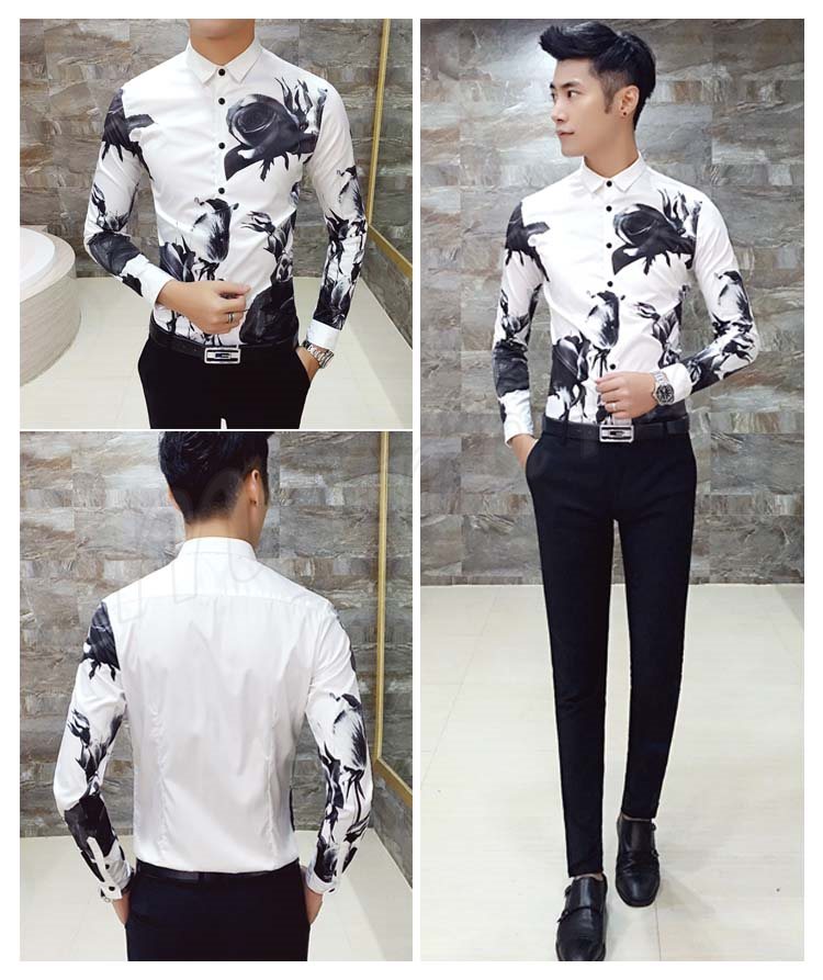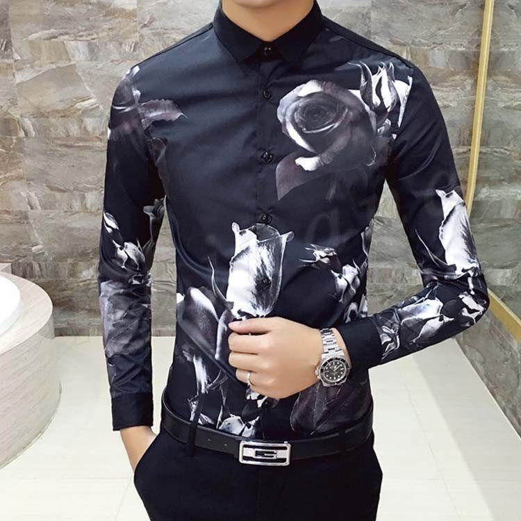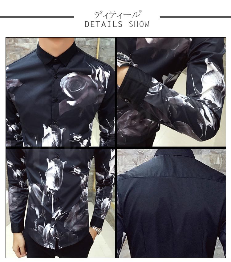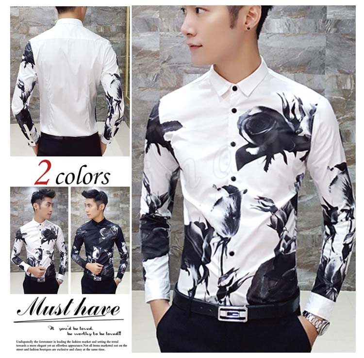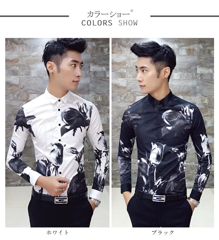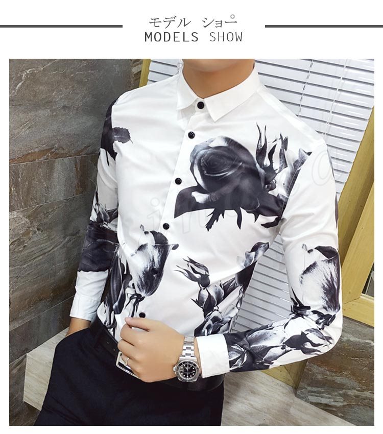 カジュアルシャツ メンズ トップス 長袖 プリント 総柄 花柄 白 黒 インナー 細身 きれい目 大きいサイズ コーデ メンズファッション