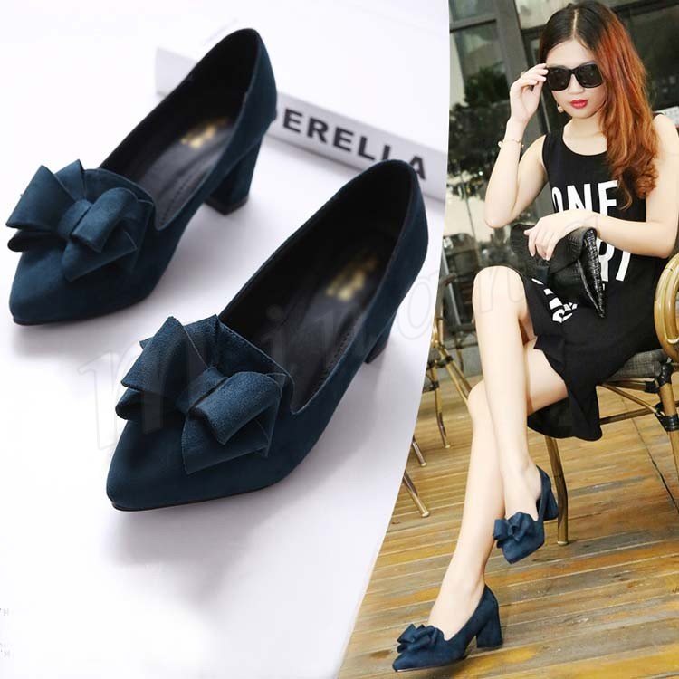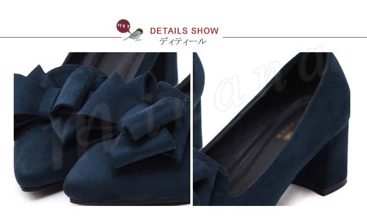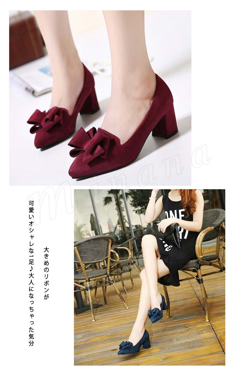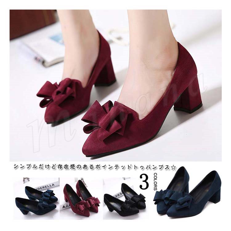 パンプス ポインテッドトゥ レディース リボン付きパンプス 太目ヒールパンプス スエード チャンキーパンプス 歩きやすい 走れる 通勤 通学