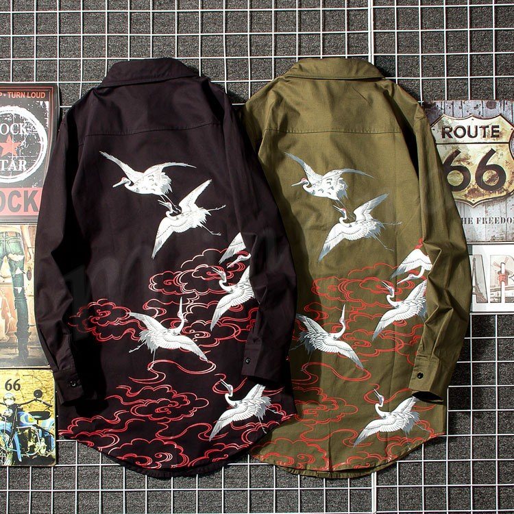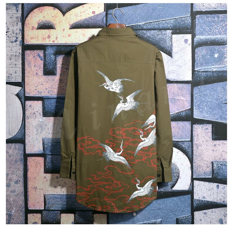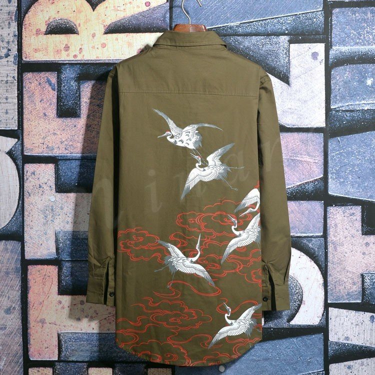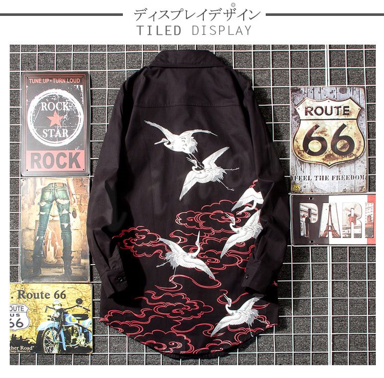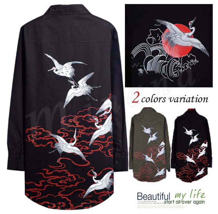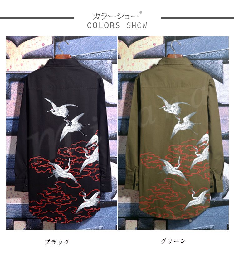 2018秋新作 ロングシャツ メンズ 長袖シャツ 鶴柄 プリント シャツコート カジュアルシャツ かっこいい トップス 春秋 薄手 おしゃれ