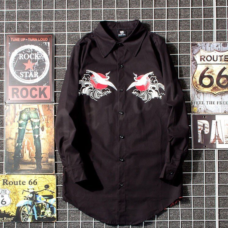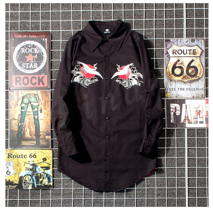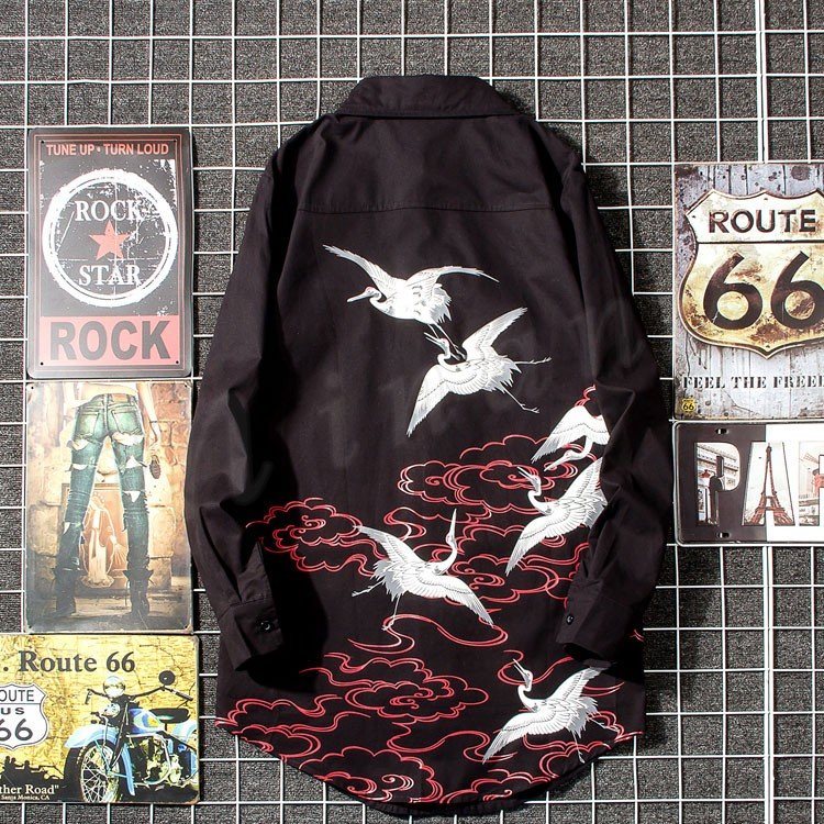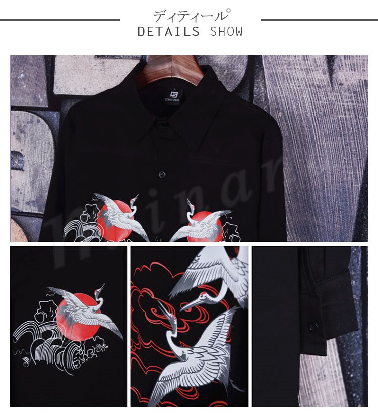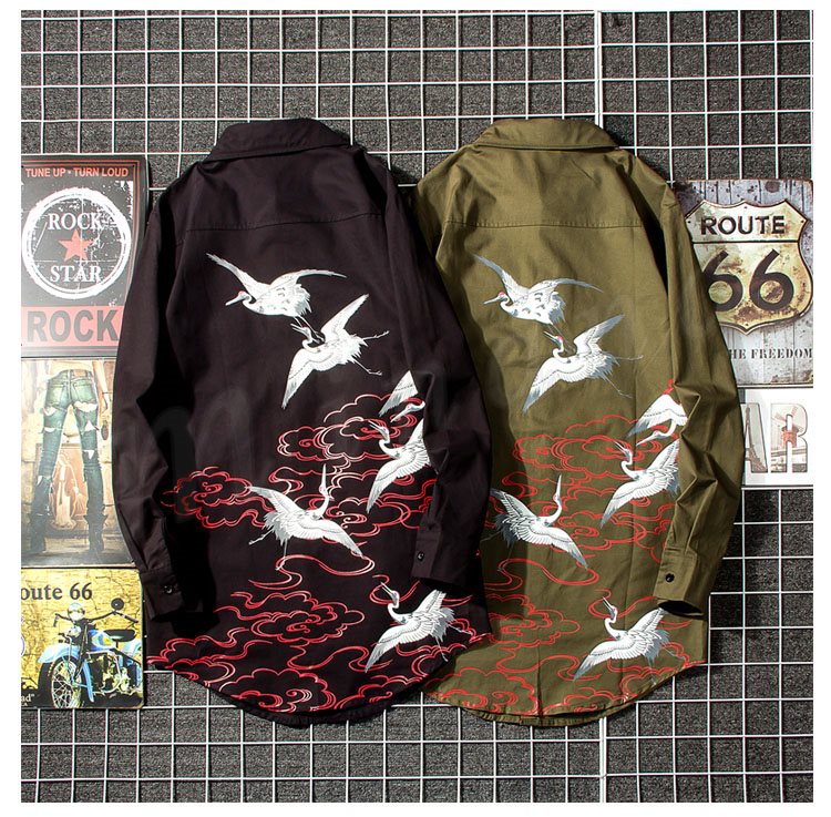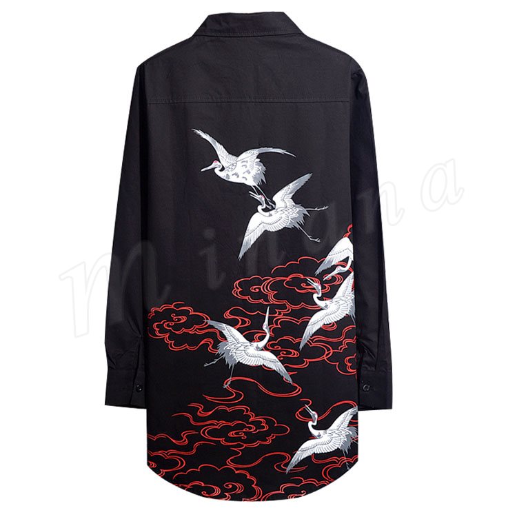 2018秋新作 ロングシャツ メンズ 長袖シャツ 鶴柄 プリント シャツコート カジュアルシャツ かっこいい トップス 春秋 薄手 おしゃれ