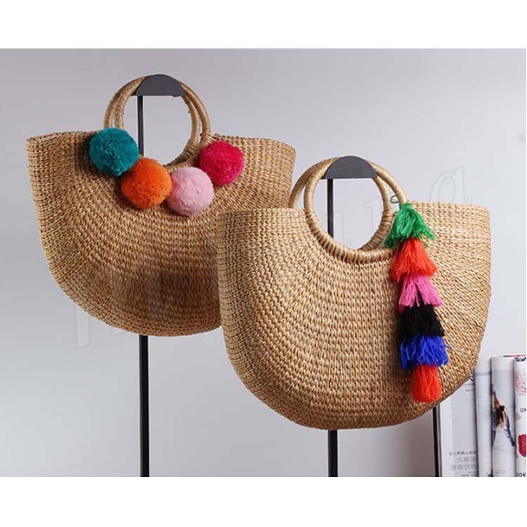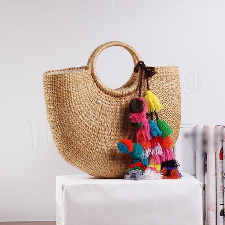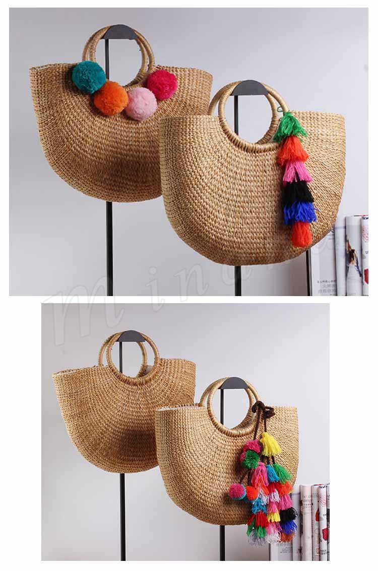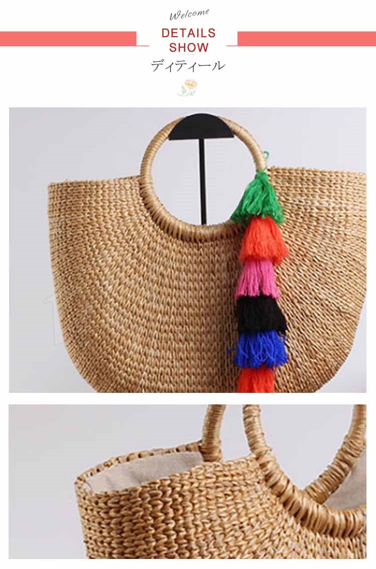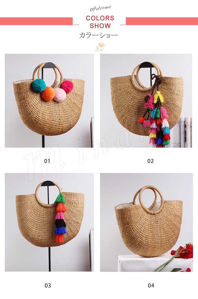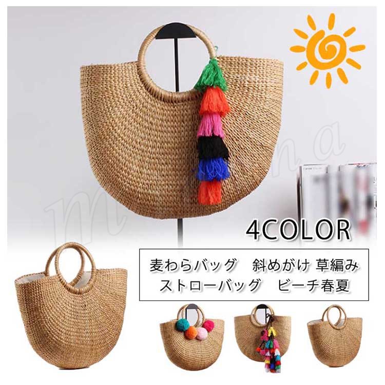 ビーチ春夏♪編みバッグ 手編みバッグ 草編み レディース 草編みバッグ かわいい 夏 肩掛け 海外旅行 海 ビーチ 旅行 麦わら ポンポン付き フリン