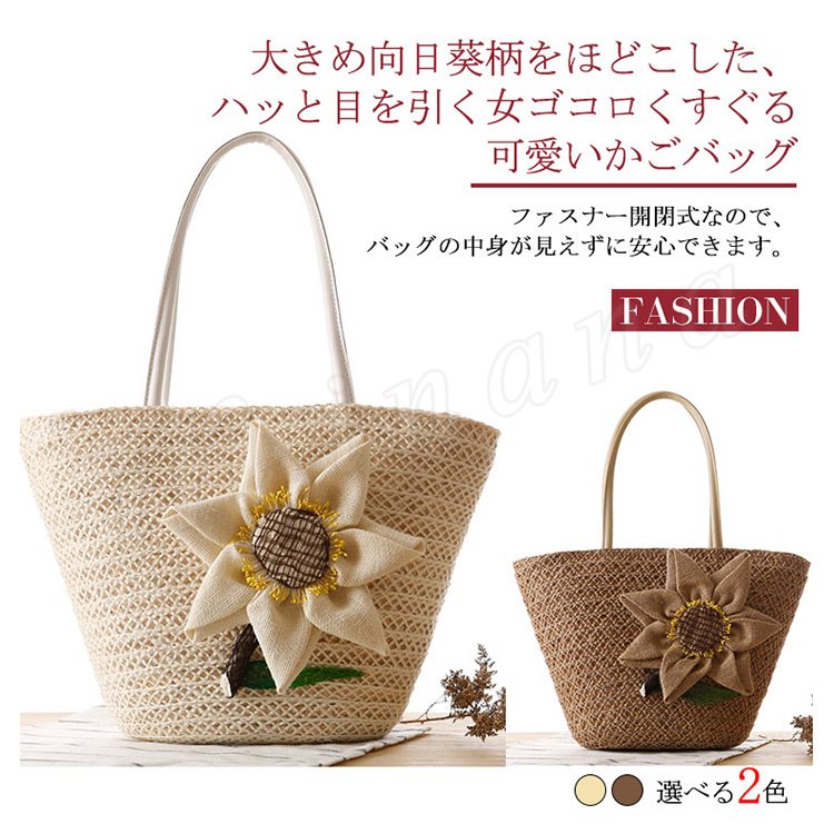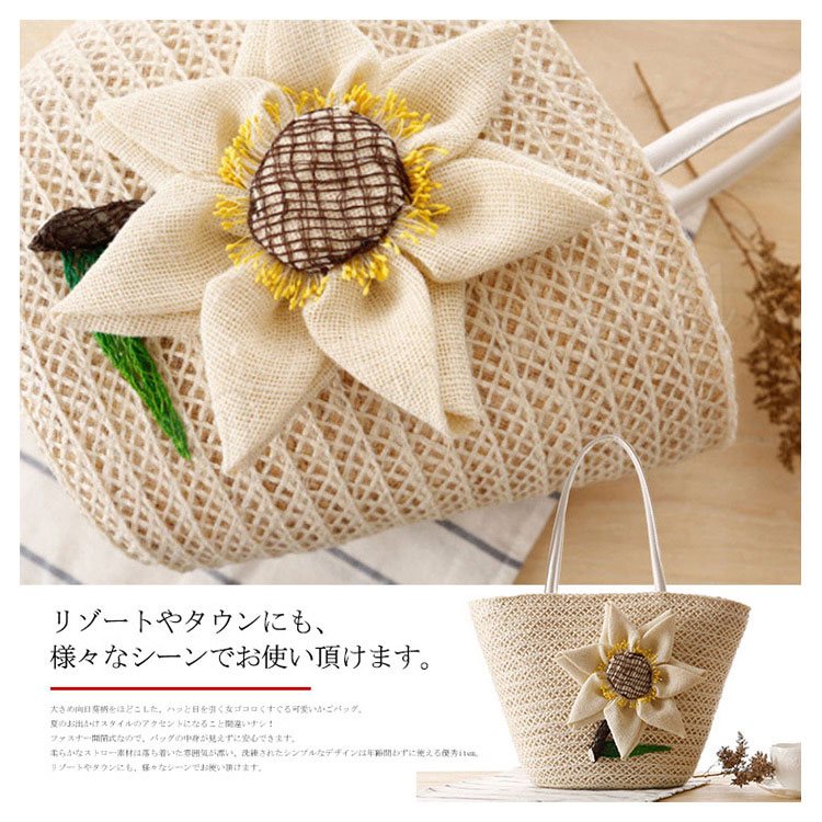 向日葵フラワーモチーフで大人可愛い。フラワーモチーフ かごバッグ トートバッグ 大容量 大きめ カゴ バッグ 軽量 カジュアル ナチュラル 向日葵 柔