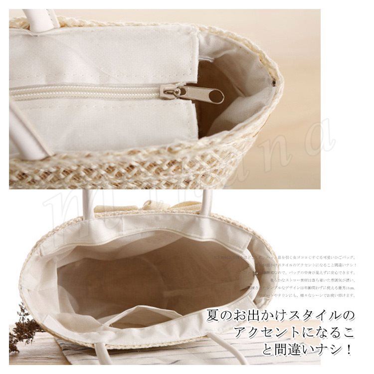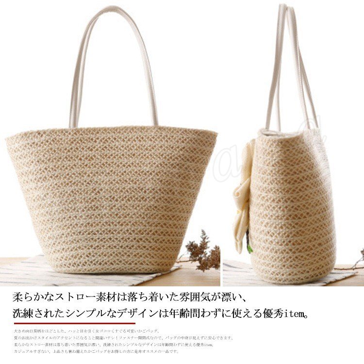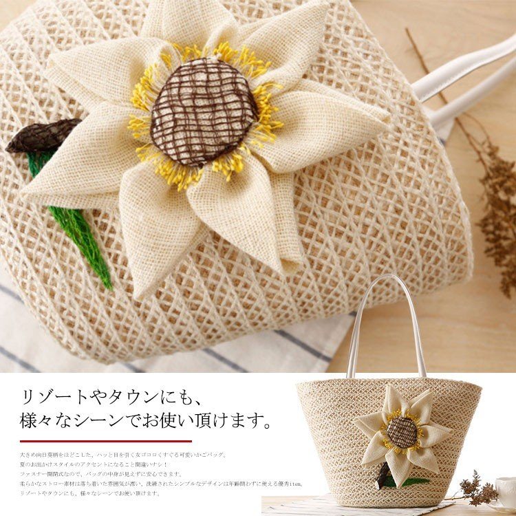 | 大きめ向日葵柄をほどこした、ハッと目を引く女ゴコロくすぐる可愛いかごバッグ。 夏のお出かけスタイルのアクセントになること間違いナシ! ファスナー開閉式なので、バッグの中身が見えずに安心できます。 柔らかなストロー素材は落ち着いた雰囲気が漂い、洗練されたシンプルなデザインは年齢問わずに使える優秀item。 リゾートやタウンにも、様々なシーンでお使い頂けます。 カジュアルすぎない、上品さも兼ね備えたかごバッグをお探しの方に是非オススメの一品です。 | |