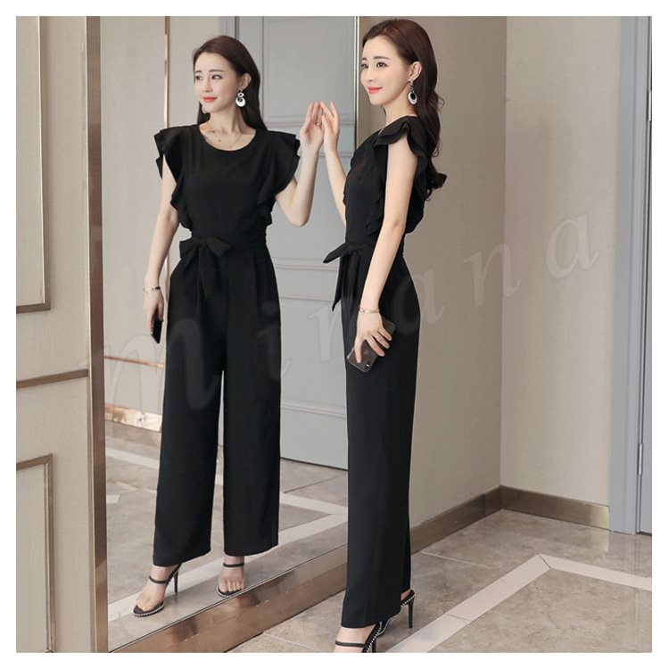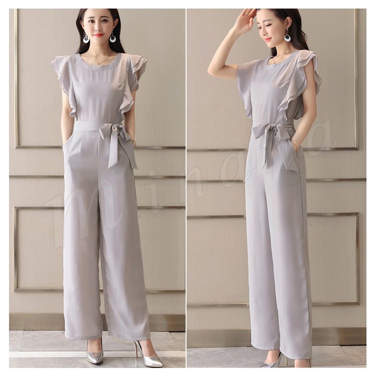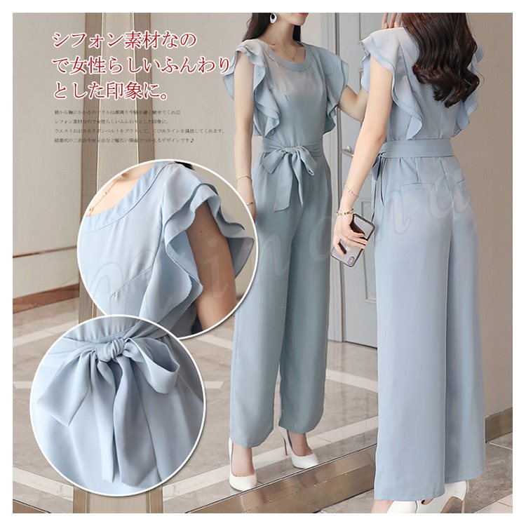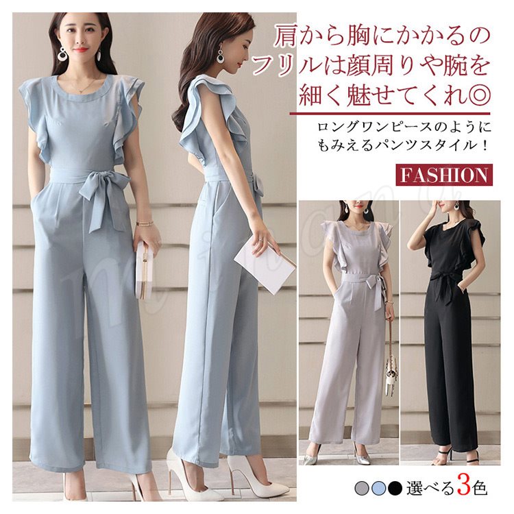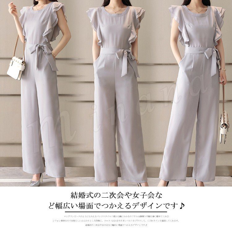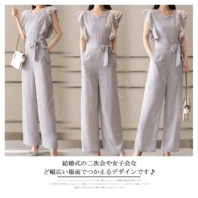 | ロングワンピースのようにもみえるパンツスタイル! 肩から胸にかかるのフリルは顔周りや腕を細く魅せてくれ◎ シフォン素材なので女性らしいふんわりとした印象に。 ウエストおおきめリボンベルトをプラスして、くびれラインを演出してくれます。 結婚式の二次会や女子会など幅広い場面でつかえるデザインです♪ | |