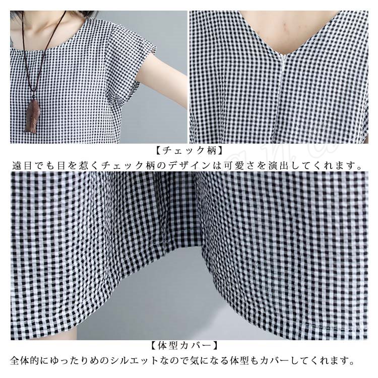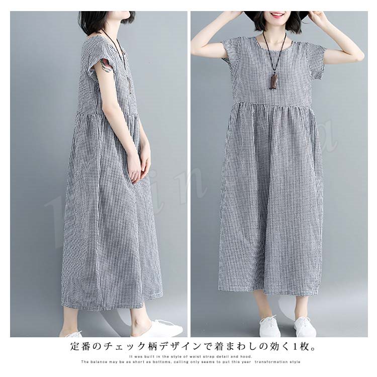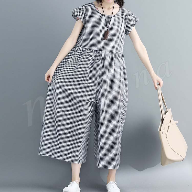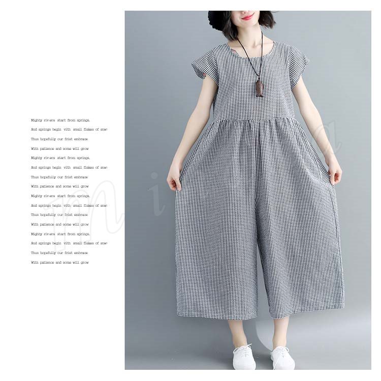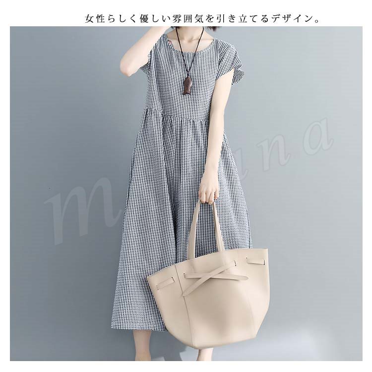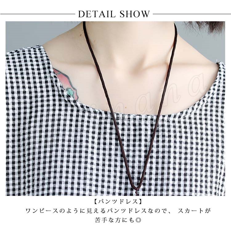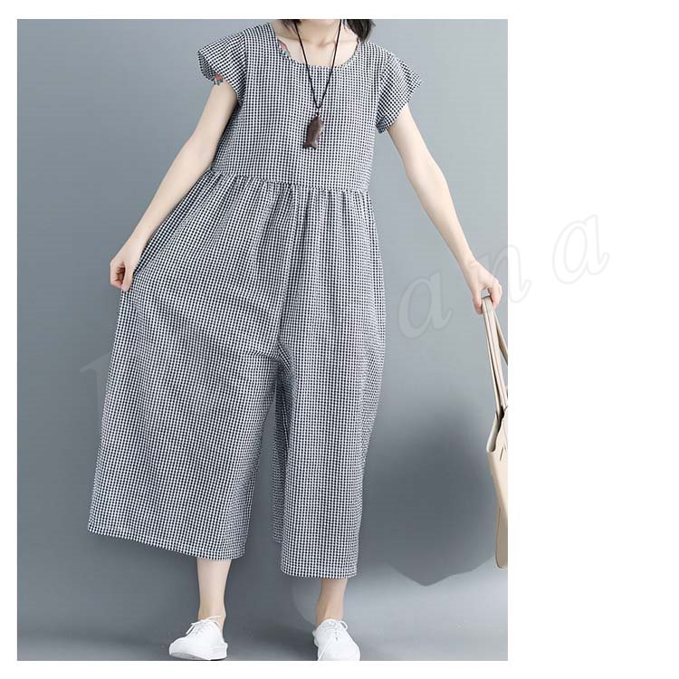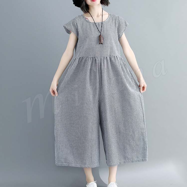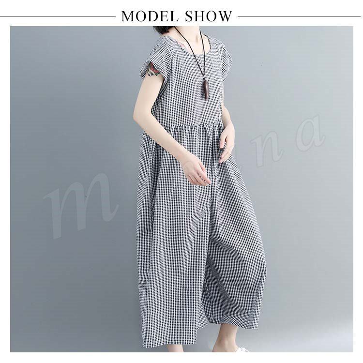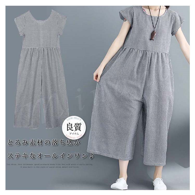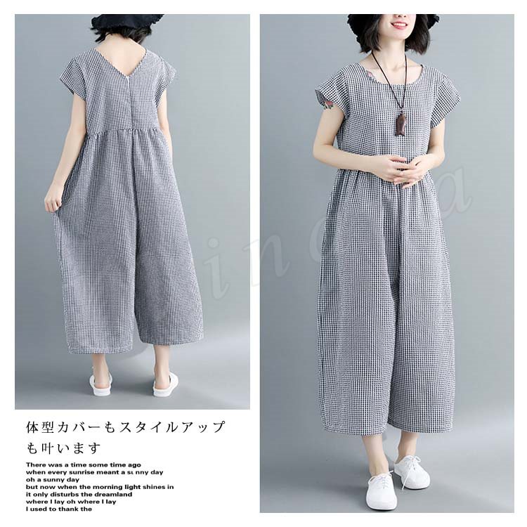[チェック柄]オールインワン サロペット レディース 格子柄 半袖 マキシ丈 春夏 綿麻 ワイドパンツ 体型カバー 可愛い 女子 大きいサイズ