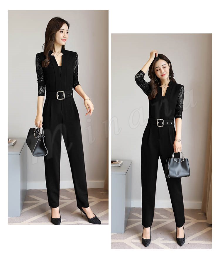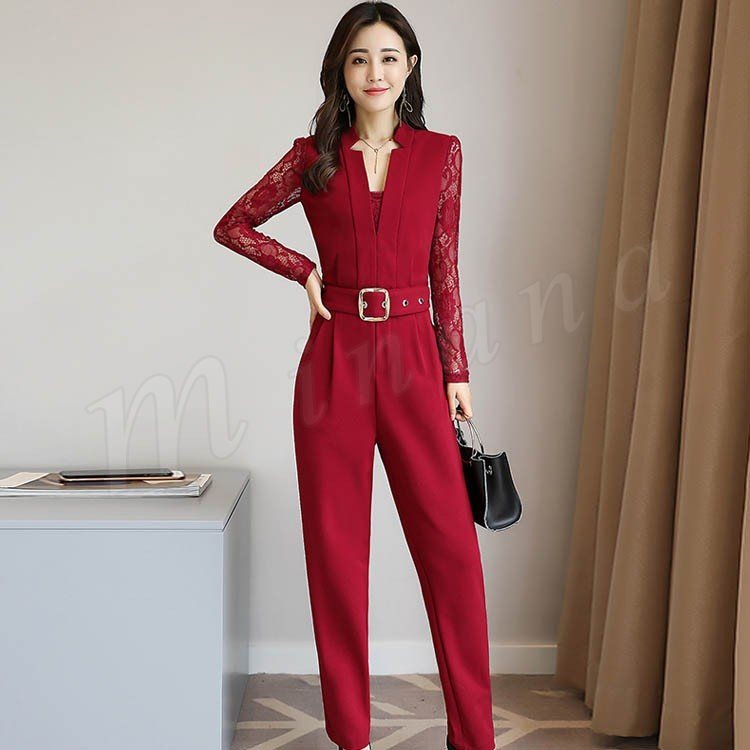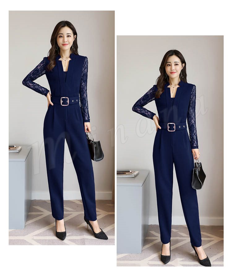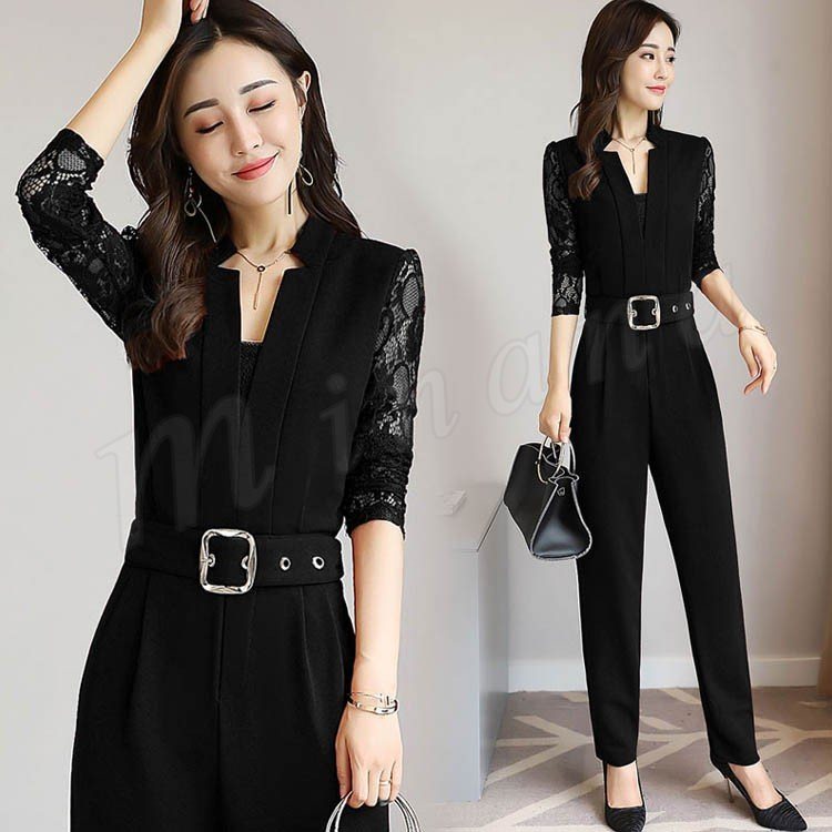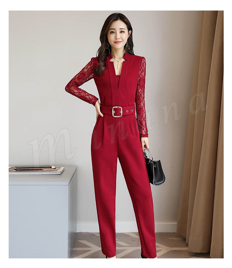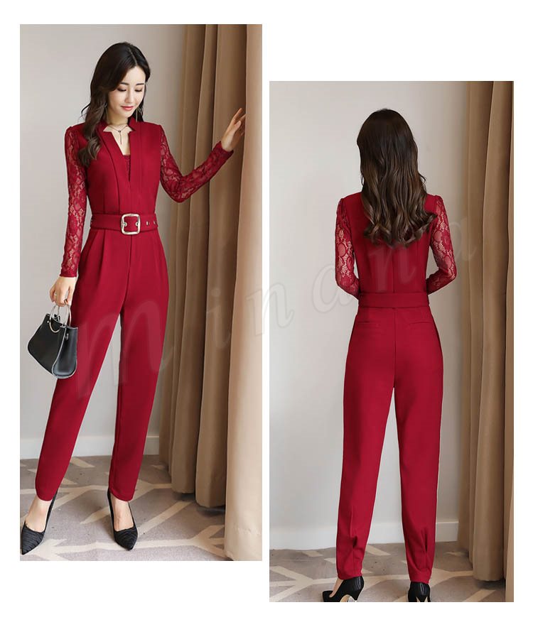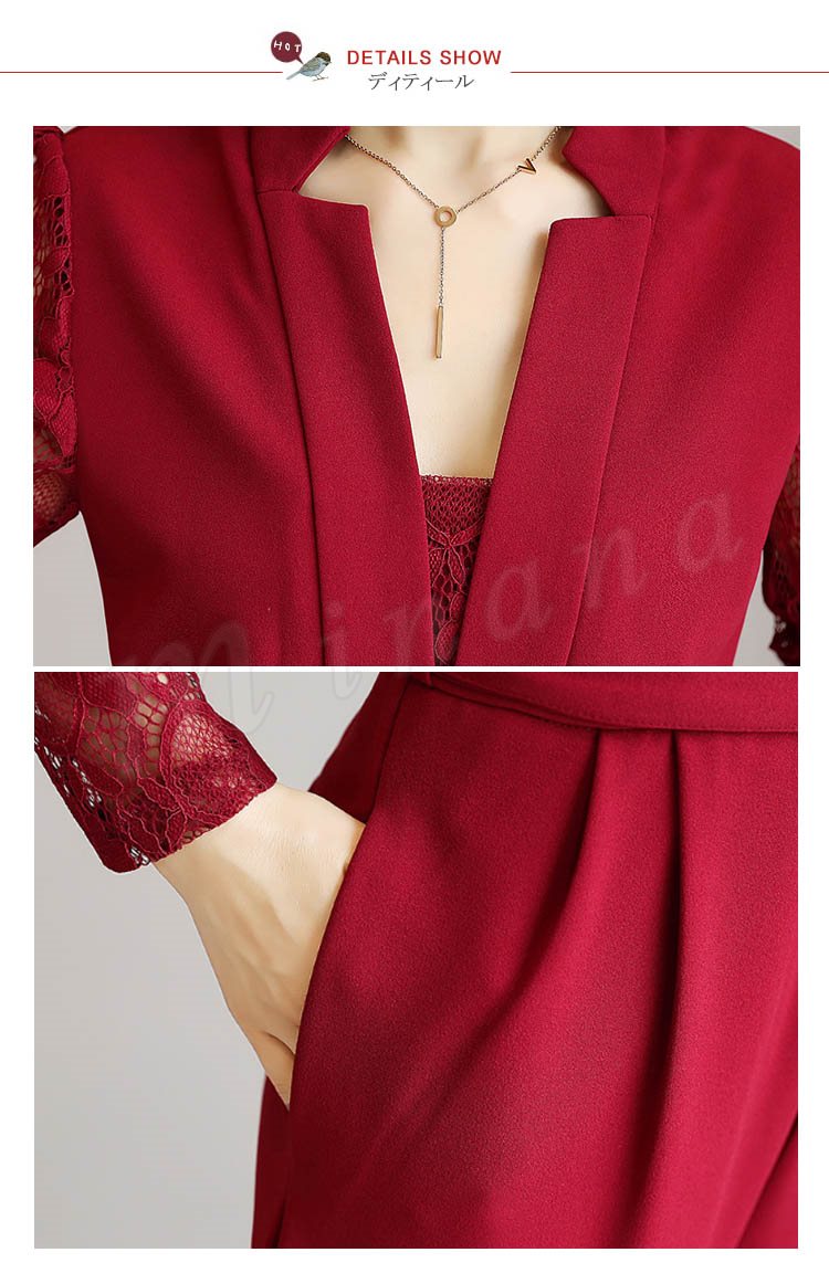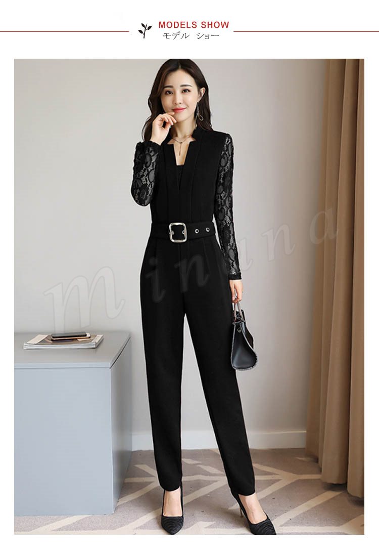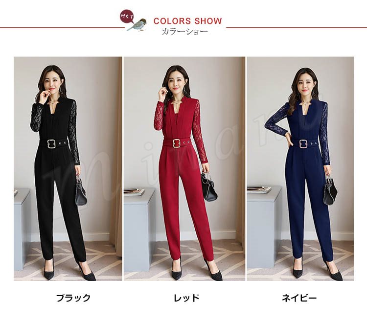 レディース オールインワン パンツドレス 長袖 レース付き 春秋 パーティードレス オーバーオール Vネック 通勤 入園式 結婚式 二次会 お洒落