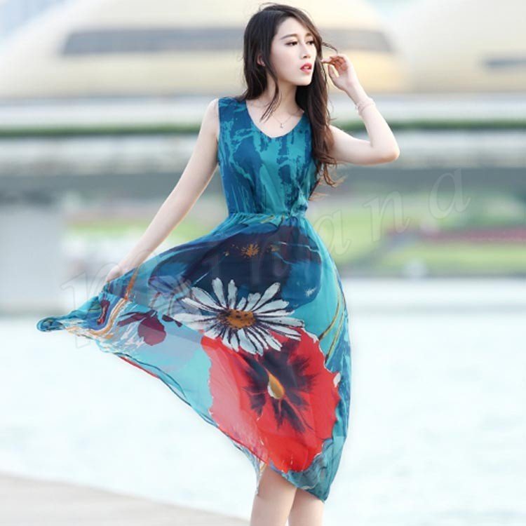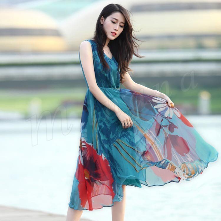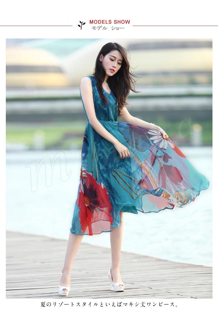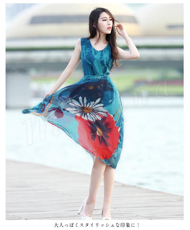 リゾートマキシワンピース リゾートワンピース ハワイ ワンピ ロング丈 花柄 シフォン ノースリーブ リゾートワンピース ビーチ 海 ボヘミアン