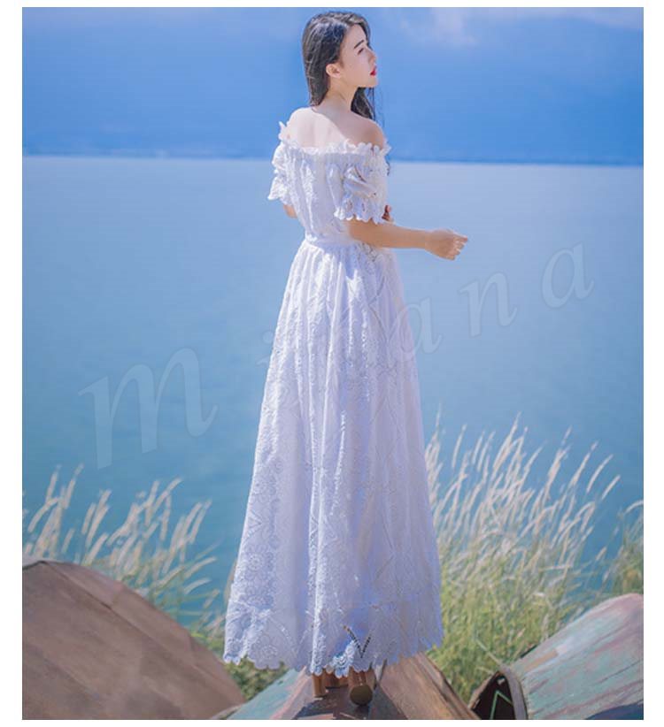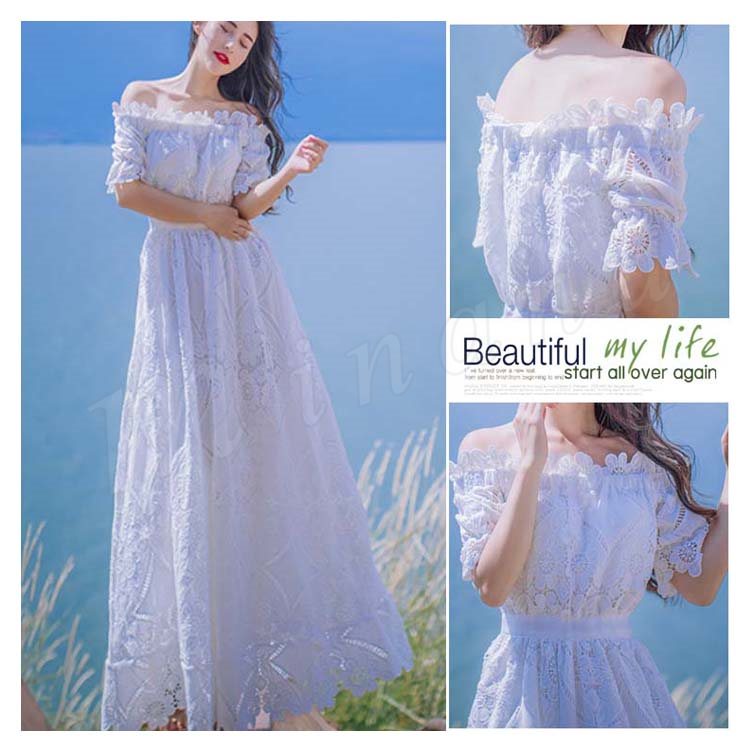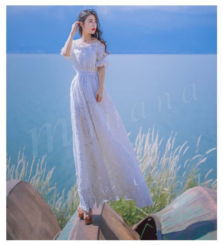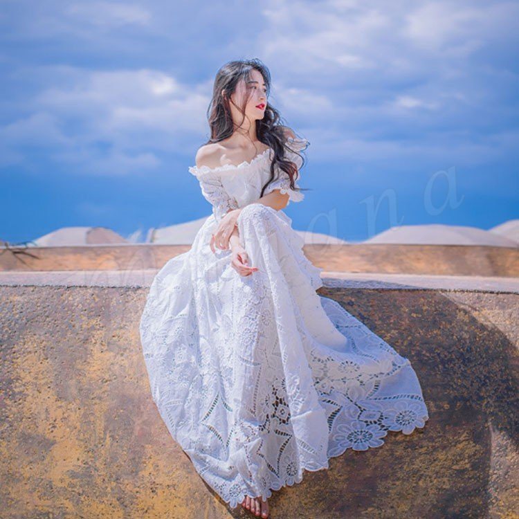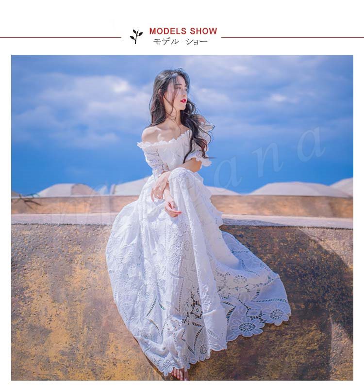 2018新作 レディースロングワンピース オフショルダー 森ガール 旅行/海/ビーチ/撮影/舞台/パーティー 透かし彫り
