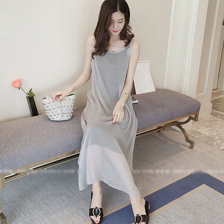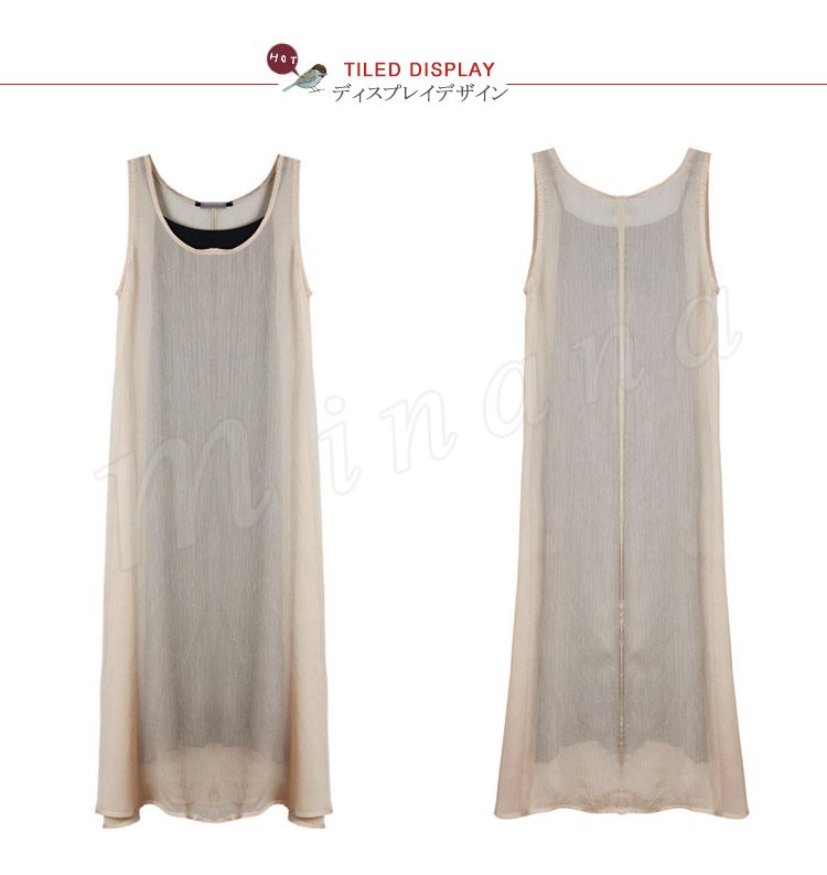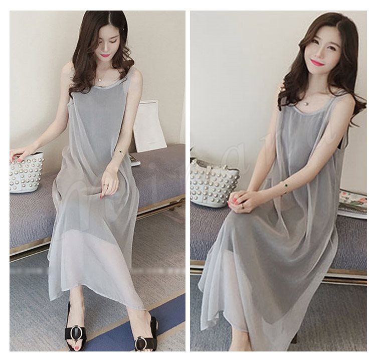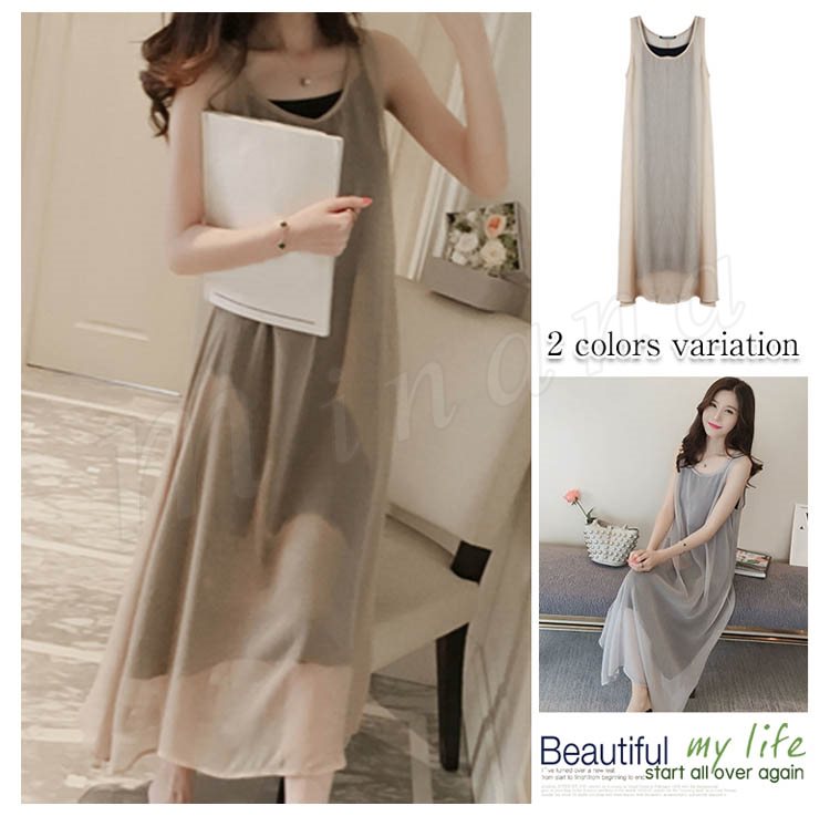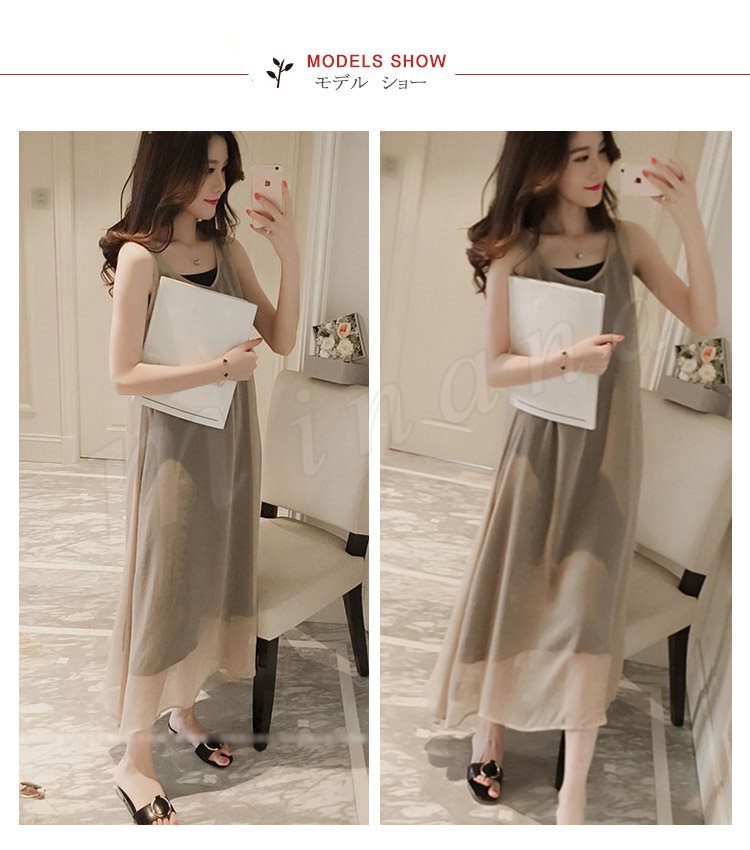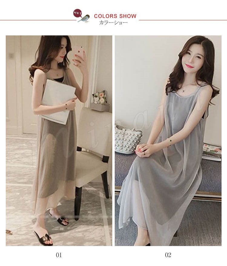 ワンピース レディース きれいめ 夏 シフォンワンピース ノースリーブ キャミソールインナ付き 2点セット 無地 マキシワンピー ロング丈 オシャレ