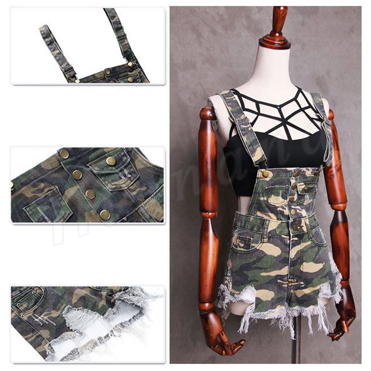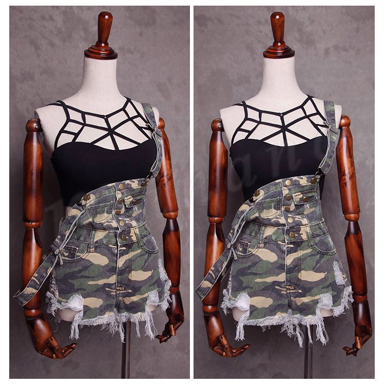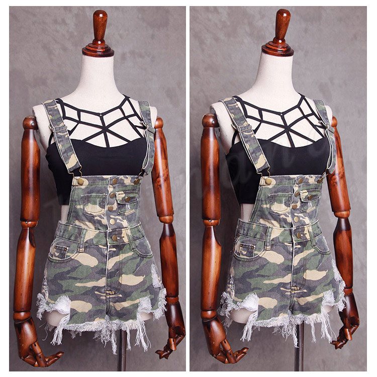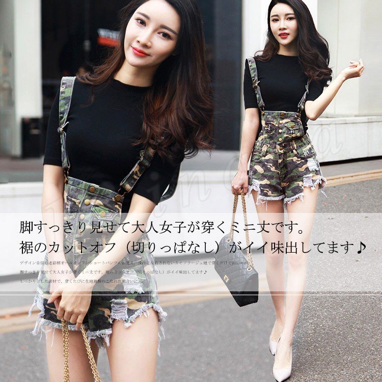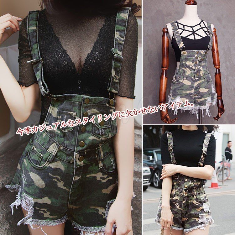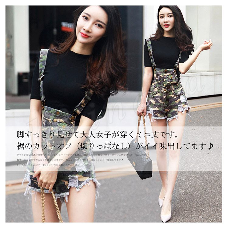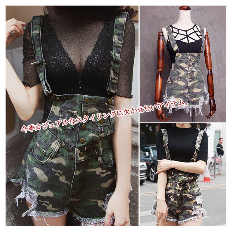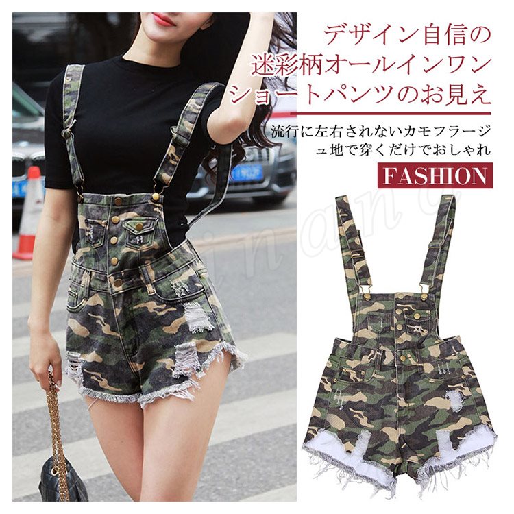 美脚へ導く究極の1本!迷彩柄オールインワンショートパンツ サロペット ショートパンツ 迷彩柄 カモフラージュ 切りっ放し カットオフ オールイ