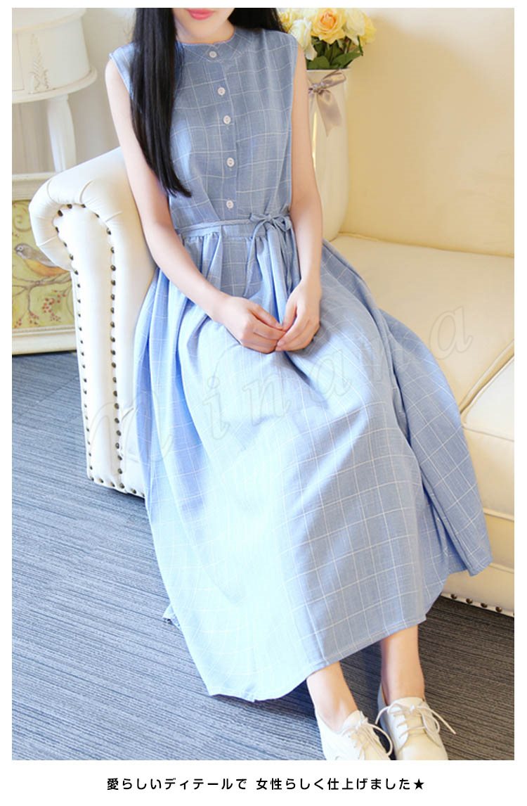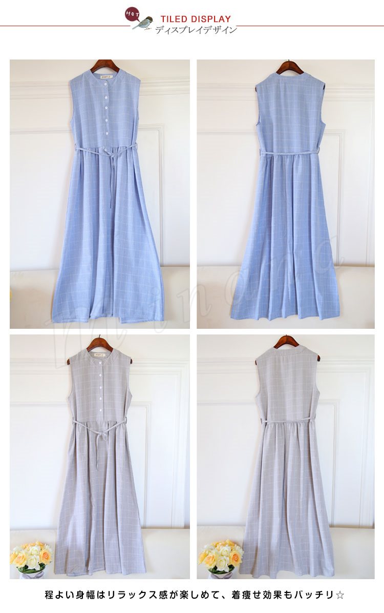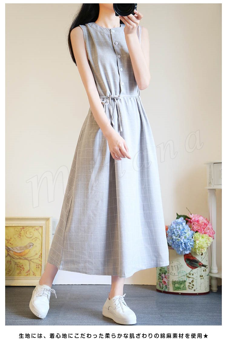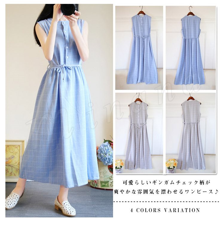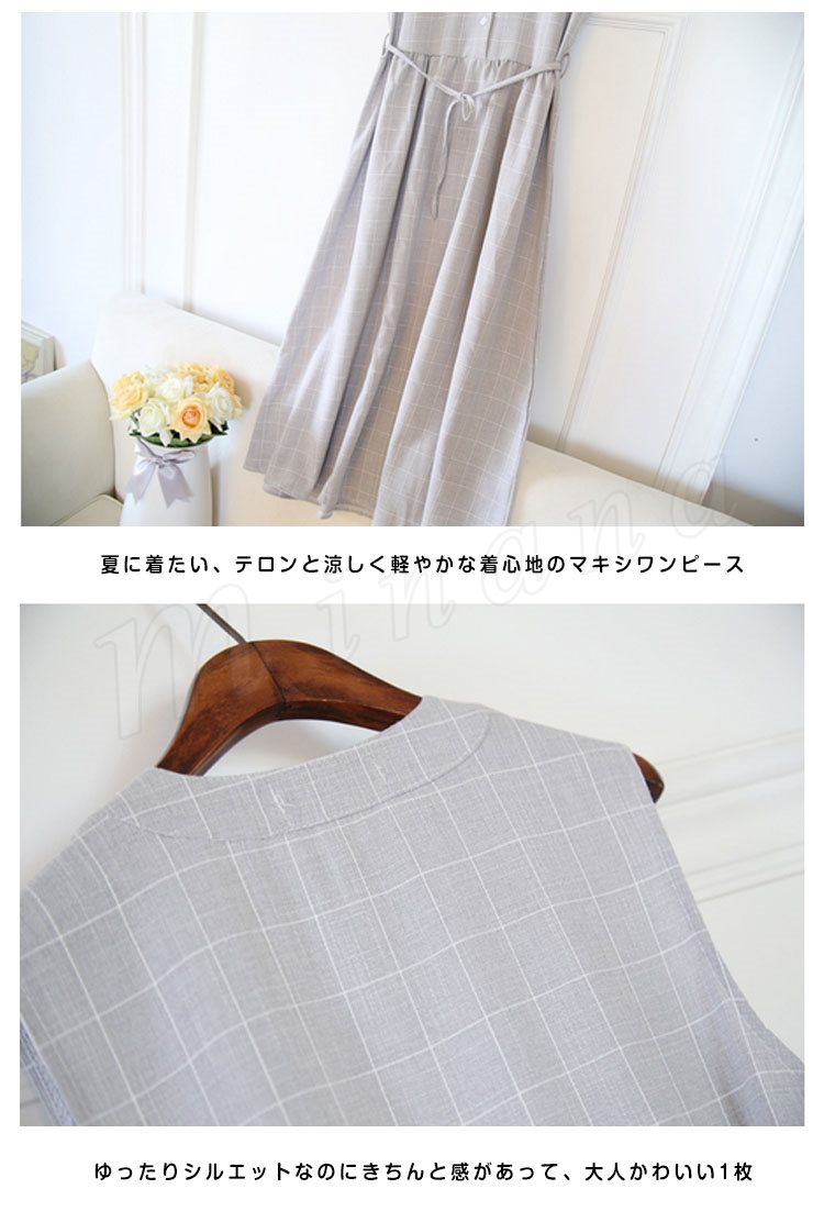 夏ワンピース/ギンガムチェックワンピース/マキシワンピース/ロングワンピース/レディース/綿麻ワンピース/きれいめ/マキシ丈/ロング丈/ゆった