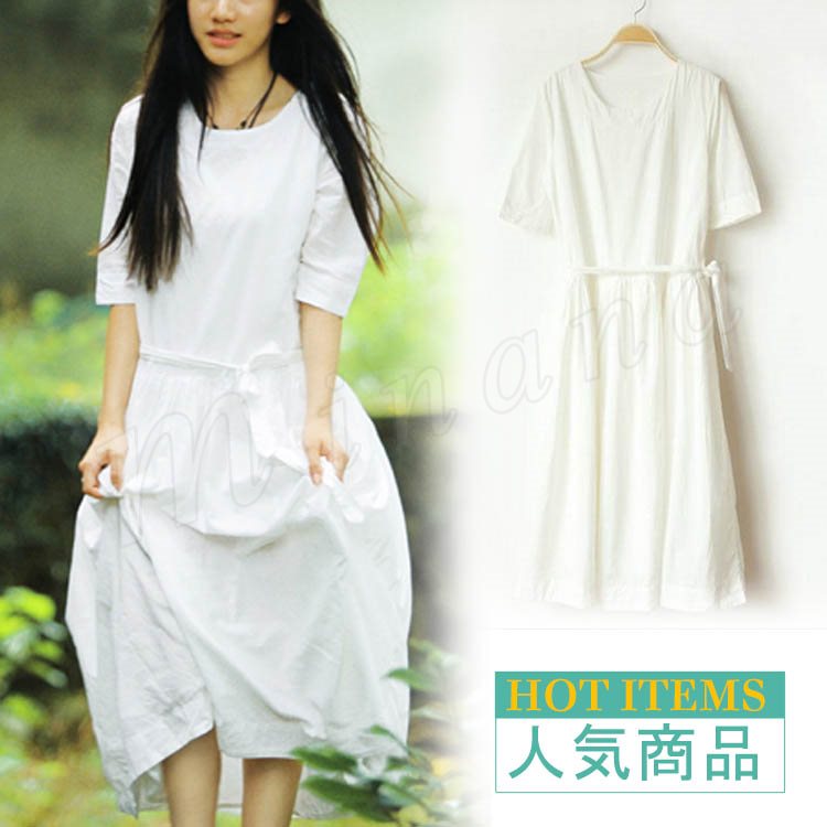 送料無料夏ワンピース 綿麻 ドレス 半袖ワンピース チュニック リネンワンピース 森ガール ロング丈 ベルト付き マキシ丈 大きいサイズ 無地 シンプ