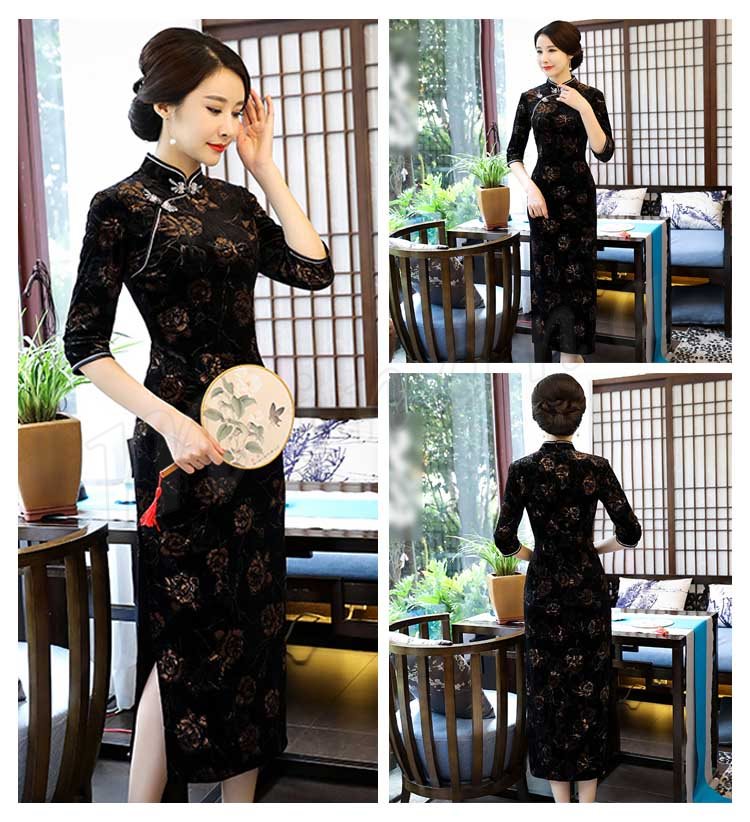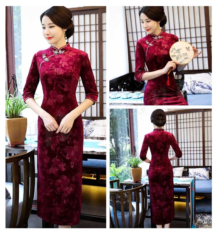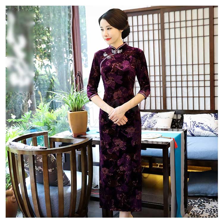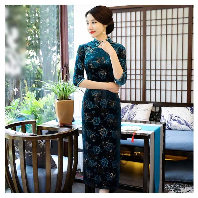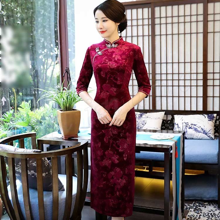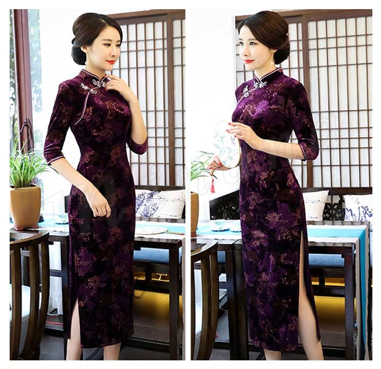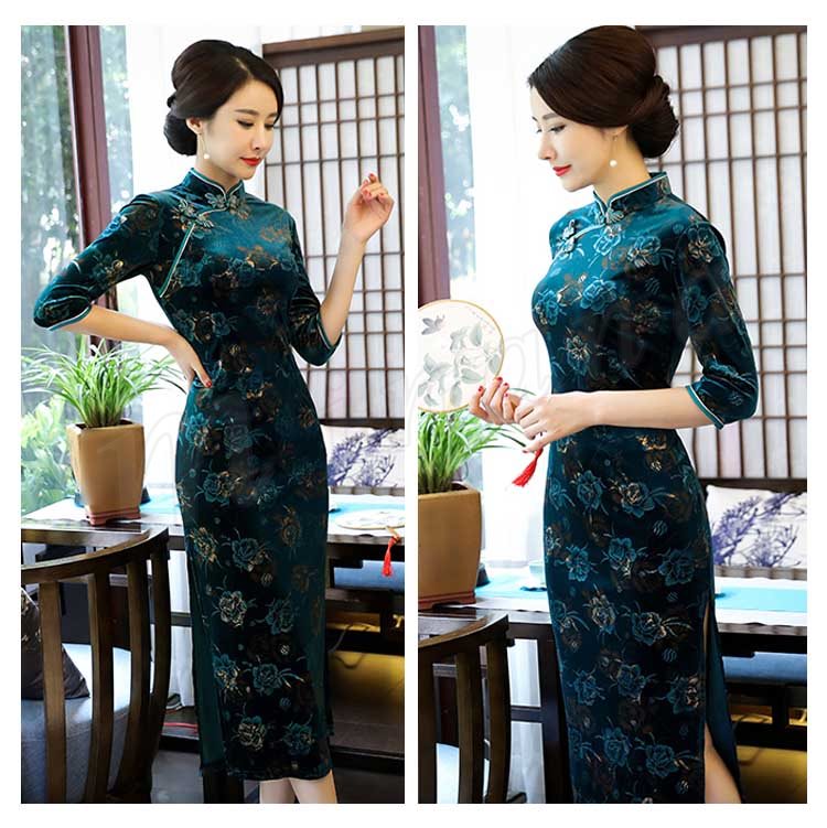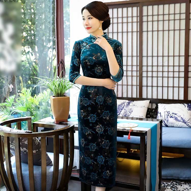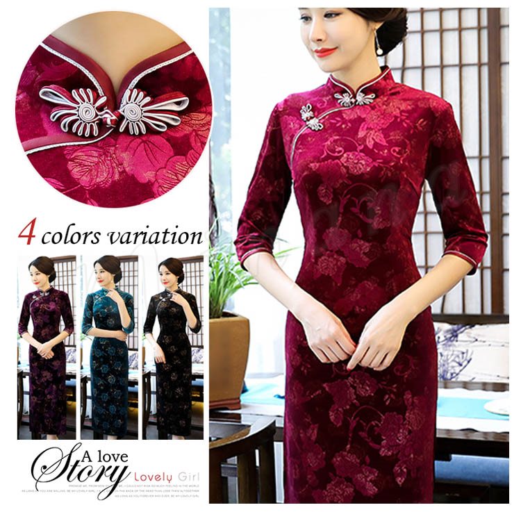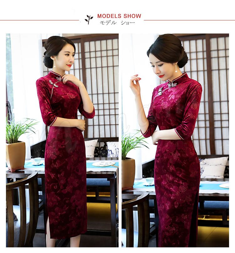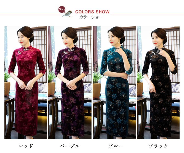 2018春夏新作 チャイナドレス レディース ロング丈 ワンピース 七分袖 花柄 エレガント きれいめ ベルベット 結婚式 二次会 パーティー お