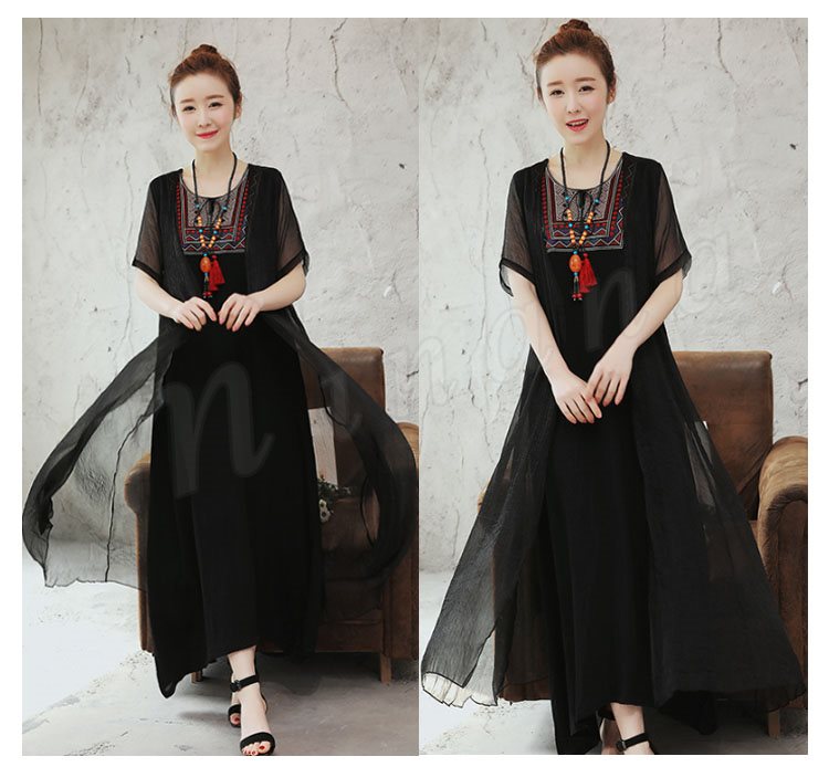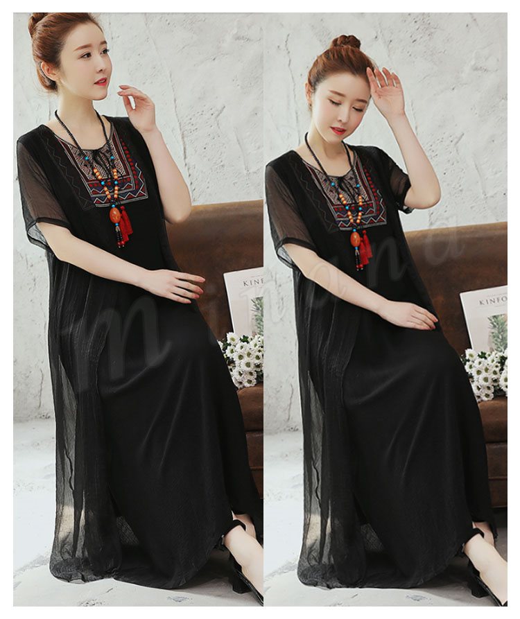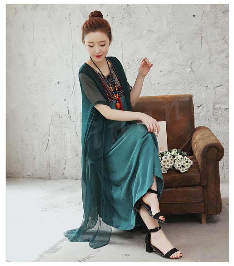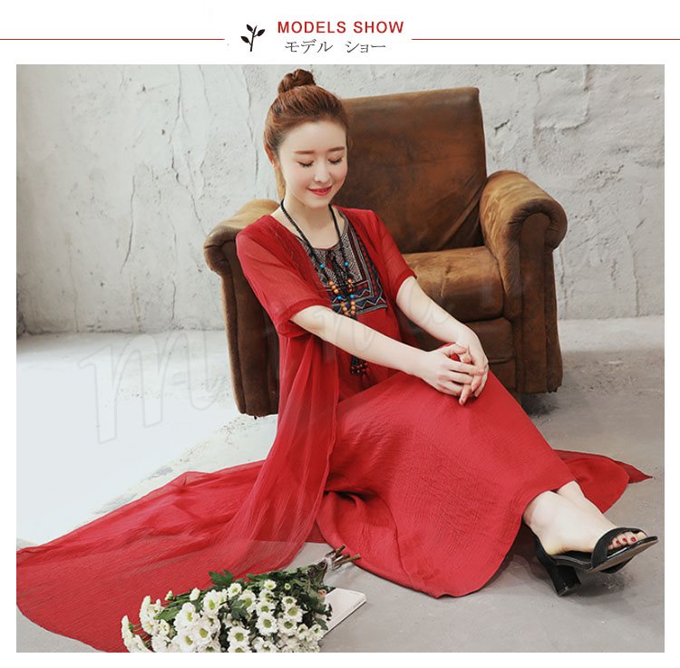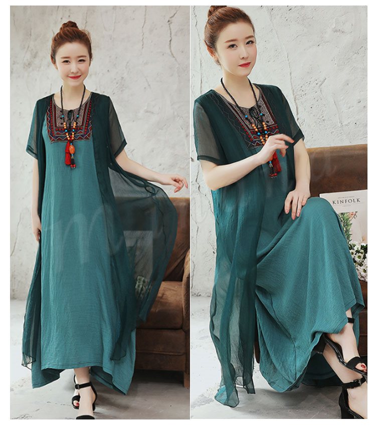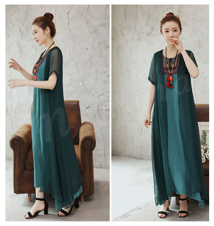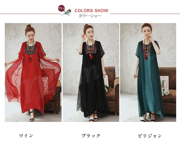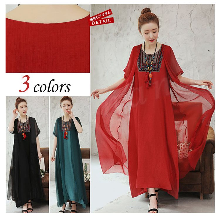 2018夏新作 チャイナドレス風ワンピース レディース 半袖 綿麻 ロング丈 マキシ丈 刺繍 中国風 偽2点 エレガント 体型カバー きれいめ おしゃ
