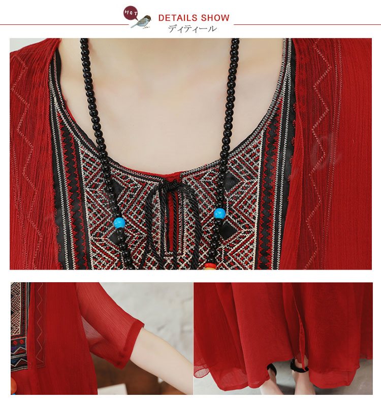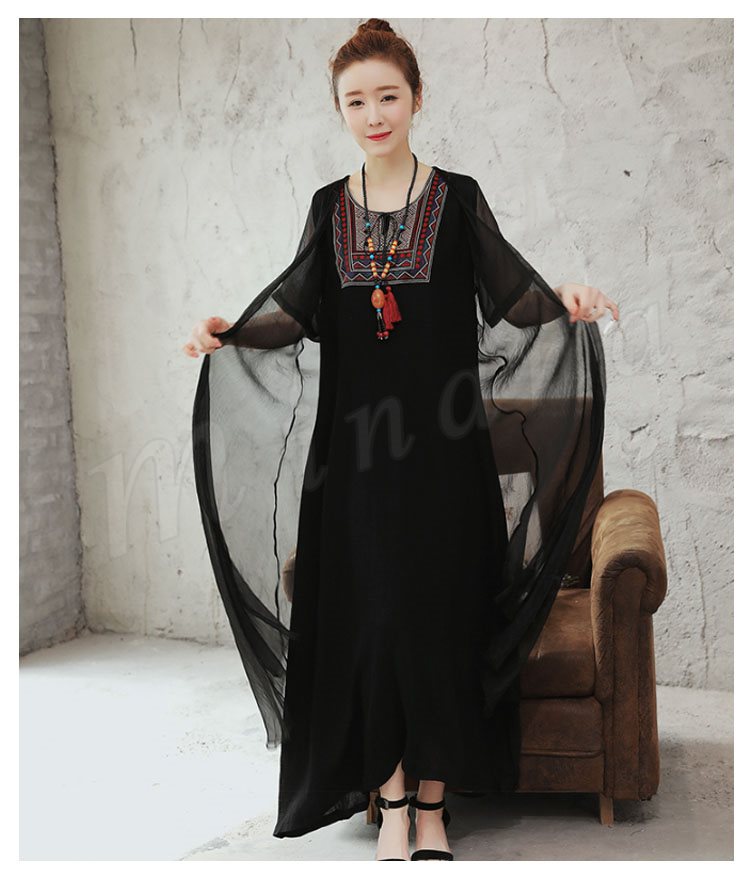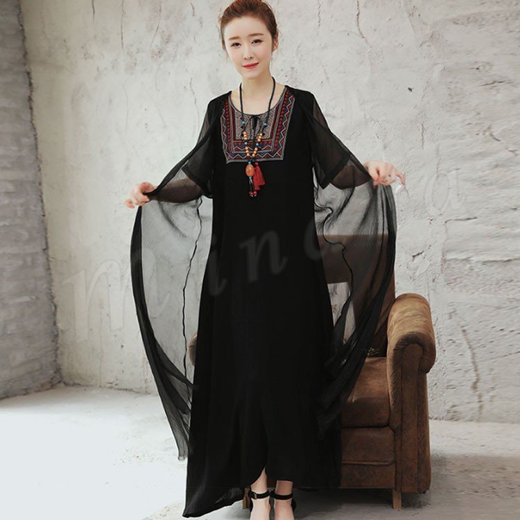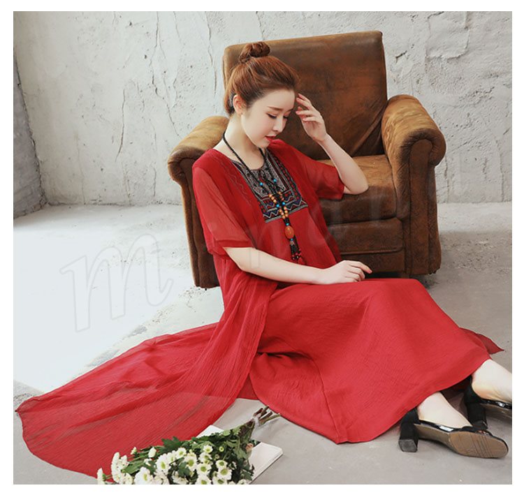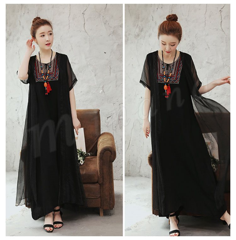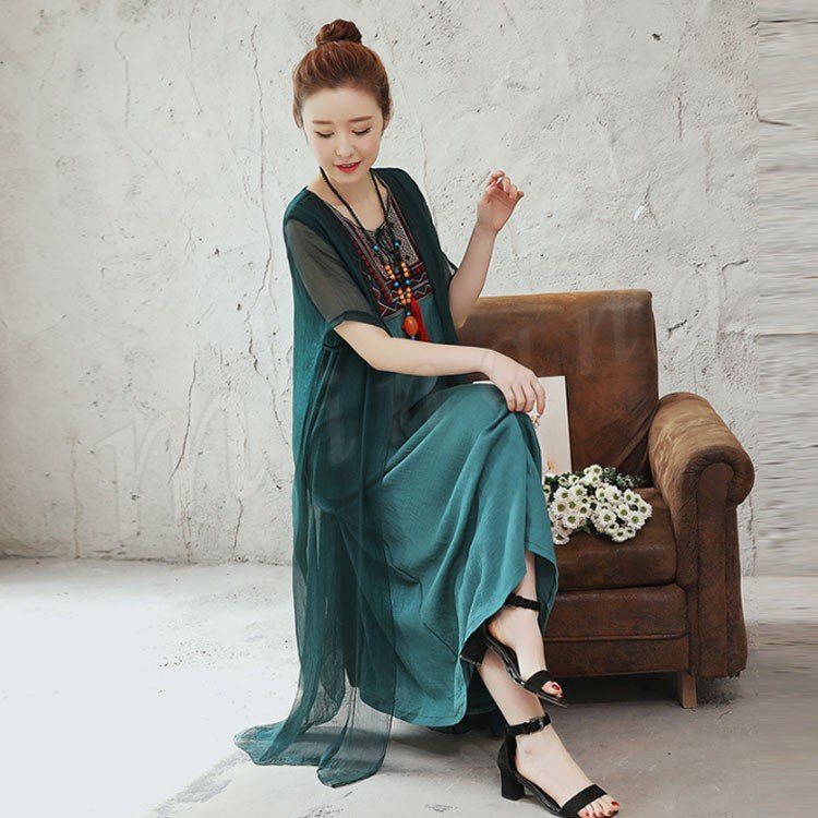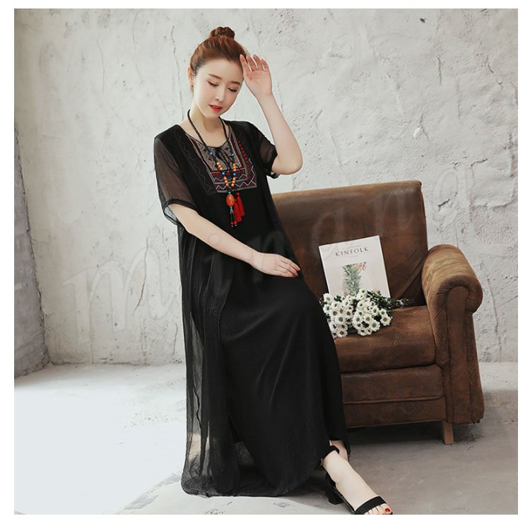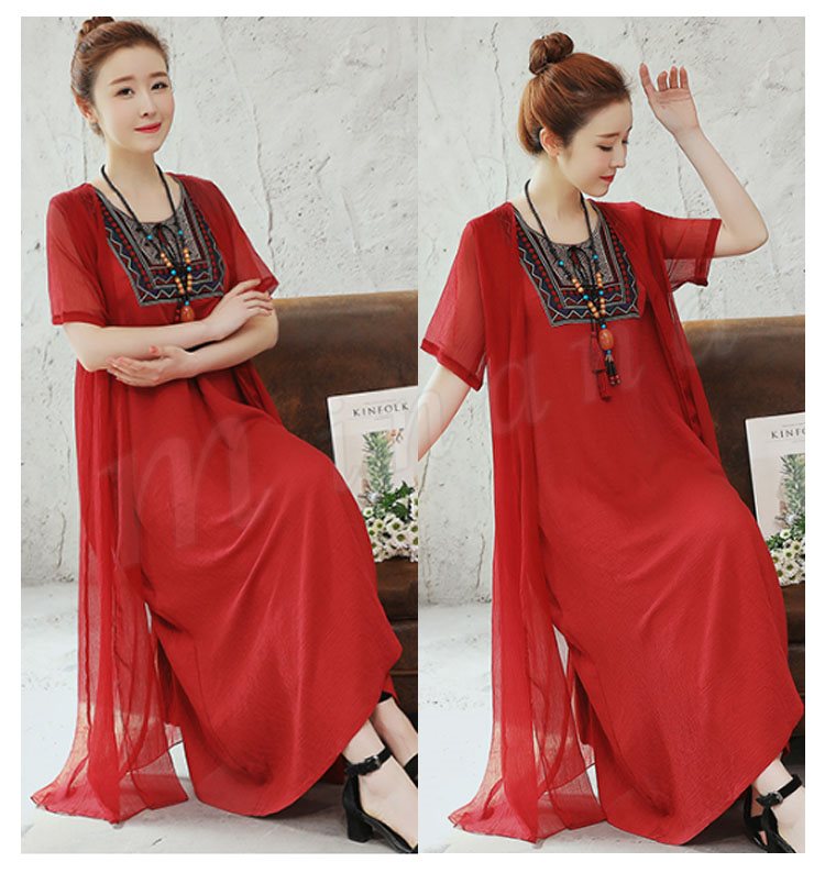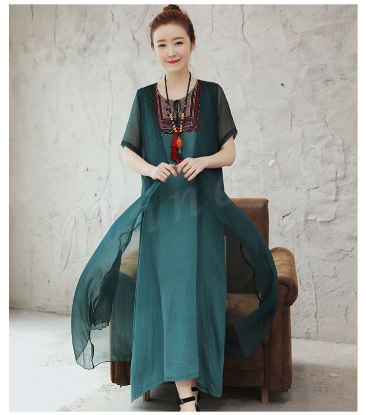 2018夏新作 チャイナドレス風ワンピース レディース 半袖 綿麻 ロング丈 マキシ丈 刺繍 中国風 偽2点 エレガント 体型カバー きれいめ おしゃ