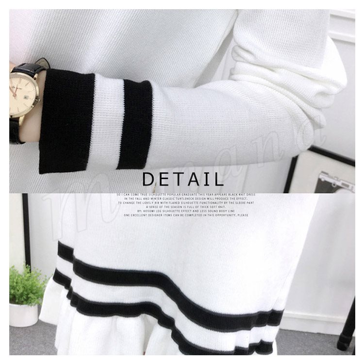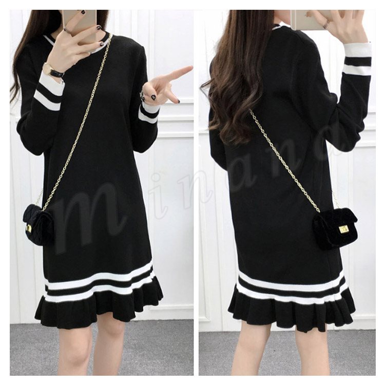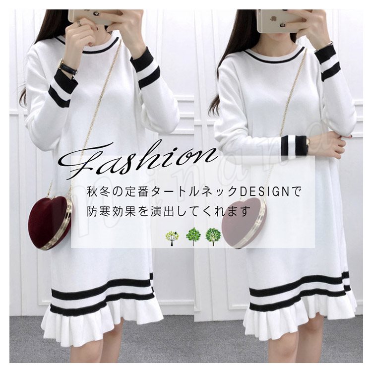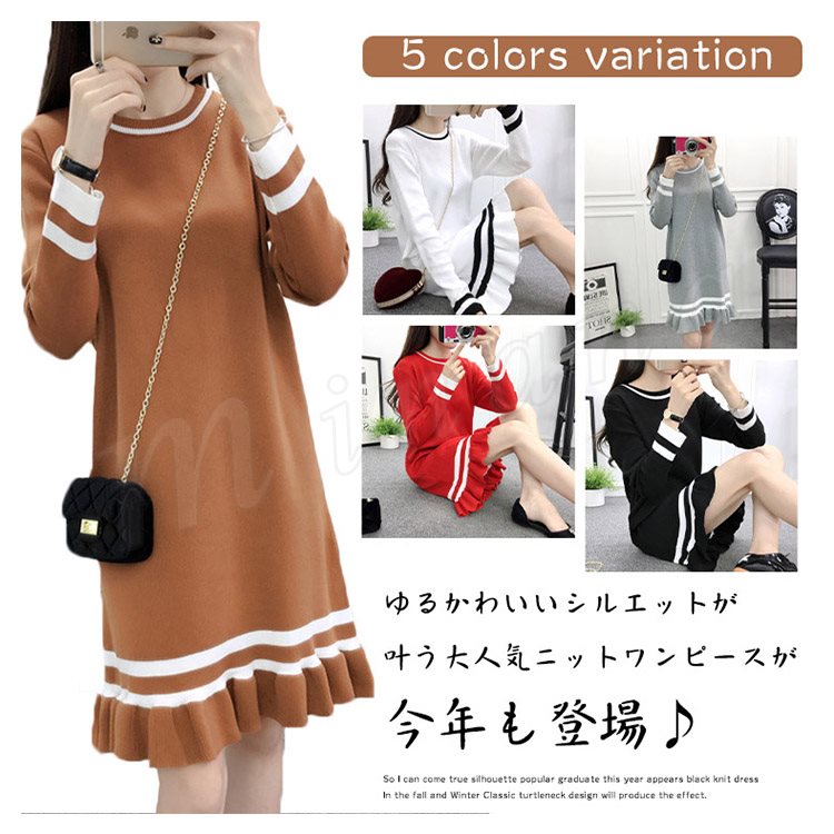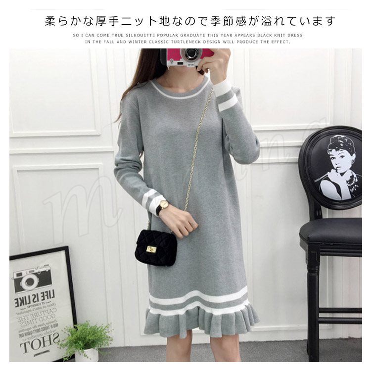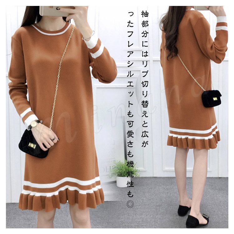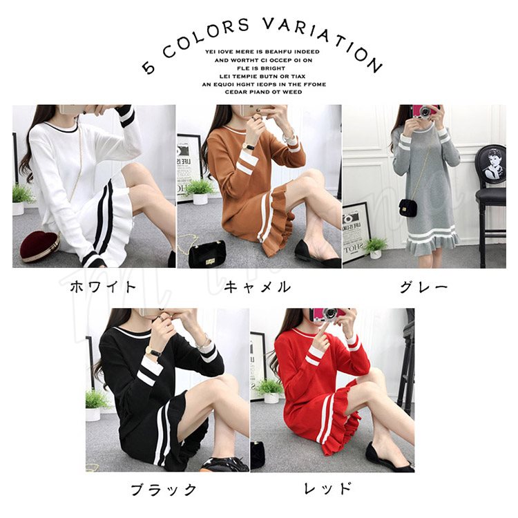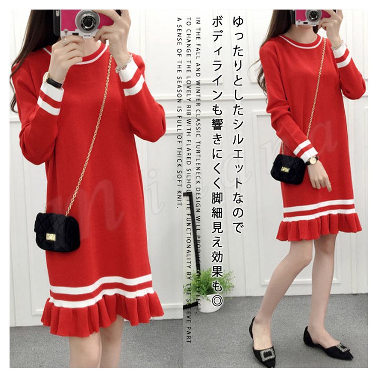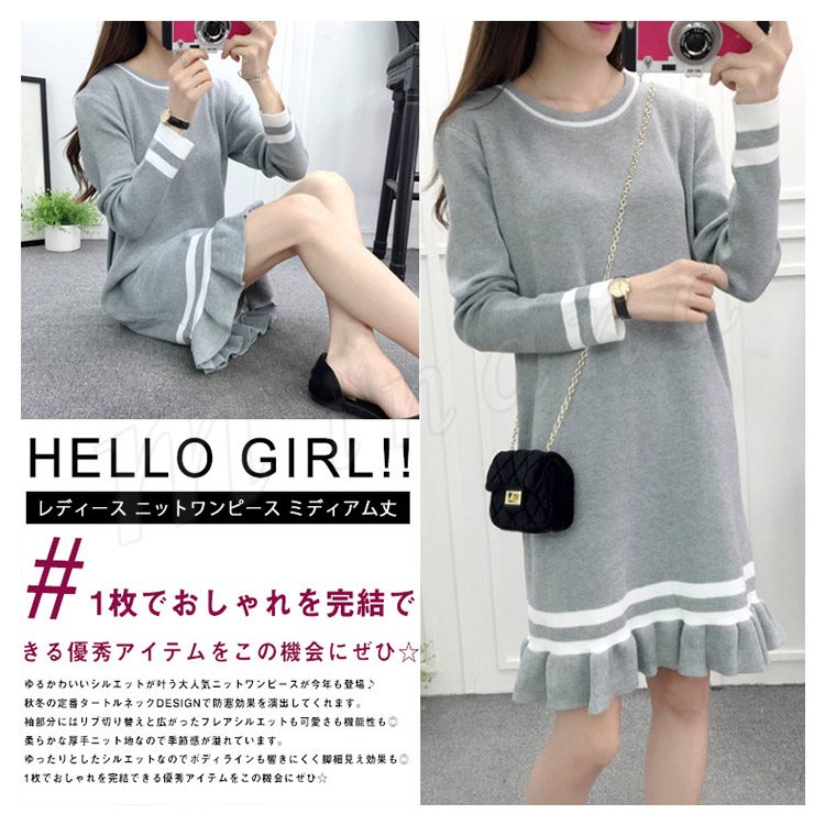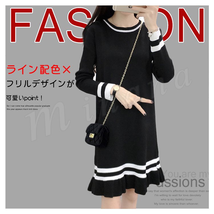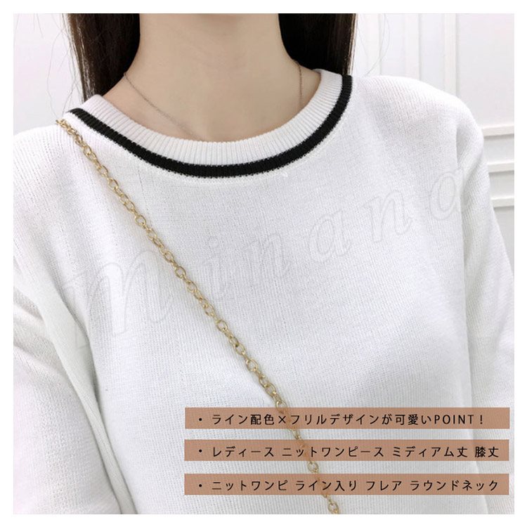 ライン配色×フリルデザインが可愛いpoint!レディース ニットワンピース ミディアム丈 膝丈 ワンピース ニットワンピ ライン入り フレア